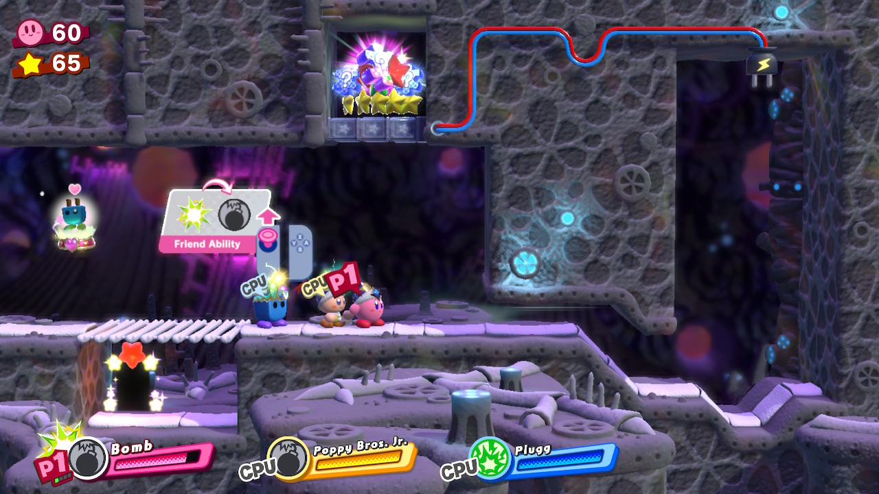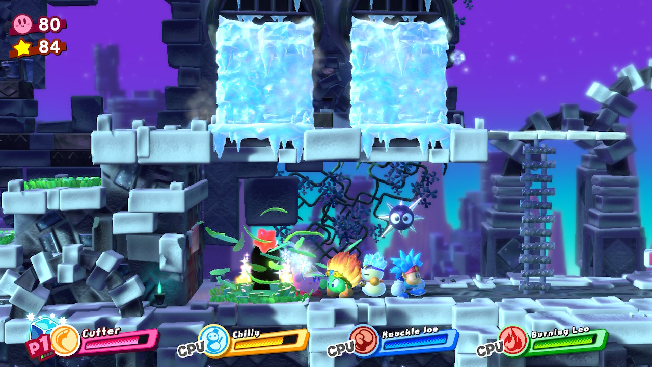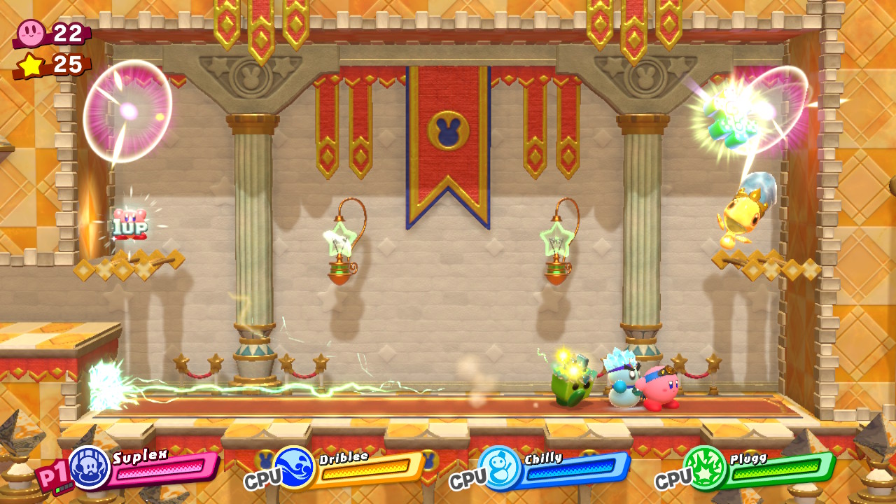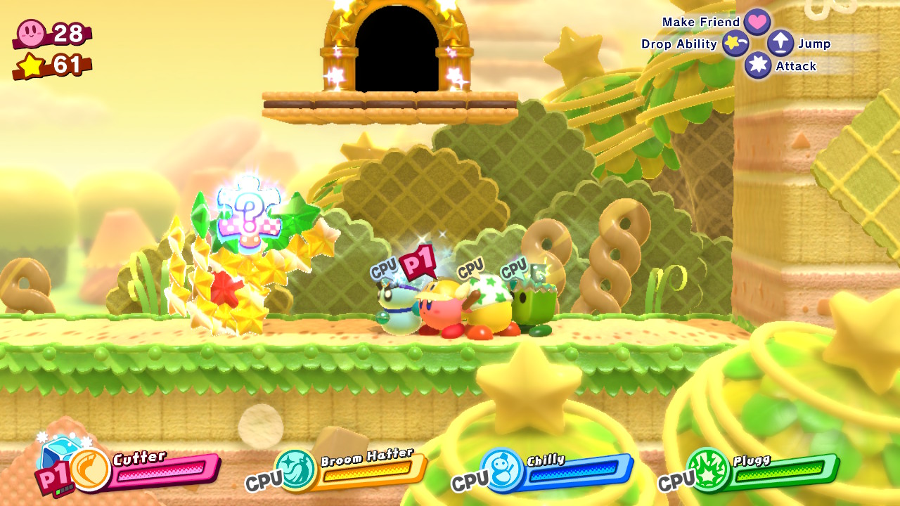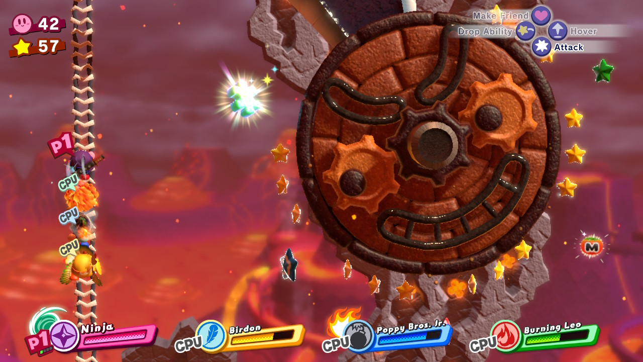 - 1-5: Clash at Castle Dedede – In the middle of the level, use the Friend Throw ability (Fighter / Suplex + Friend) and smash the metal block on the right when you reach an arena with spawning enemies.