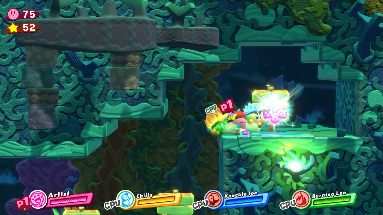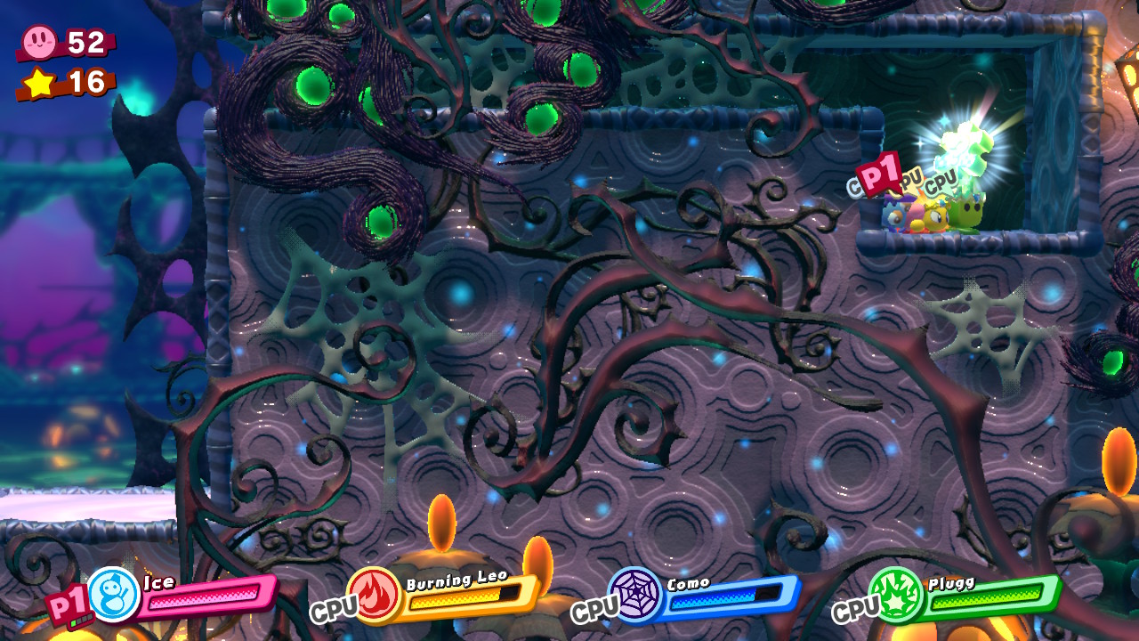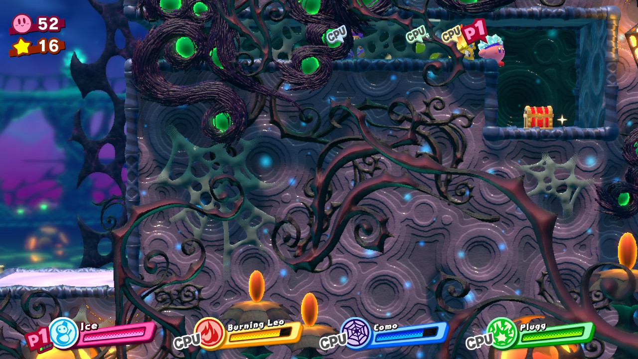 - 2-EX: Inside Islands – In the long, high column room, stop when you see two huge spike enemies on the left. Grab a Spider Copy Ability and hold up to launch a friend through the spikes. Your friend will reveal a chest with the picture piece.