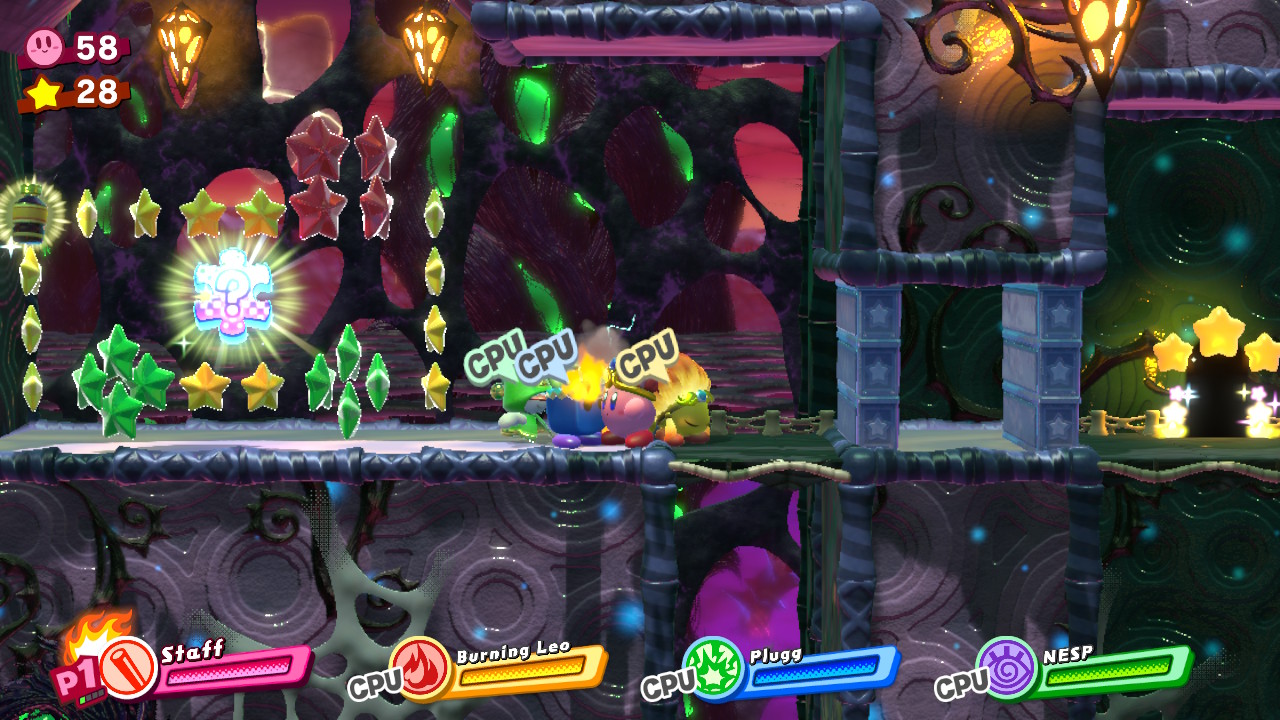 - 4-5: Planet Towara – After the second challenge where Kirby and pals must avoid the floor / ceiling slamming together, you’ll enter a tall room. Fly up rapidly, and you’ll be able to grab the picture piece on this path before the platforms close together and make it impossible to collect.