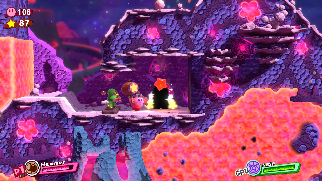 - 4-2: Planet Misteen – After the hammer enemy miniboss, grab the Hammer Copy Ability and combine it with electricity to gain the Zap Hammer. Use it on the big electricity button above the red door, then complete the bonus room.