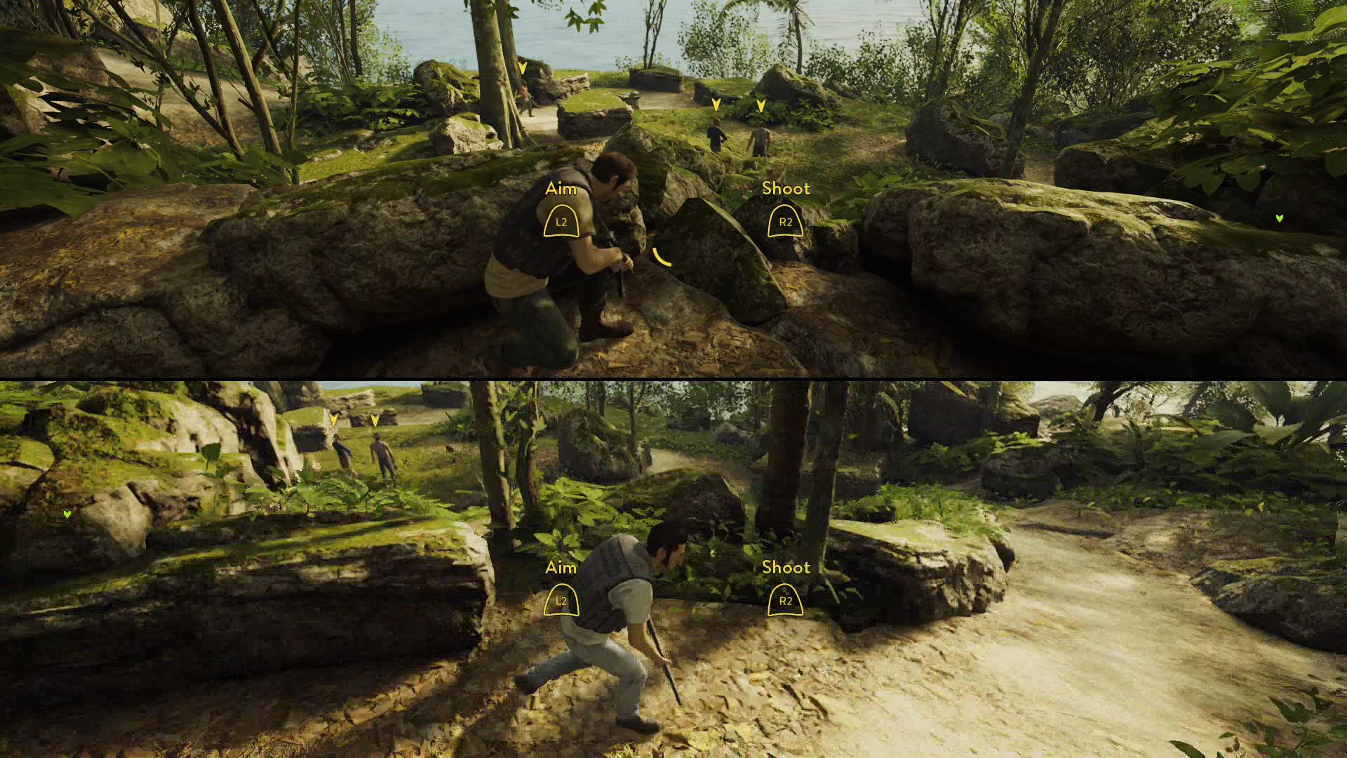 - This is the first time you’ll fight enemies in combat. Aim with [L2 / LT] and fire with [R2 / RT], and reload with [R1 / RB]. Stay behind cover, and avoid damage — your health with regenerate pretty quickly.