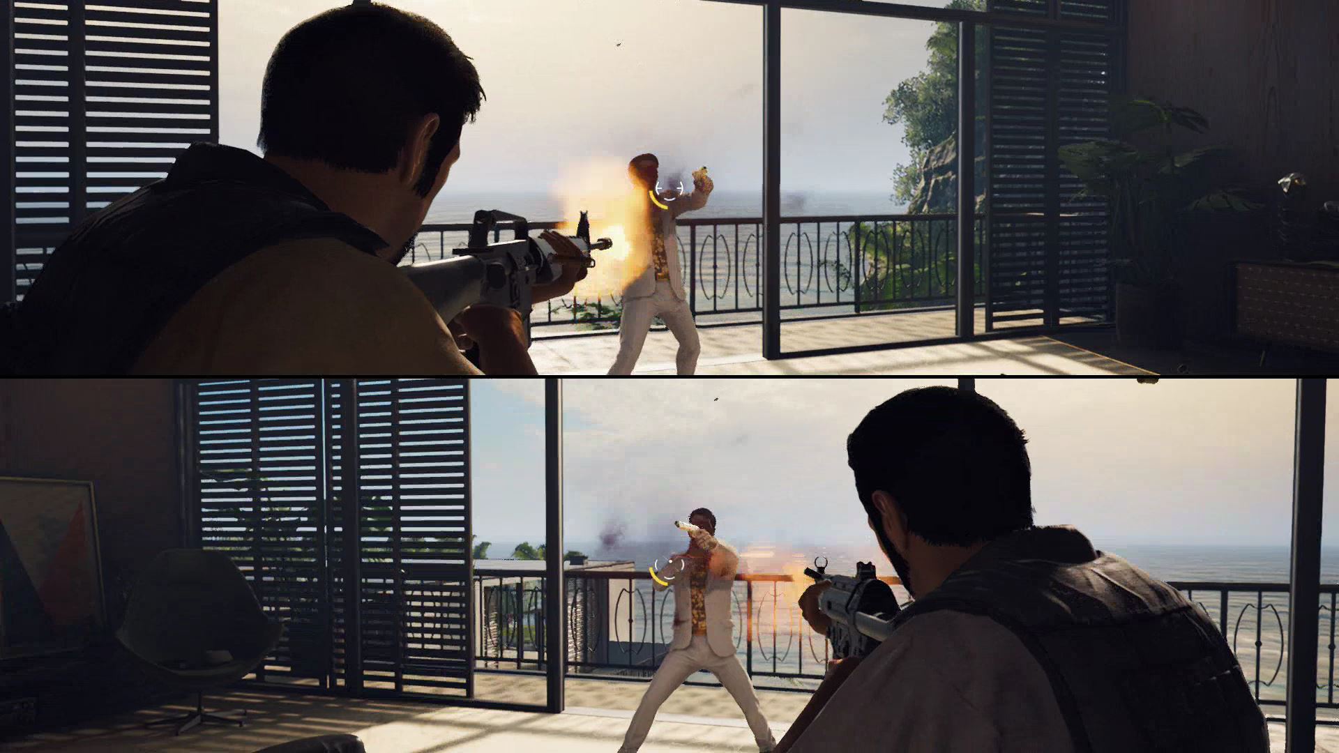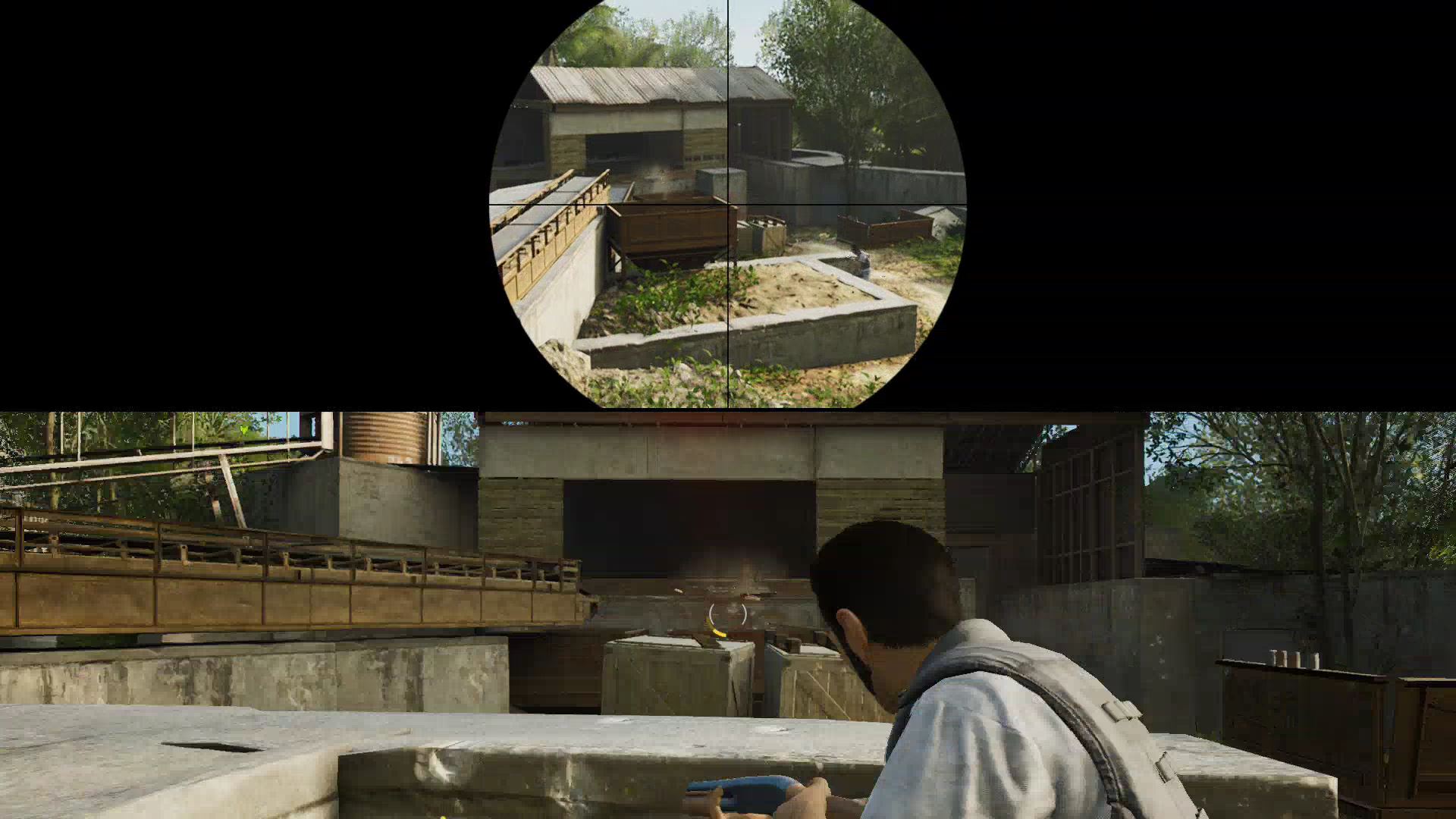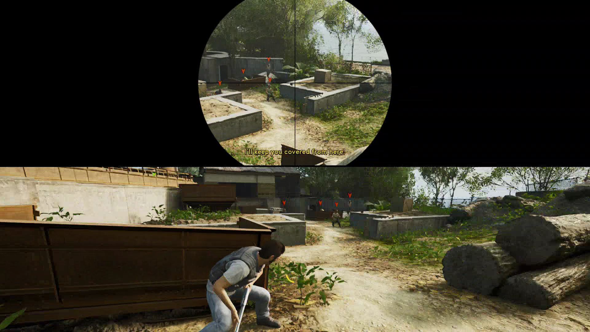 - Here, use the rifle to shoot incoming goons and help your friend down below. Zoom in for easier accurate shots with [L2 / LT].