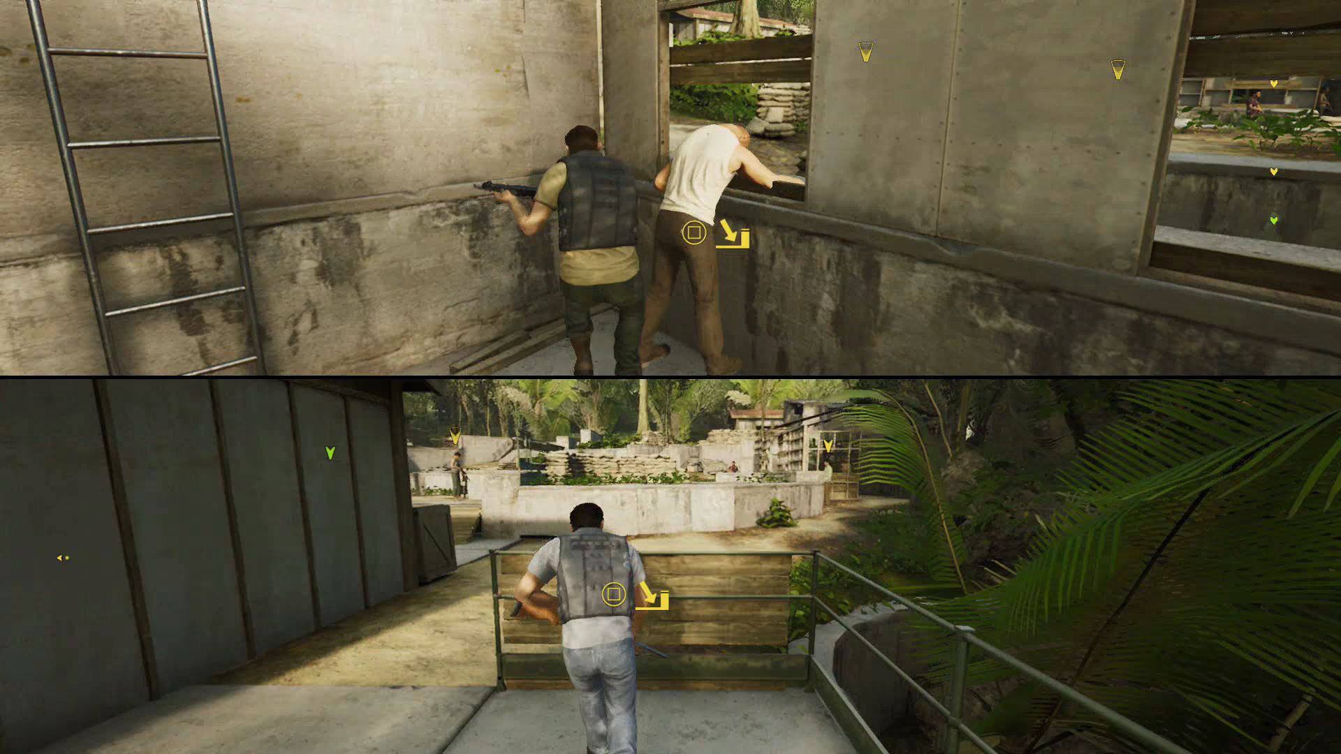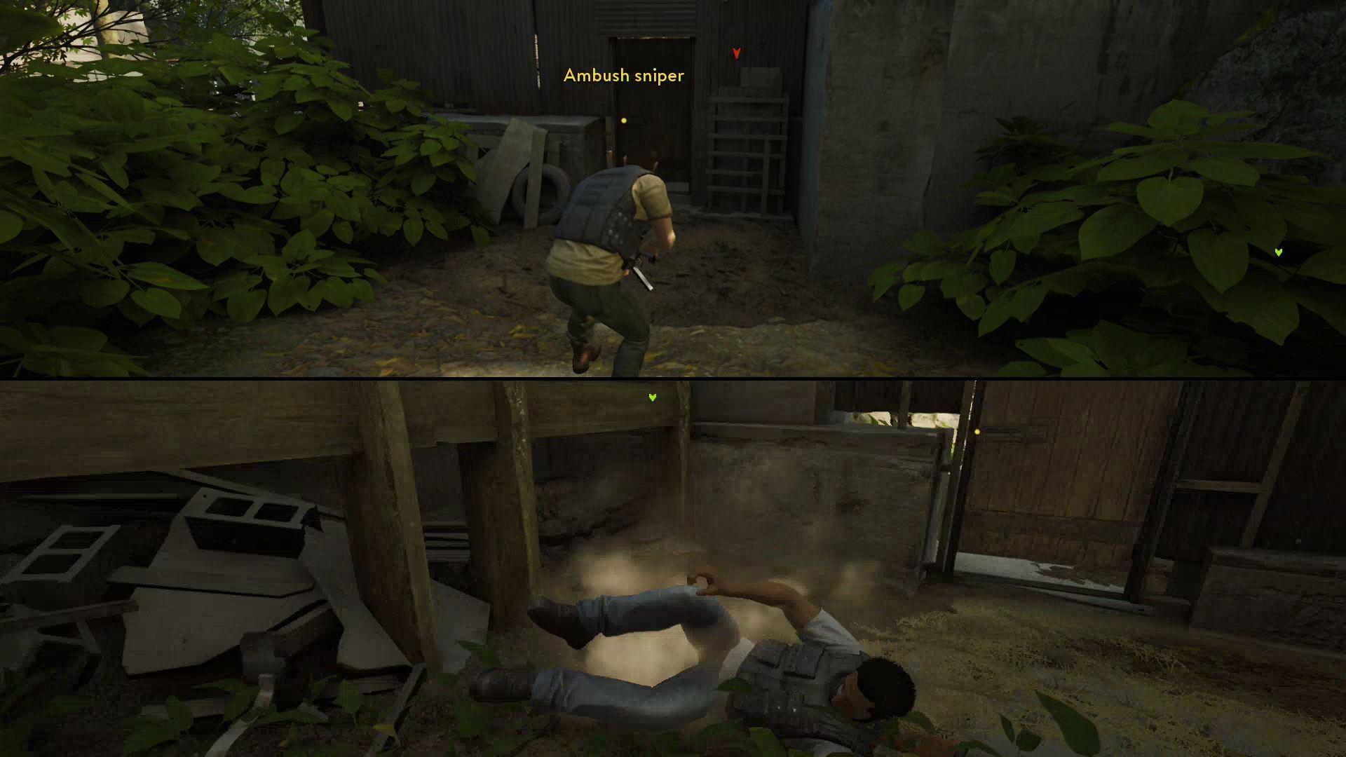 - Whoever climbs the ladder first will ambush the sniper and take his gun.