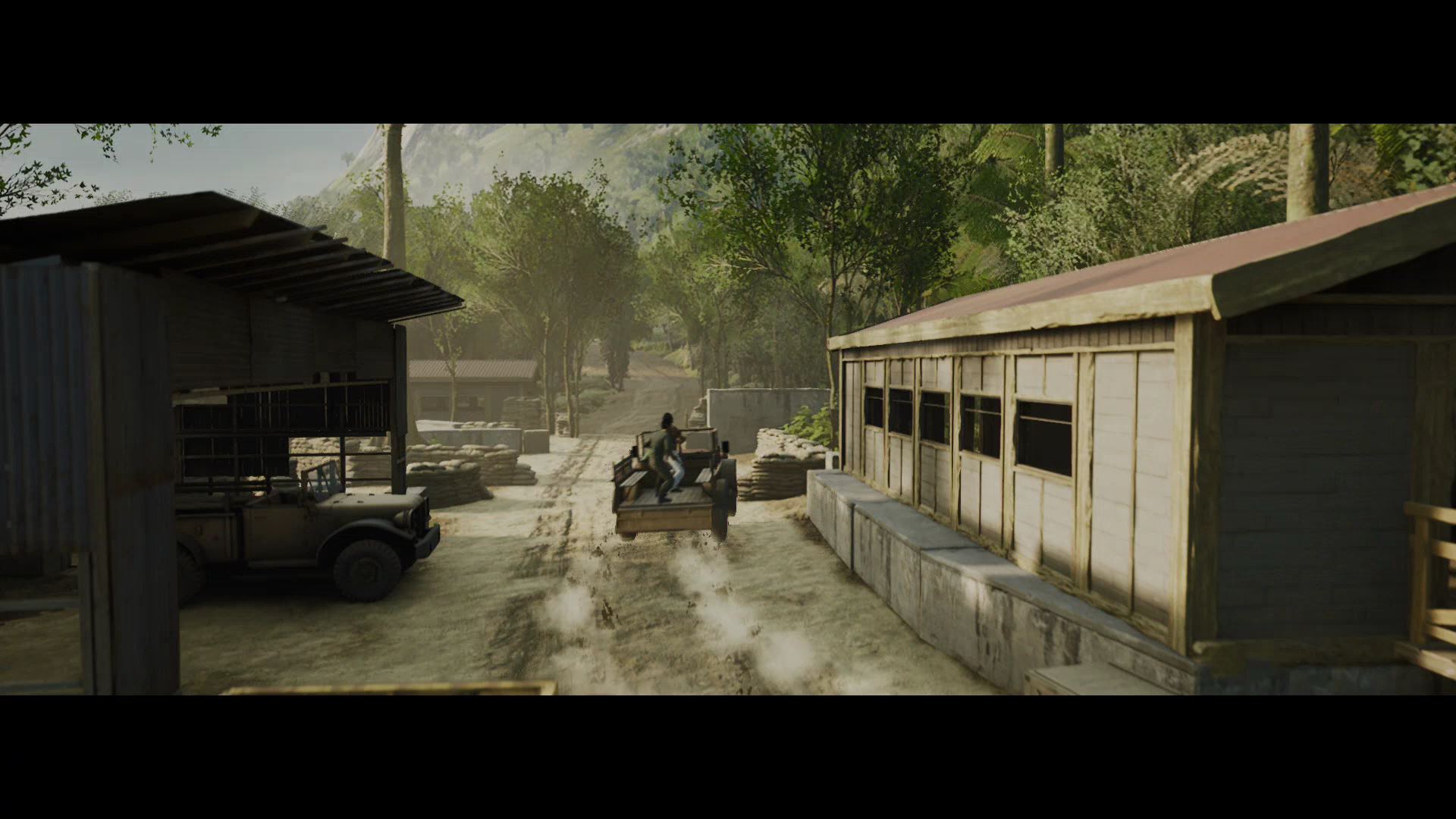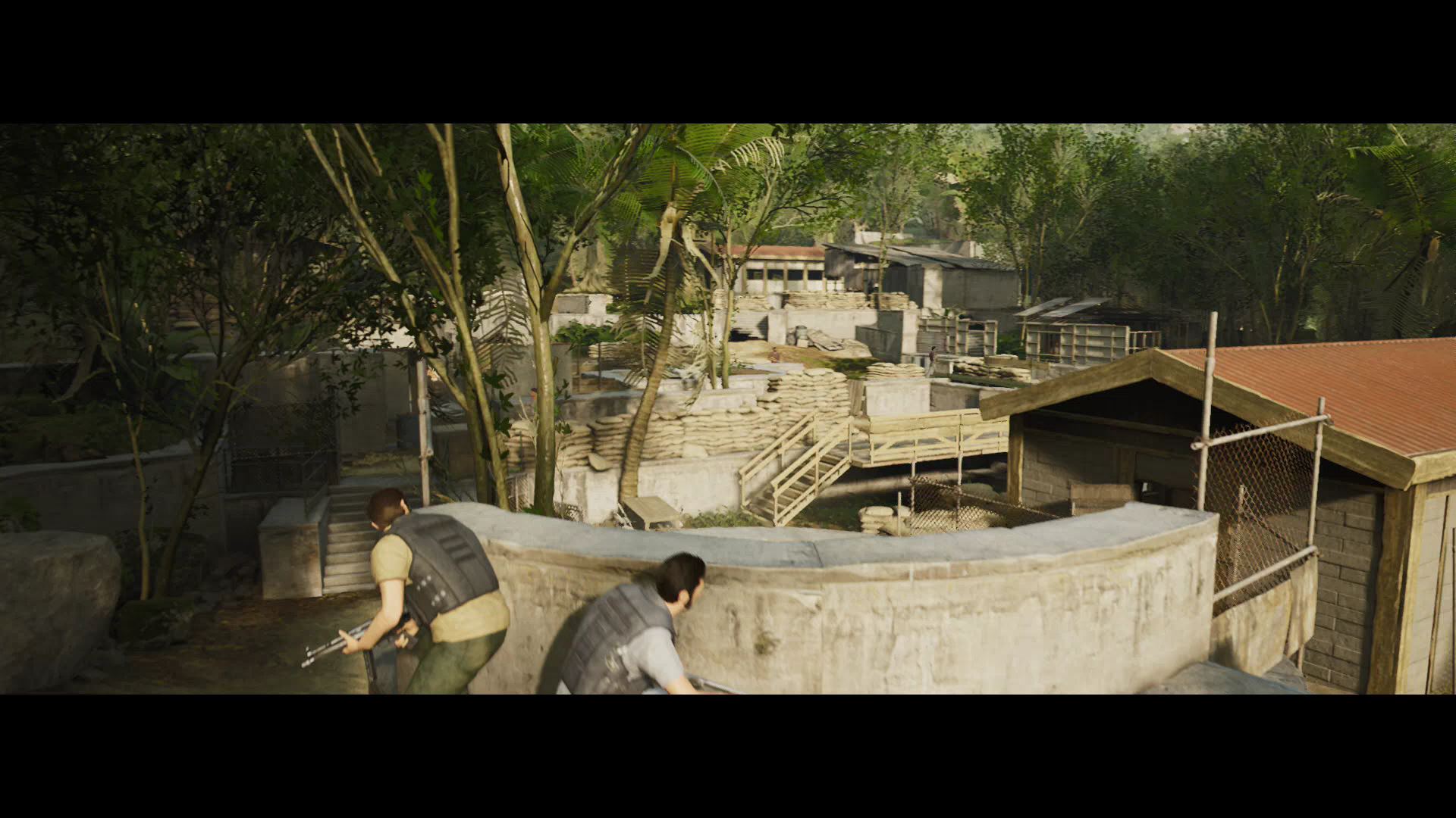- Fight up the terrace and past the bunkhouses toward the open garage. The doors will close after a small army of goons rushes you.