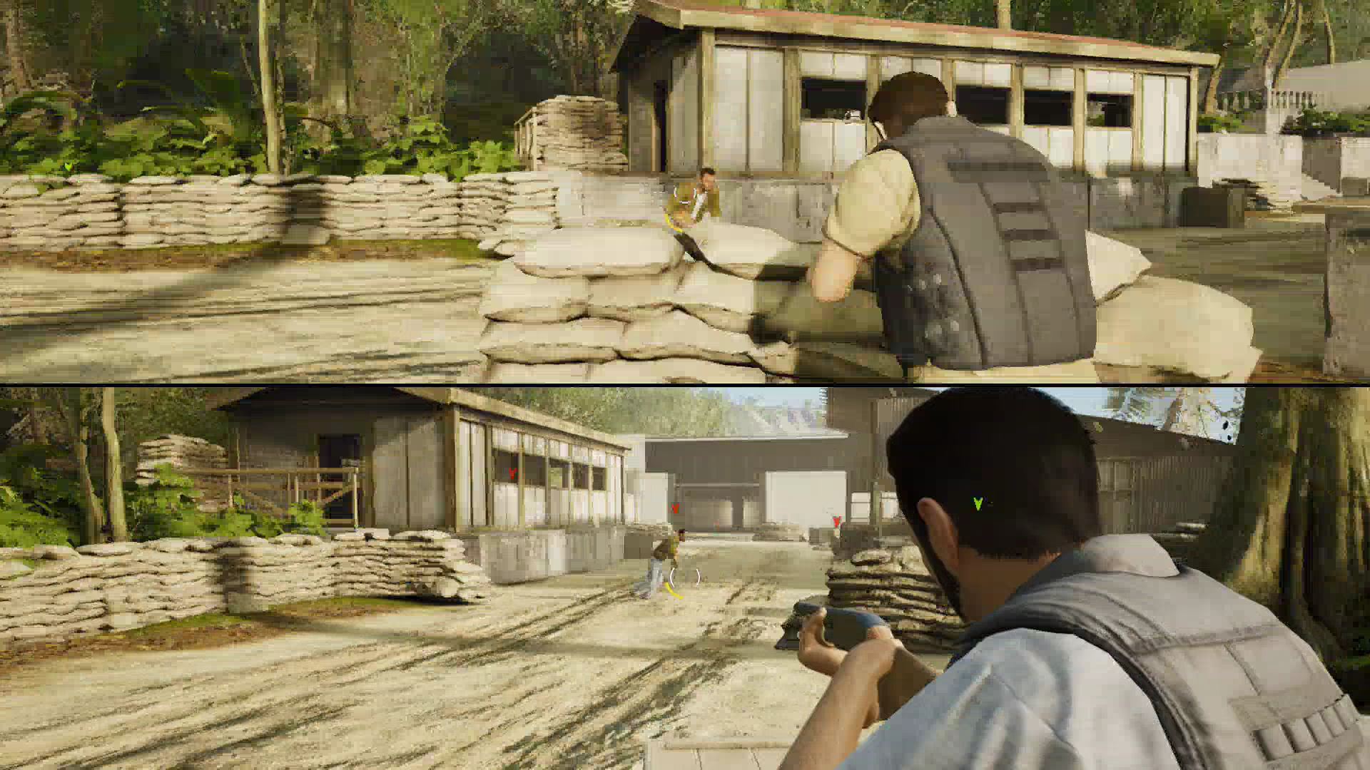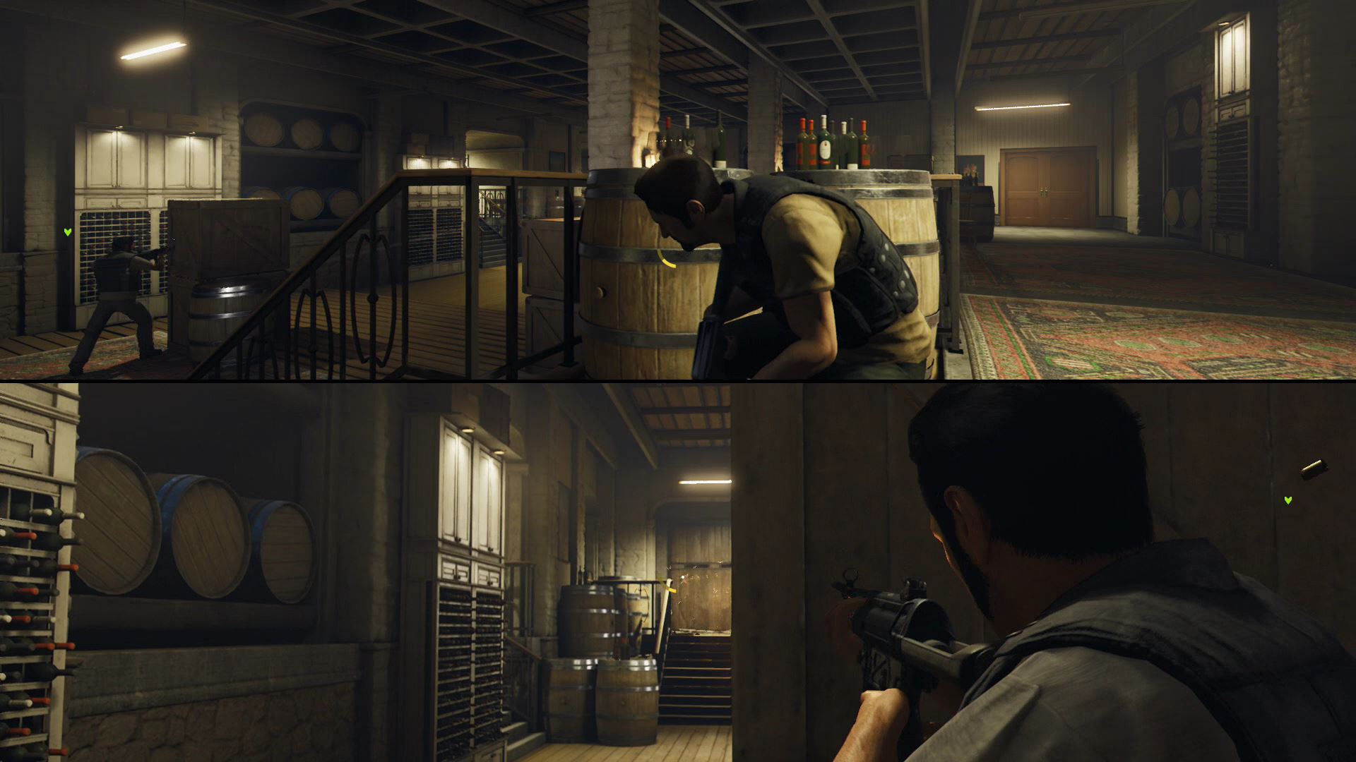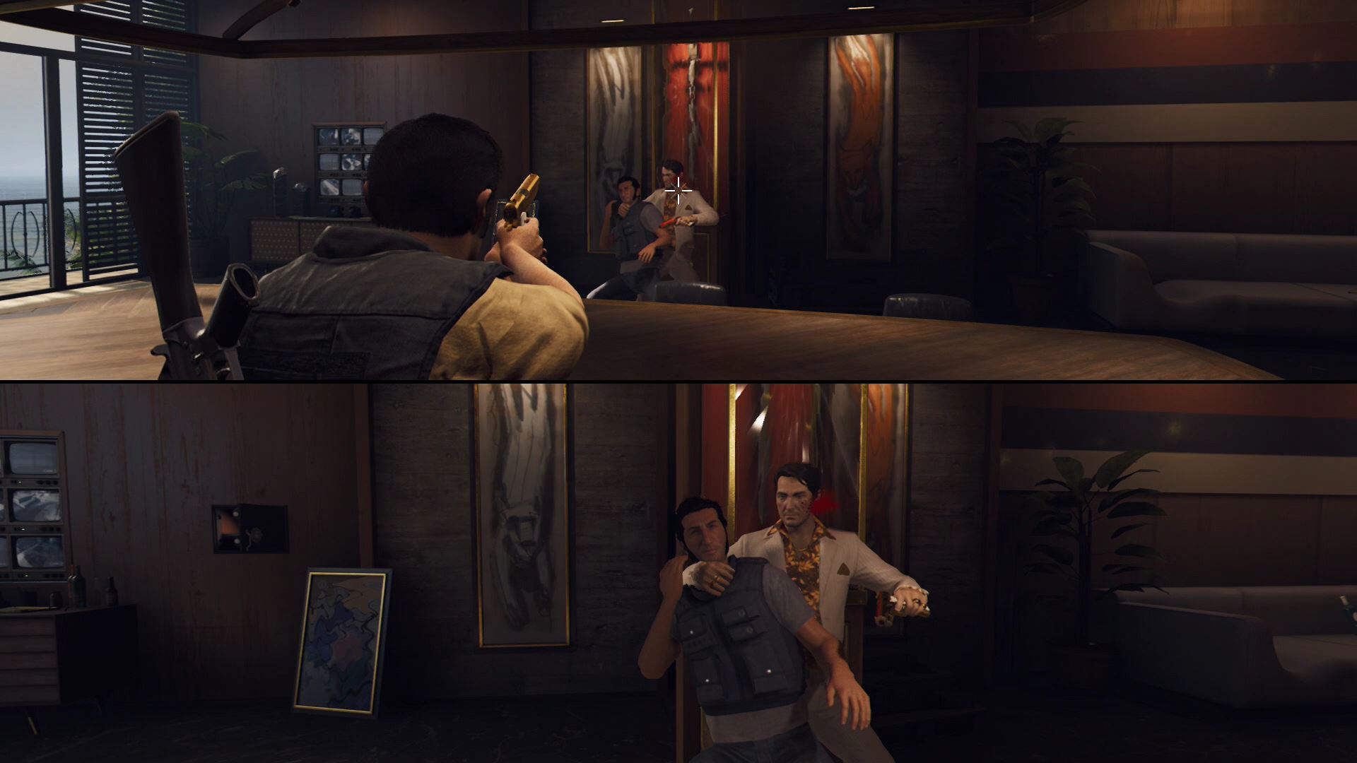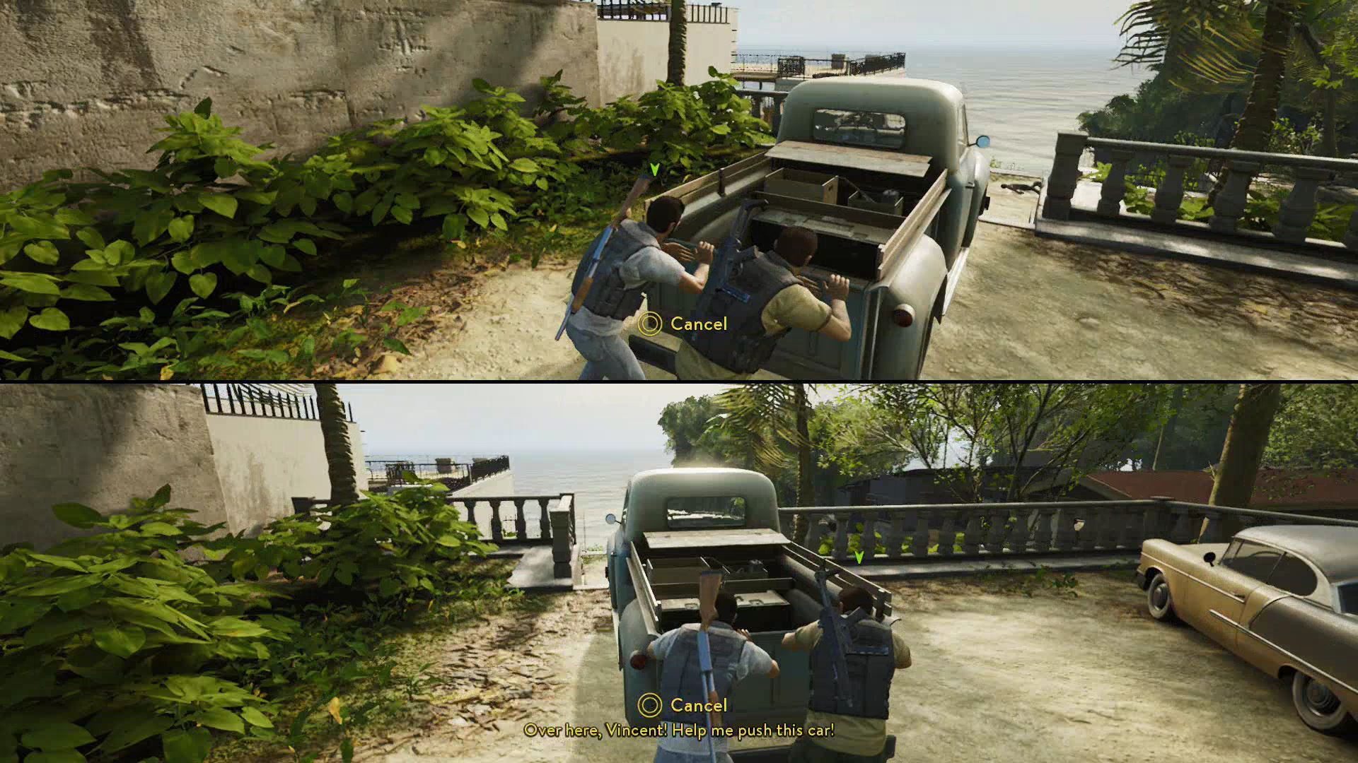 - Outside Harvey’s compound, Leo and Vincent will encounter a group of armed goons. Flank around to the right side and start shooting — you’ll be able to catch the goons in crossfire.
