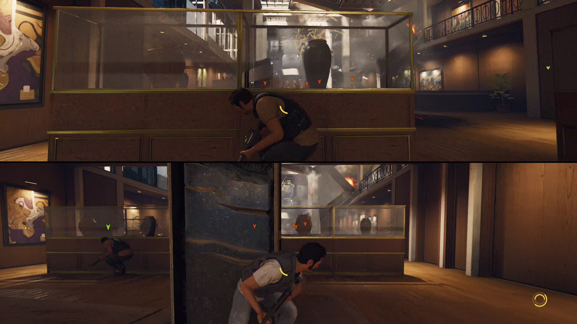 - To escape the hostage situation, slowly move toward the glass cases to the hostage’s left. When you’re close, you can bash Harvey’s head on the glass, giving your partner a clear shot to shoot Harvey.