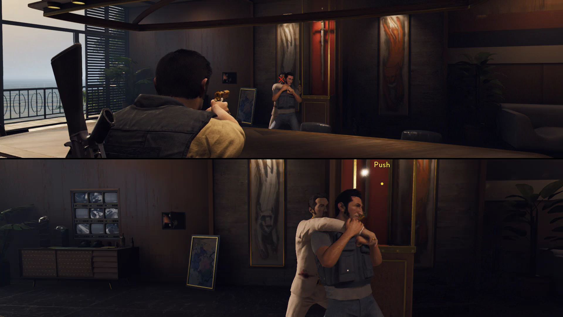 - One player will need to shoot the door to provide covering fire while the other player moves to the hallway to the left of the target’s hiding spot.