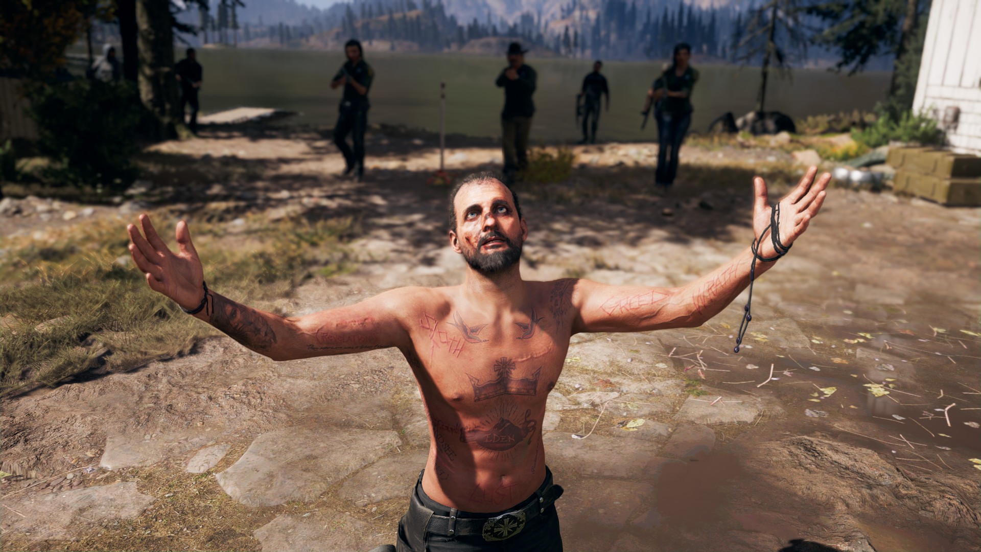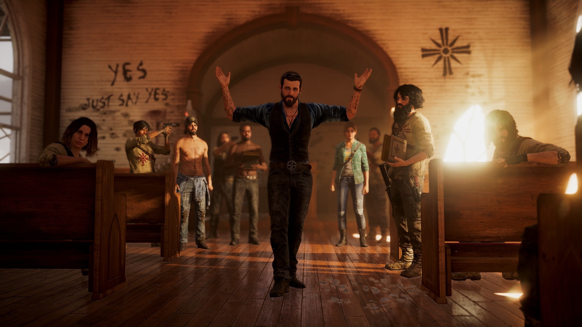 Once you successfully turn everyone back to your side, you can shoot Joseph Seed. Shooting him causes the cult leader to temporarily disappear, giving you a few seconds to revive a team mate. At the end of the boss battle, the freed law enforcement approach to capture Seed — and then the big twist happens.