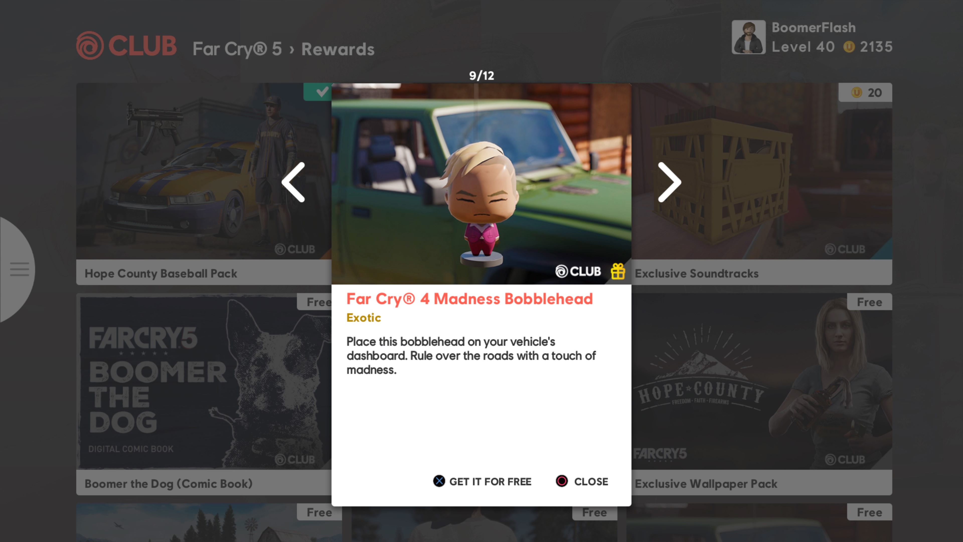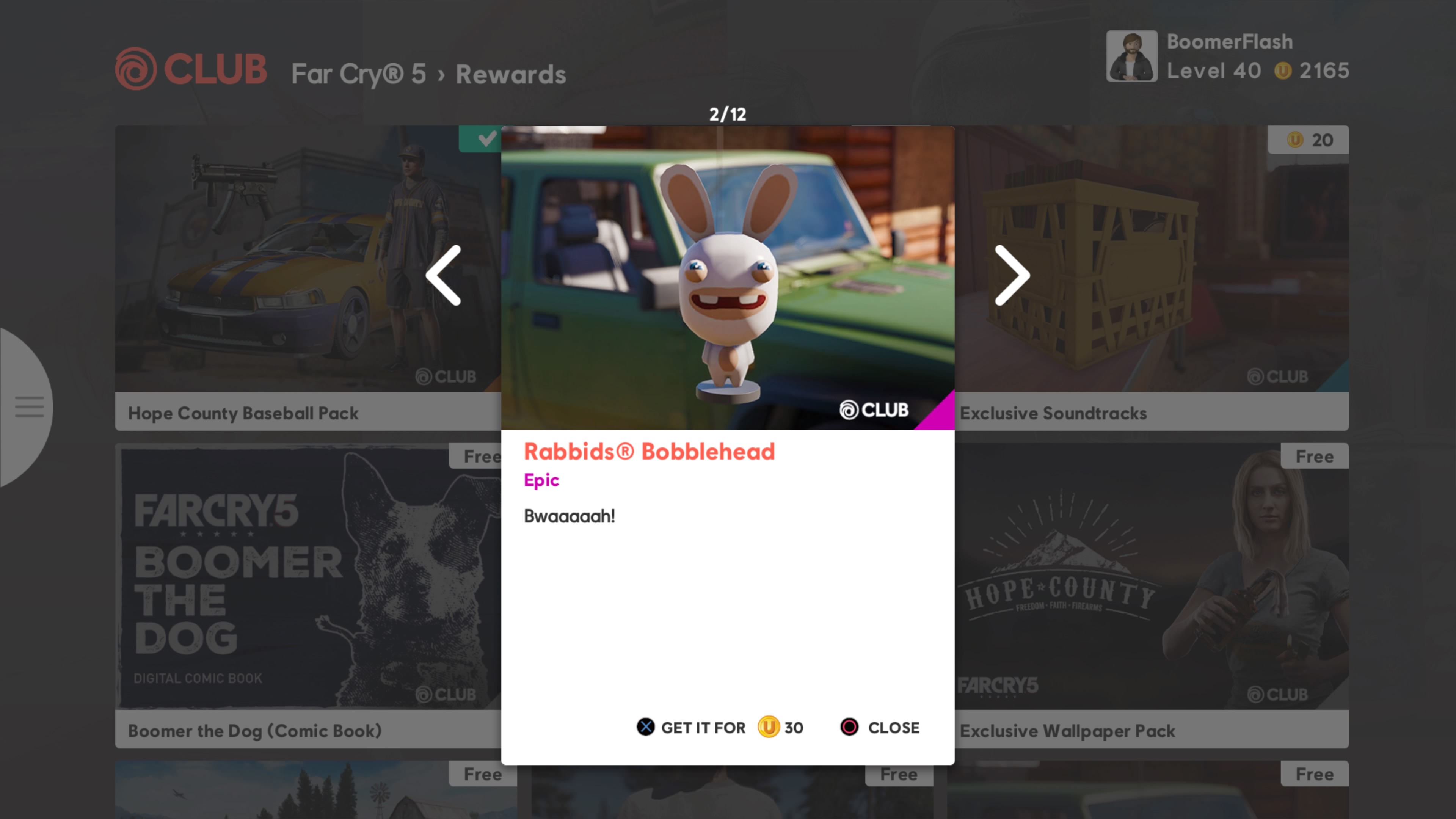If you check out the car customization page, you’ll find bobbleheads you can purchase and add to the dash of your vehicle. The first, the “Hawaiin” bobblehead actually has a Vaas (Far Cry 3’s villain) head on top. Then there are the exclusive Ubisoft store items — using your Uplay points, you can get a Pagan Min, the villain of Far Cry 4. You can also get a rabbid, one of the weird Ubisoft rabbit mascots.