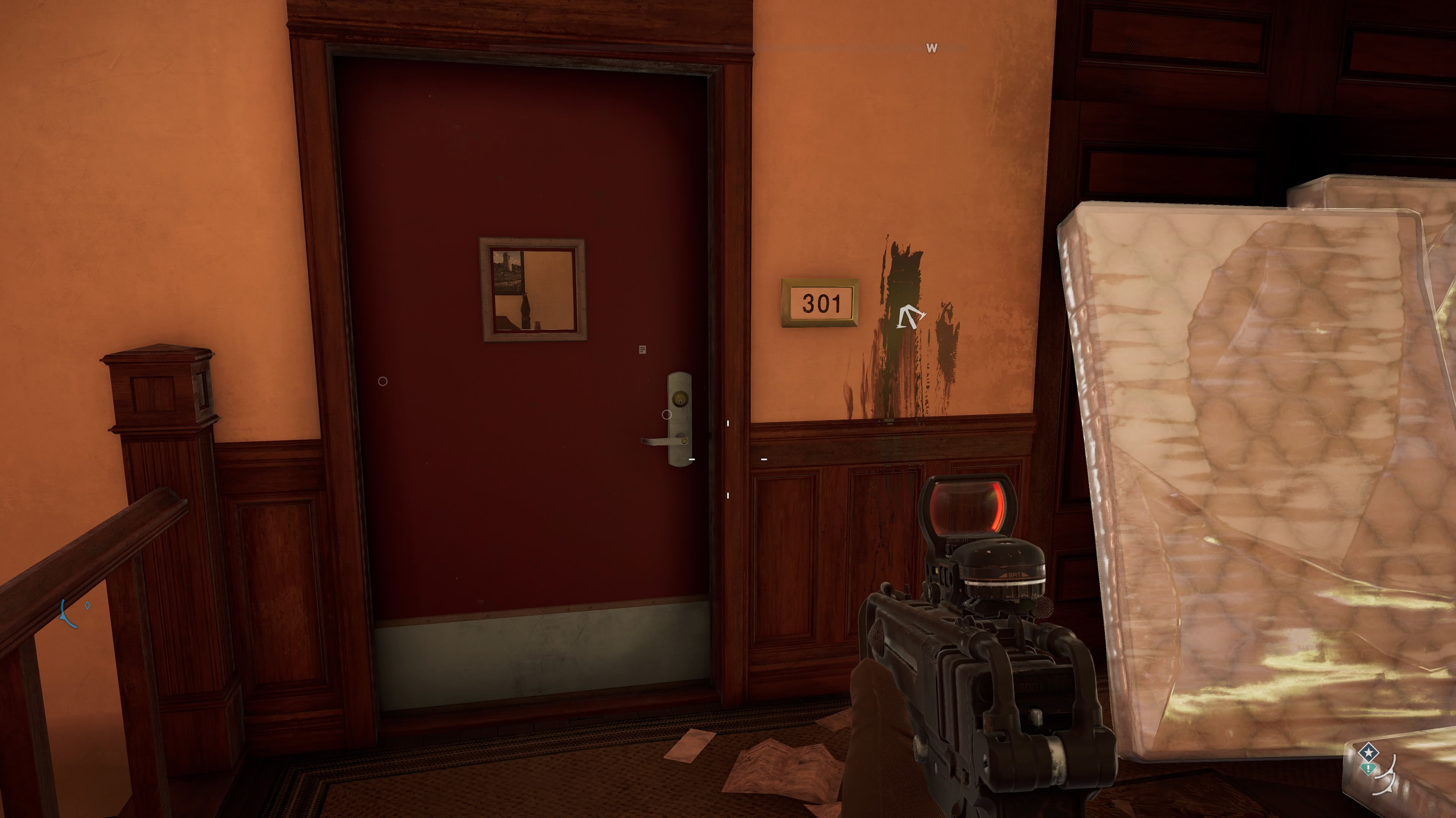 Go to Room 301 on the top floor and pick the lock to find bloody handprints and creepy messages / sounds in the room. This is probably a reference to the super-spooky Room 237 from Stephen King’s The Shining, a book about a slightly different murder hotel. Bad stuff goes down in Room 237. Or, it could be a more general Stephen King reference — that guy does love murders, after all.