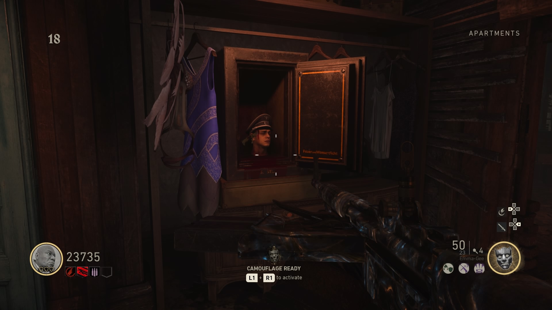 - Count the amount of zombies that are absorbed at each clown doll — this will be your code for the safe in the Apartments. You can repeat the four green markers in order to check your number.