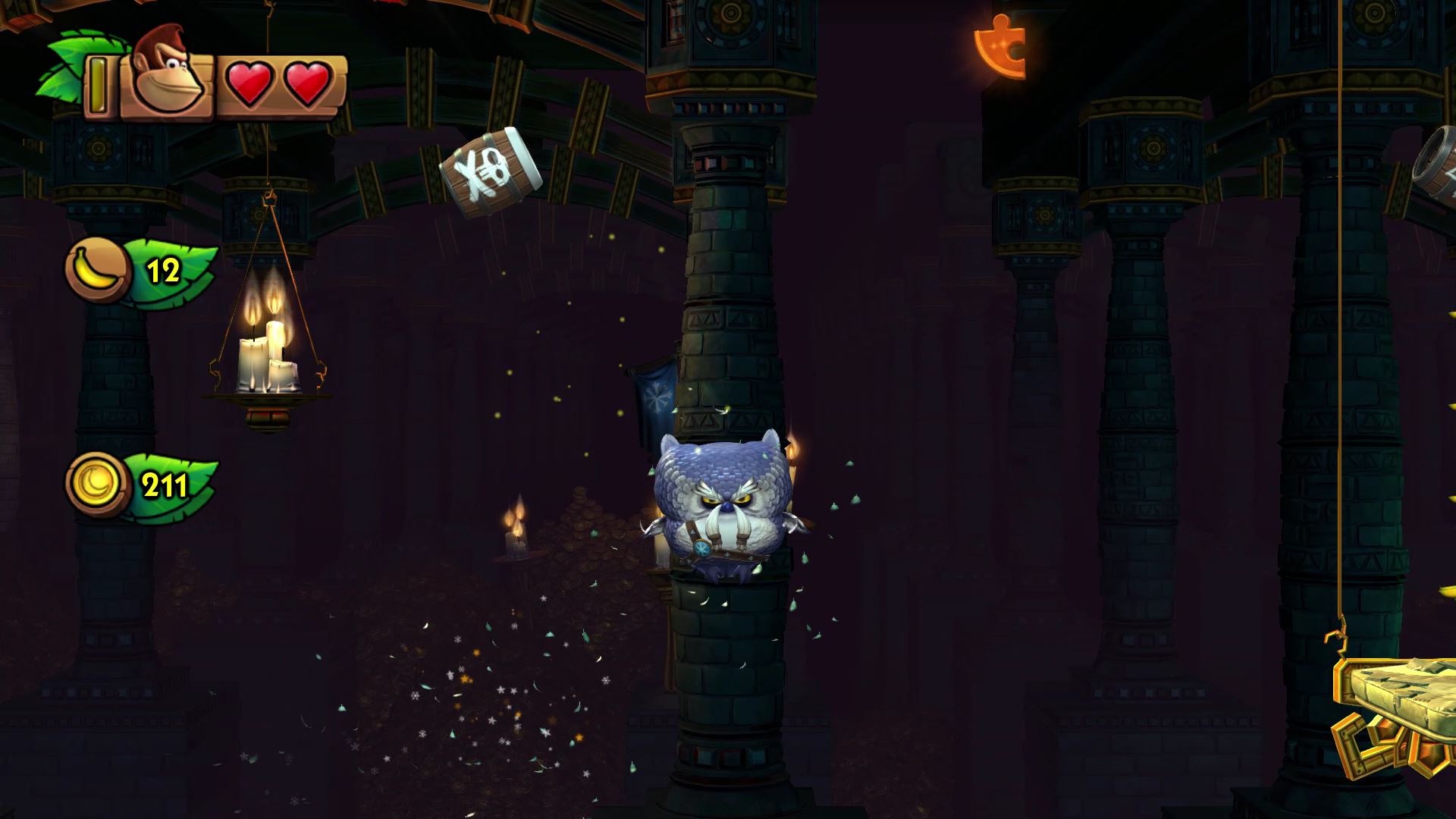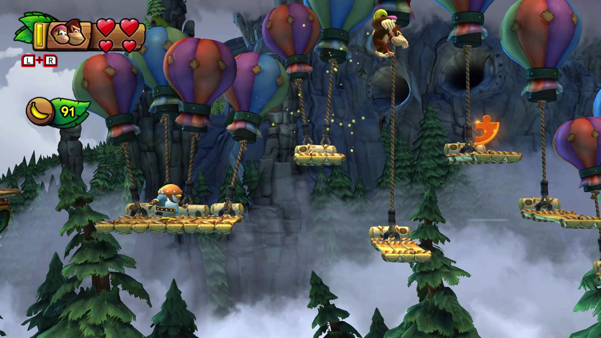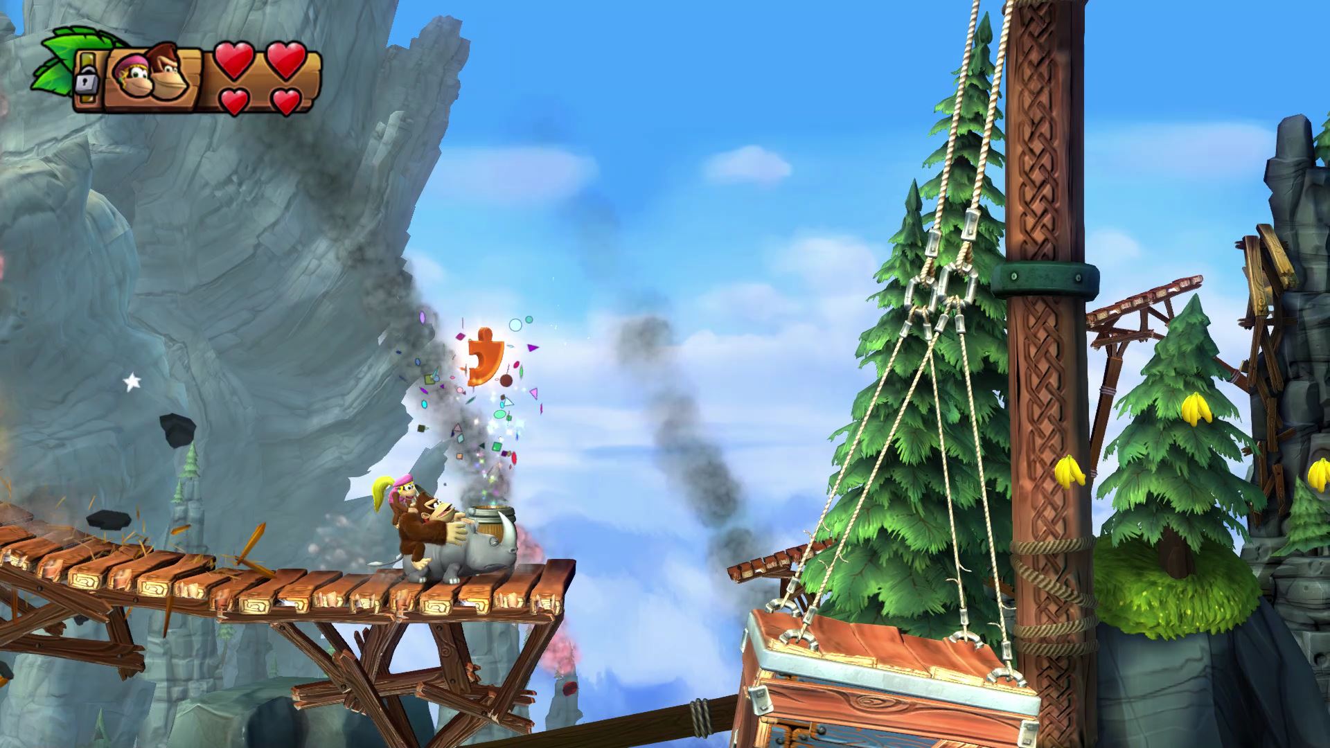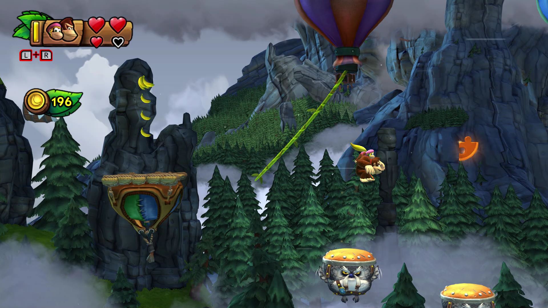 - Puzzle Piece #3: You absolutely need Dixie ahead. After launching and bopping off bird heads, you’ll land on a pillar with a hanging platform to the right. The puzzle piece is directly beneath the platform. Jump under it and use Dixie to reach the safe platform.