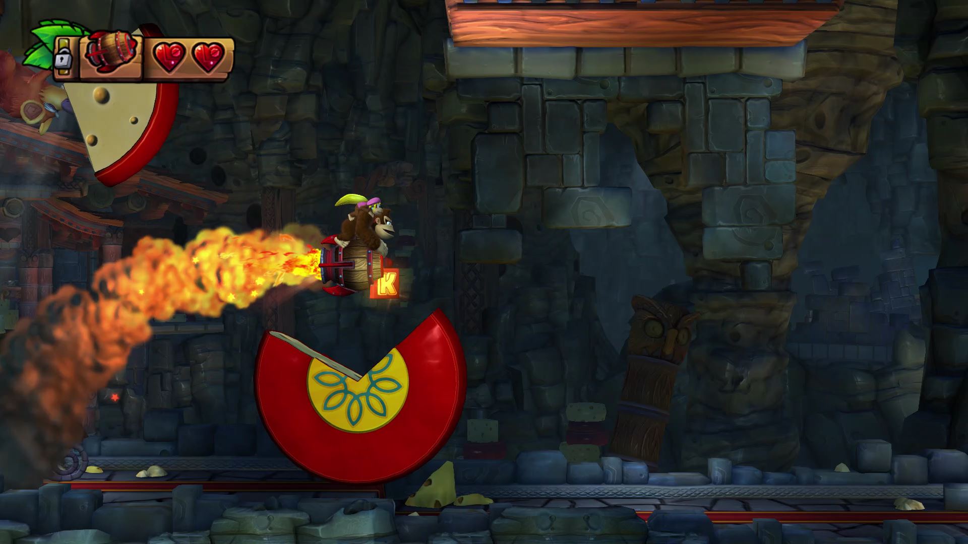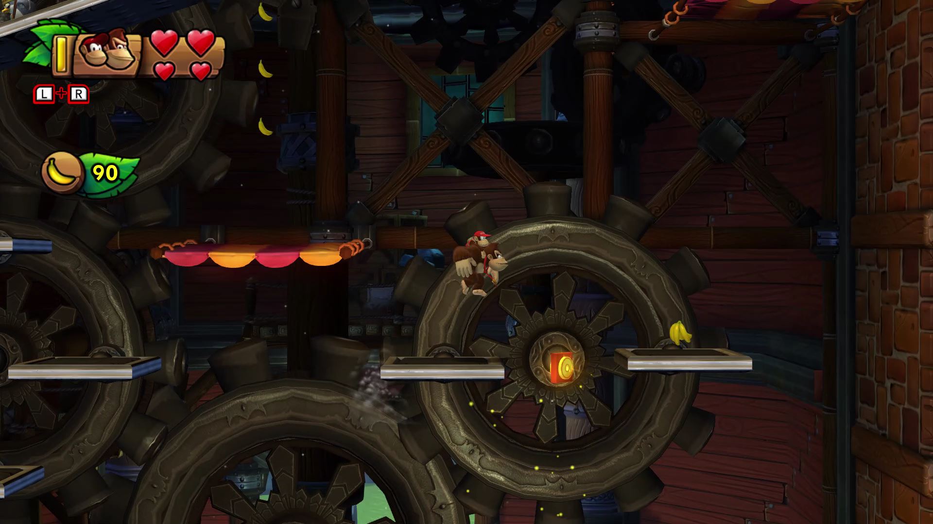 - G Letter: Pretty tricky! At the end of the spinning giant cheese wheel gauntlet, stay in the center and align DK with the missing section of the wheel so you can stay in (about) the center and collect the G. Easy to spot, but hard to collect.