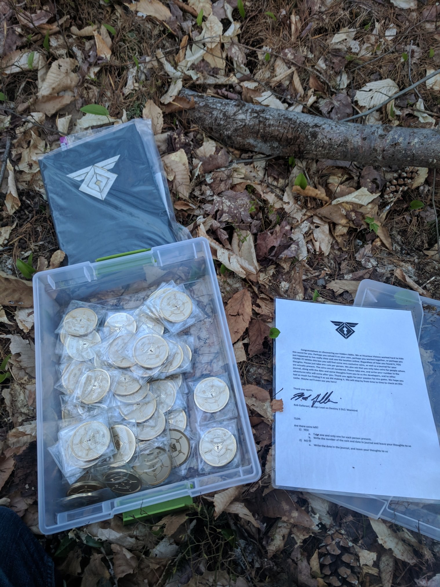 There’s also a fancy note, and a bunch of commemorative coins for those willing to make the trip. The note inside asks visitors to leave a note, and to take only one coins per person.