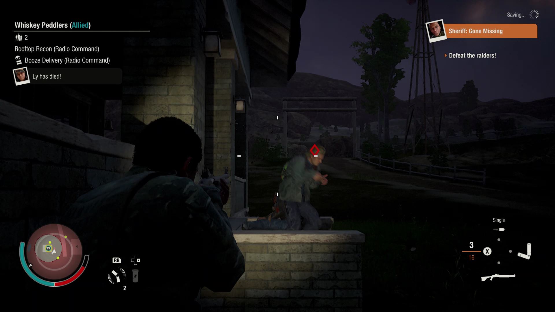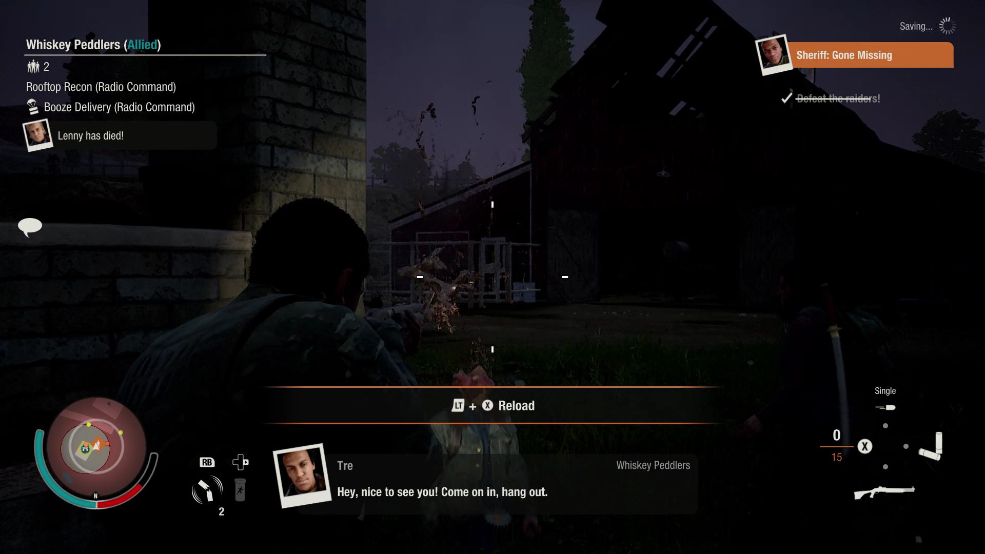Return to your allied enclave to defend against a band of three armed bandits. These are human enemies, and they can quickly kill you with melee attacks or gunfire. Take cover around the side of the building, and go for headshots — this is where a pistol or assault rifle really comes in handy.