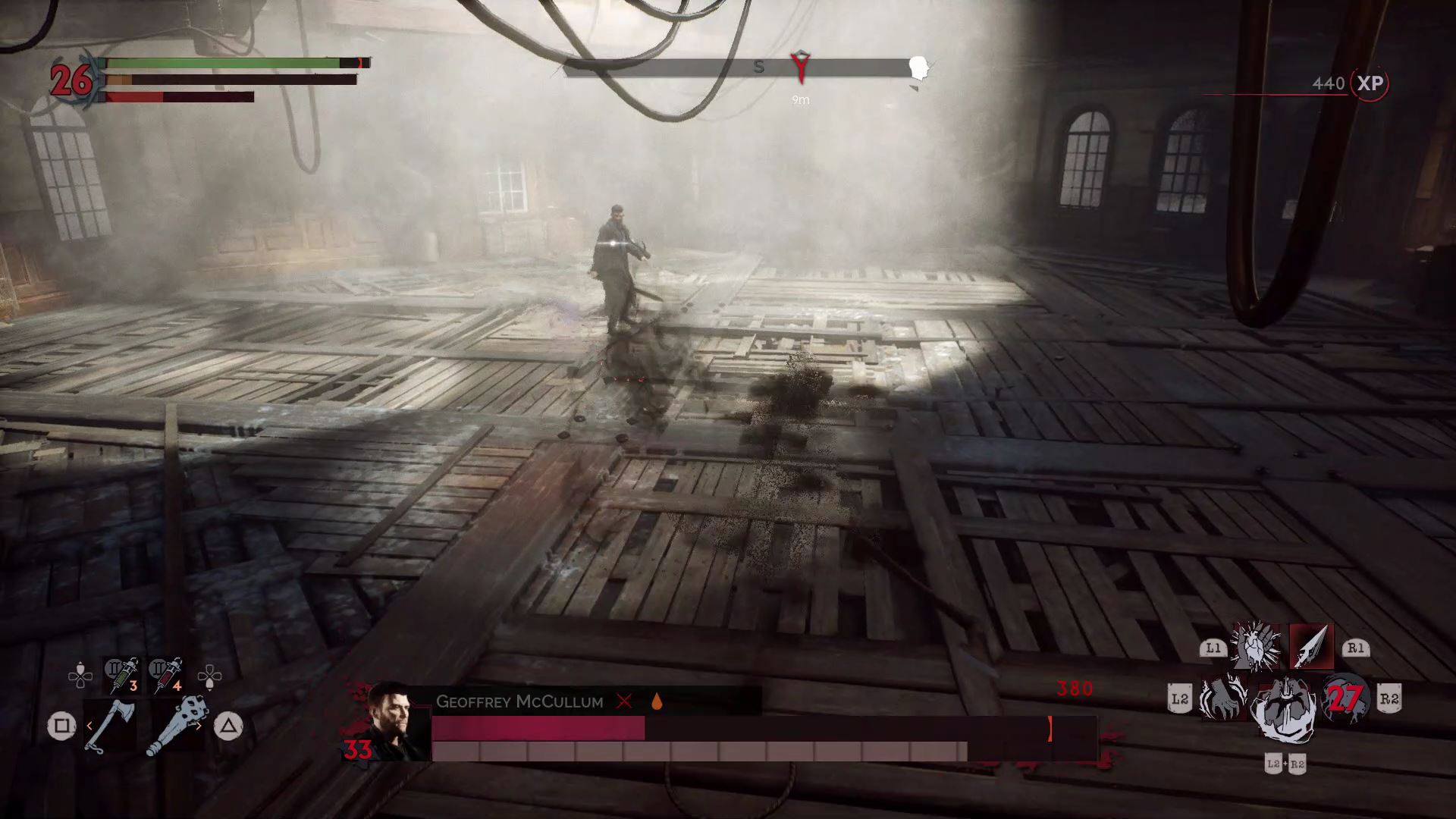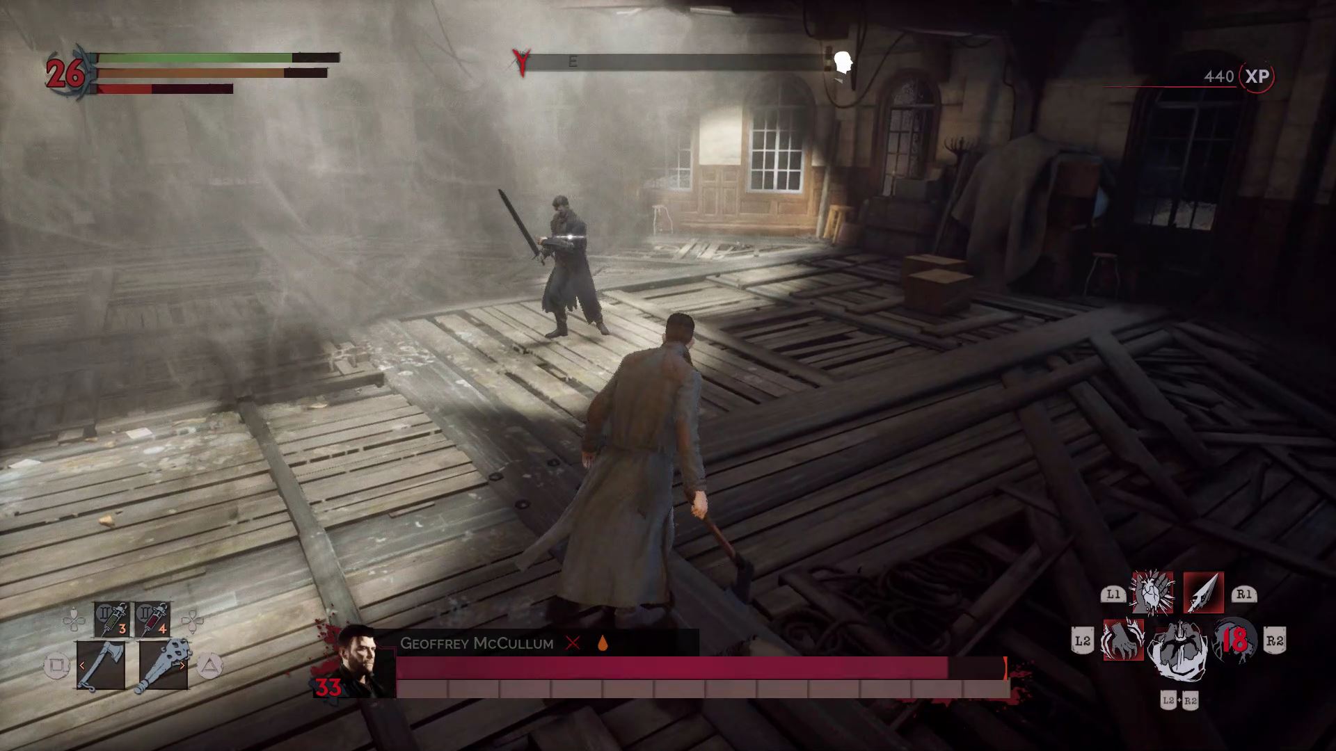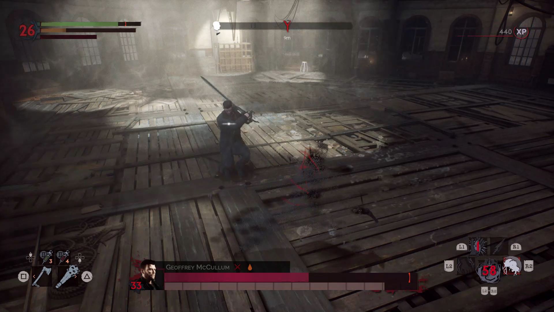 One of the easier boss battles. He’s fast and he uses ultraviolet lights to stun / drain your blood. Watch out for his crossbow bolts at range! Once he takes enough damage, he’ll start to use his sword more. Despite the cure he drinks, you can still stun him and drink his blood to replenish your blood meter.