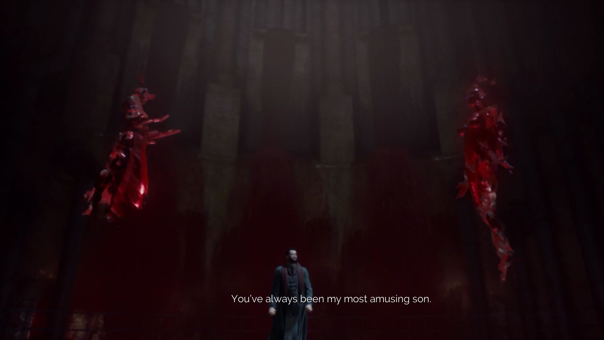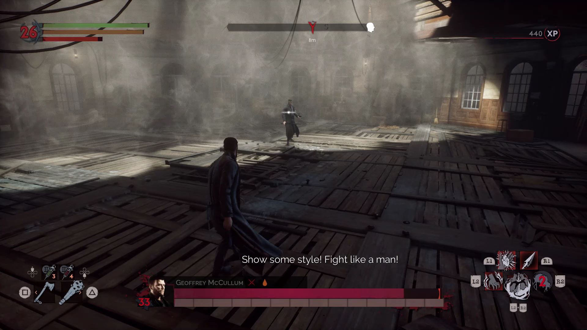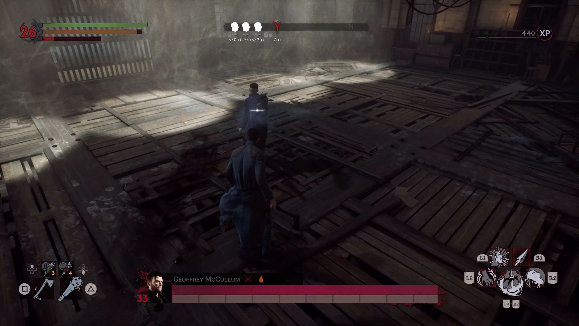 One of the easier boss battles. He’s fast and he uses ultraviolet lights to stun / drain your blood. Watch out for his crossbow bolts at range! Once he takes enough damage, he’ll start to use his sword more. Despite the cure he drinks, you can still stun him and drink his blood to replenish your blood meter.