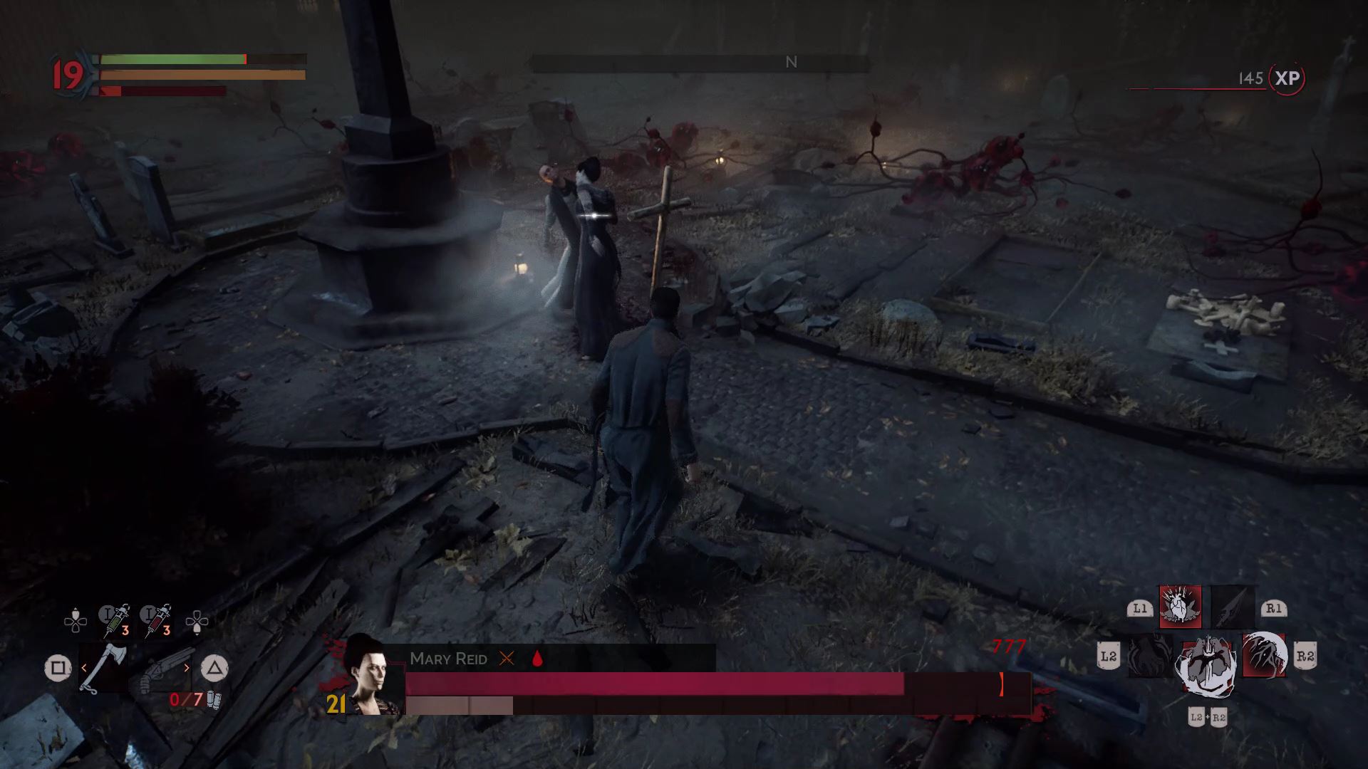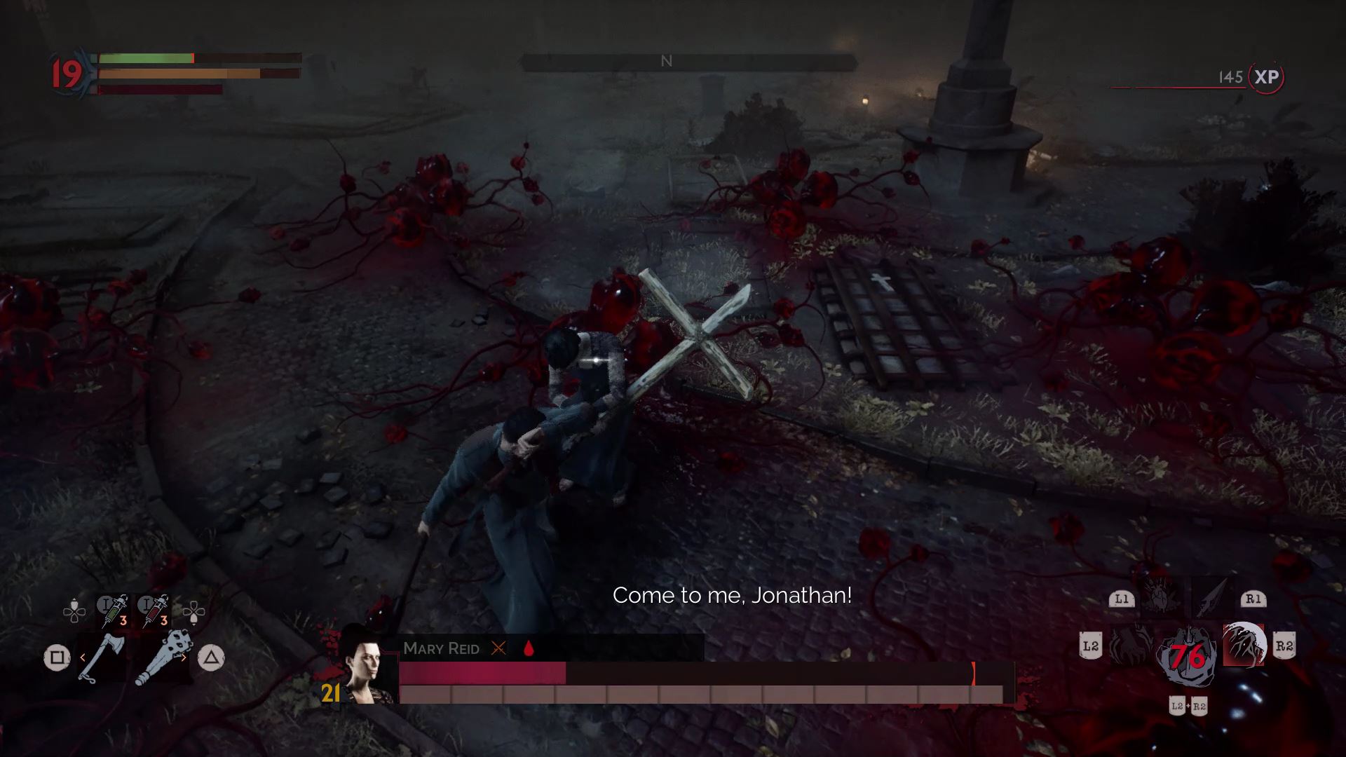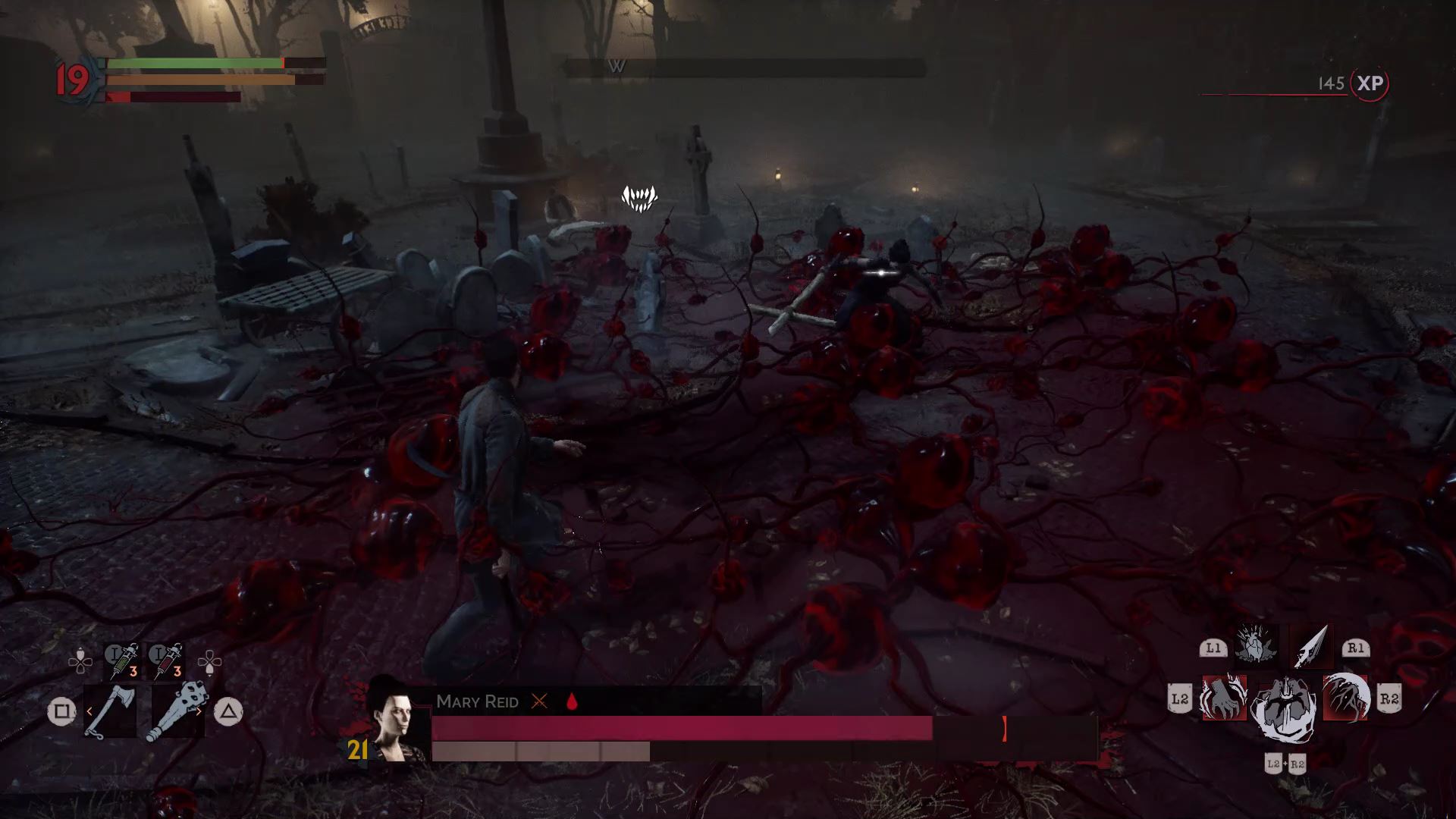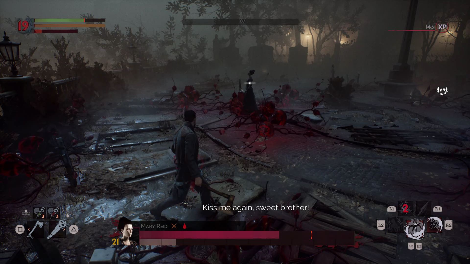 One of the hardest bosses in the game. Mary summons explosive blood pustules from the ground and all around her. To fight her, bring a full stack of shotgun ammo, healing serum, and blood serum. Early in the fight, when you’re low on blood, suck blood from the wounded priest — unless you’re doing a pacifist run.