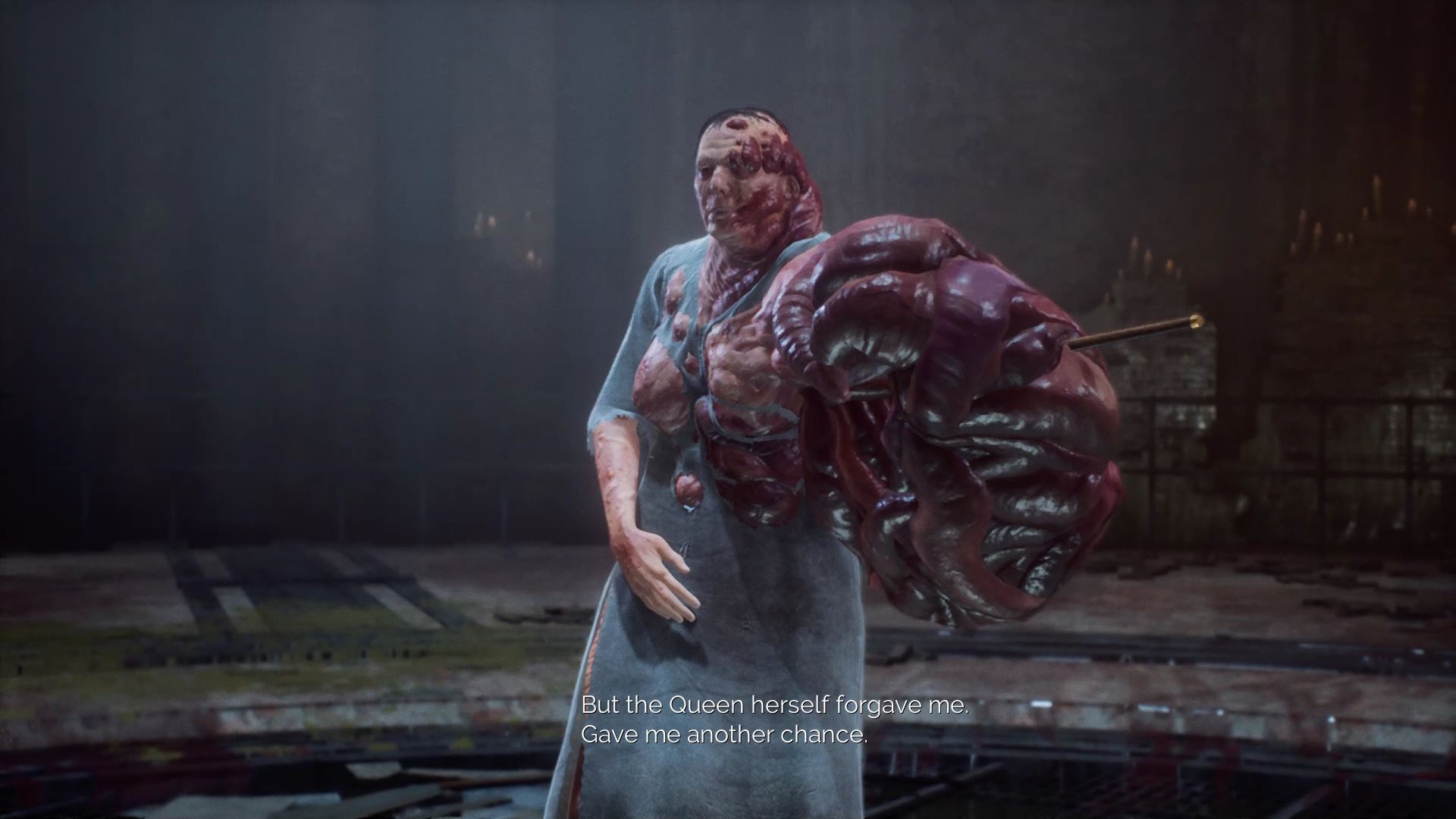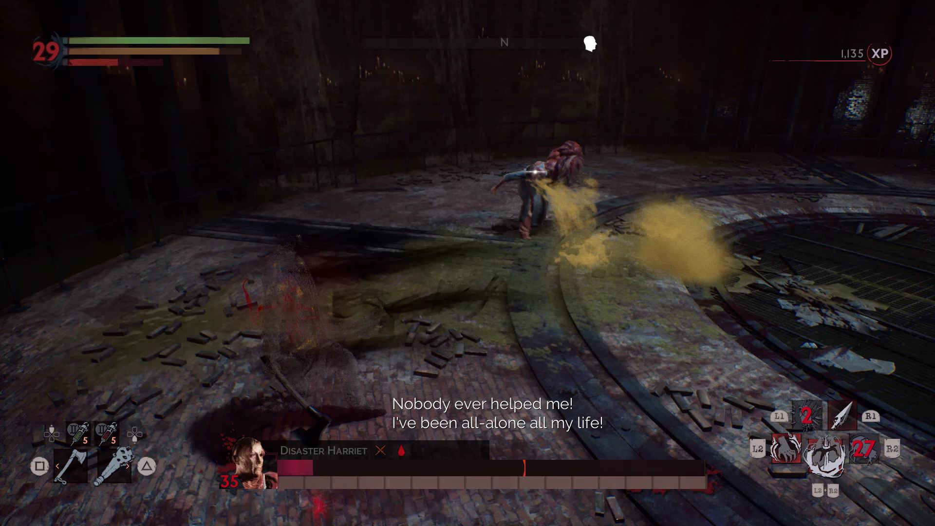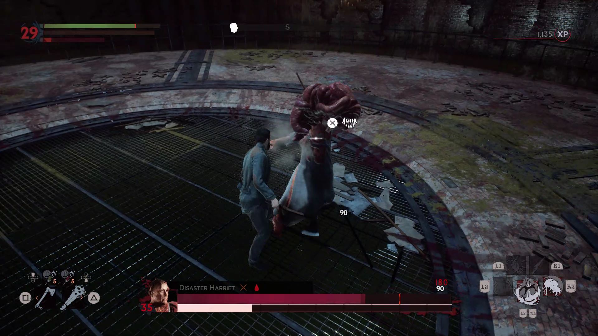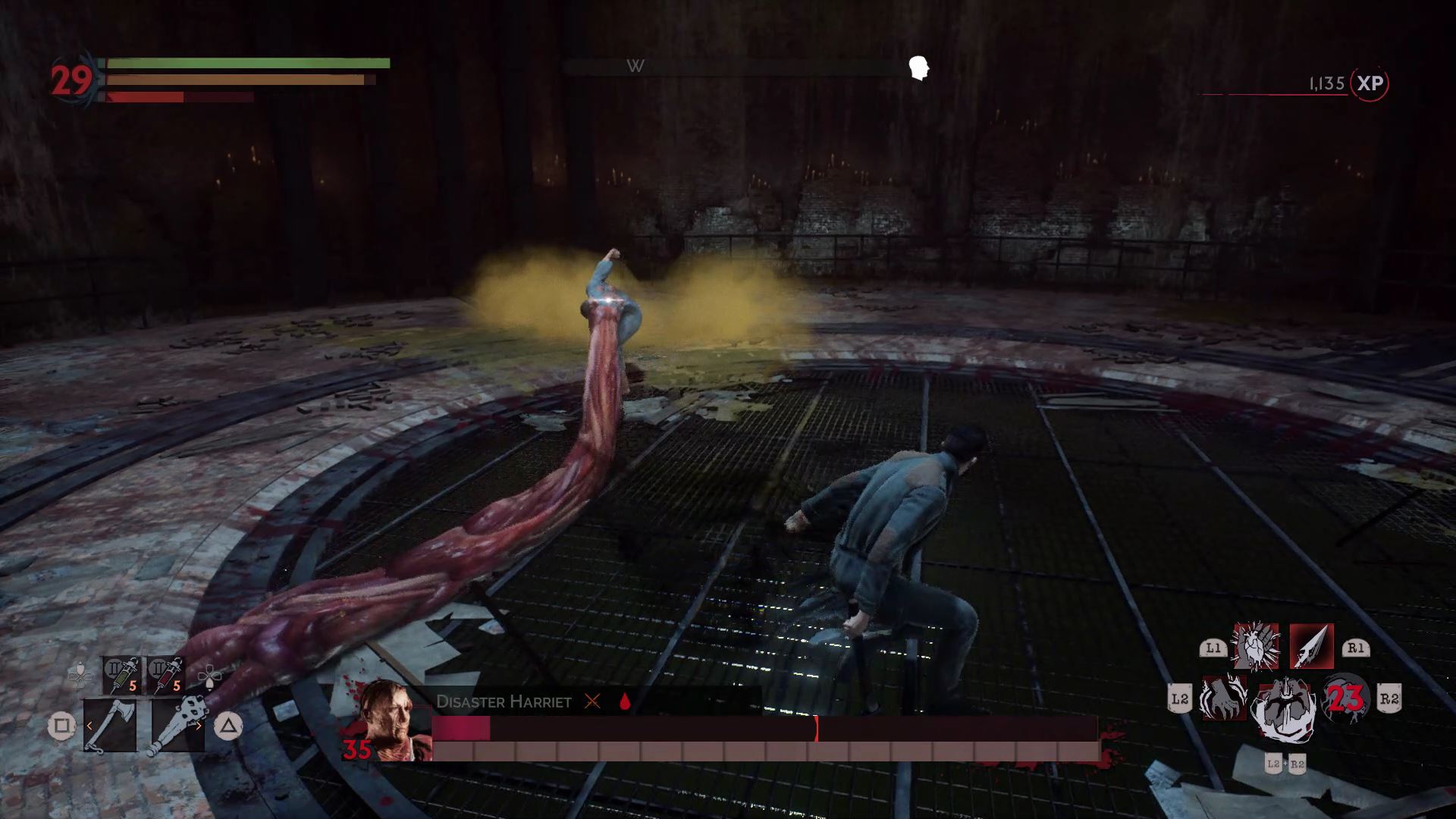 One of the hardest bosses in the game. Mary summons explosive blood pustules from the ground and all around her. To fight her, bring a full stack of shotgun ammo, healing serum, and blood serum. Early in the fight, when you’re low on blood, suck blood from the wounded priest — unless you’re doing a pacifist run.