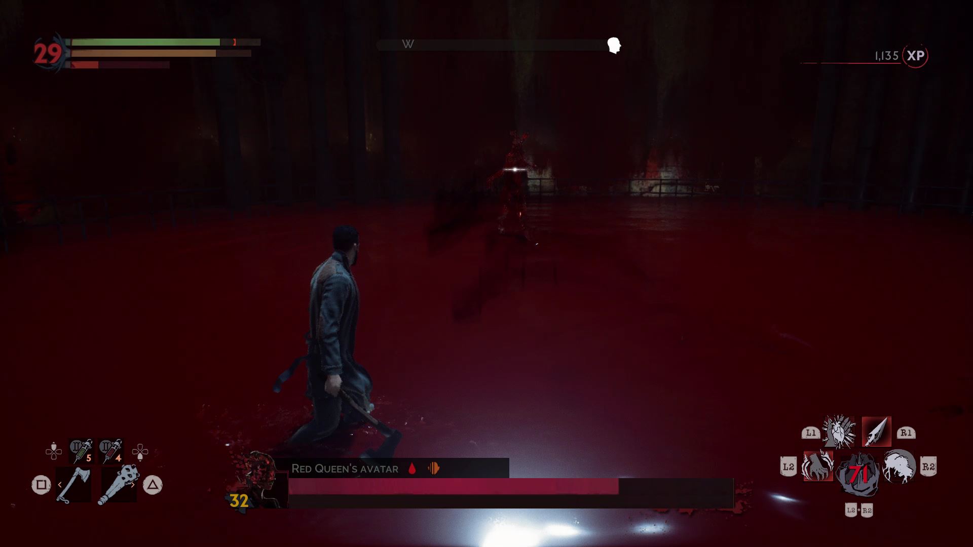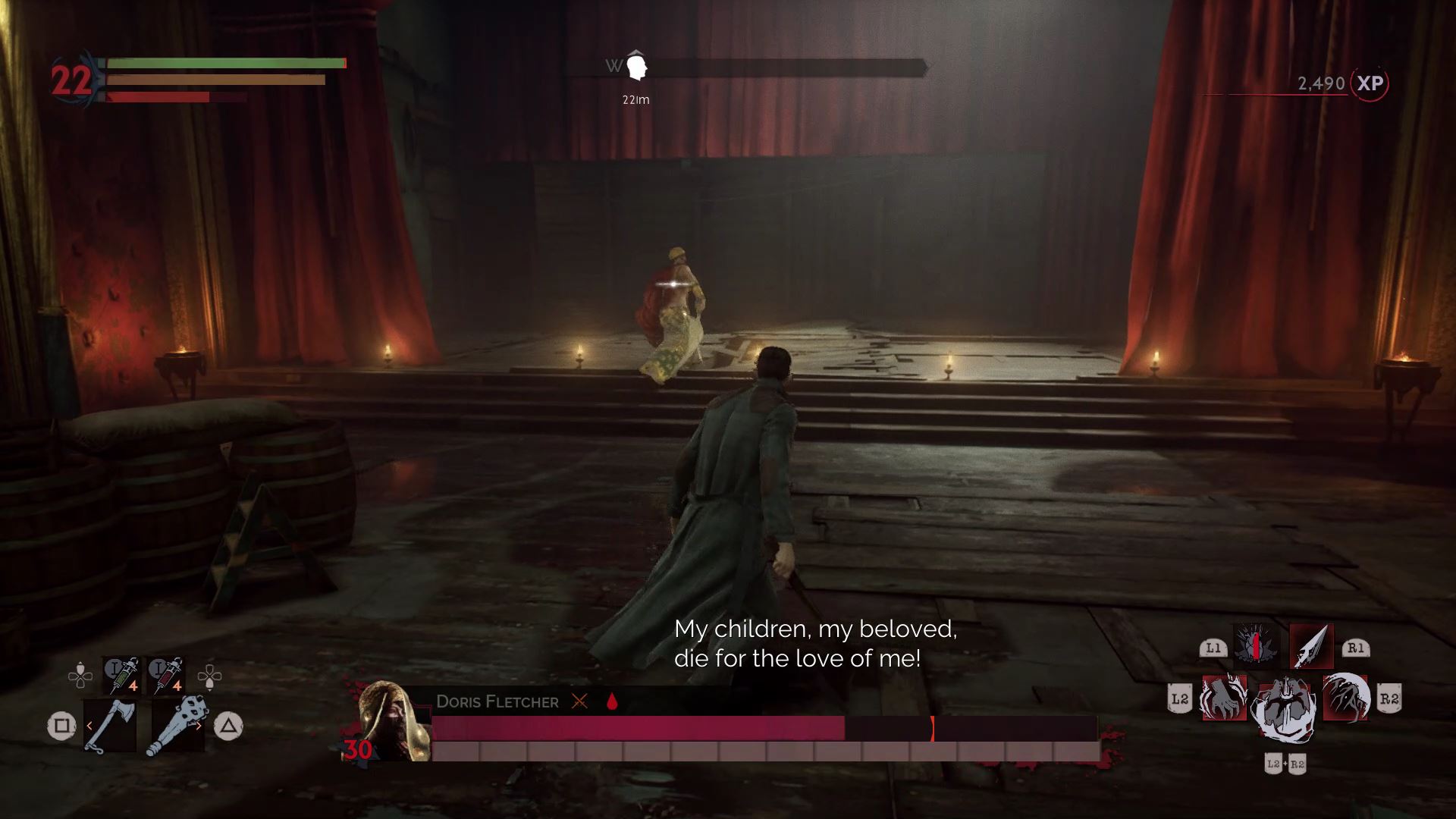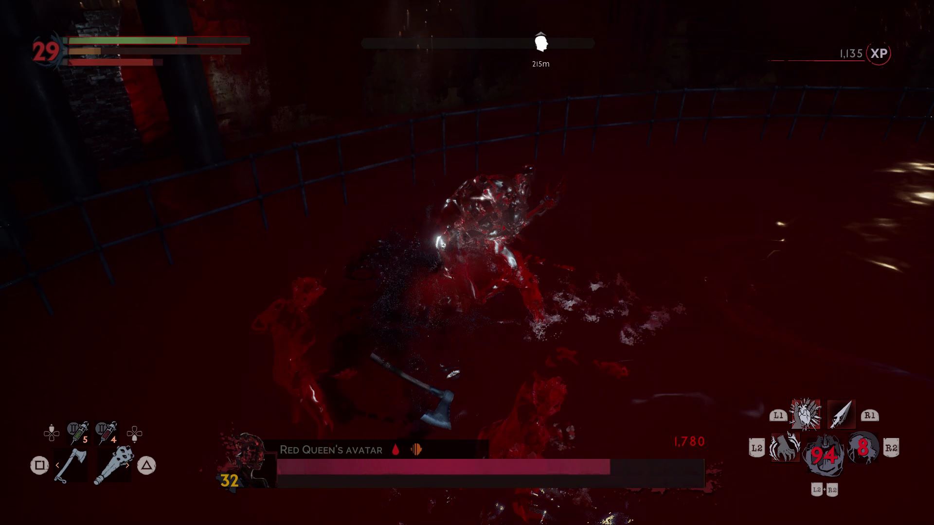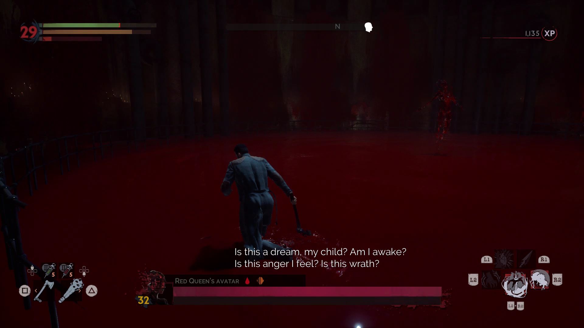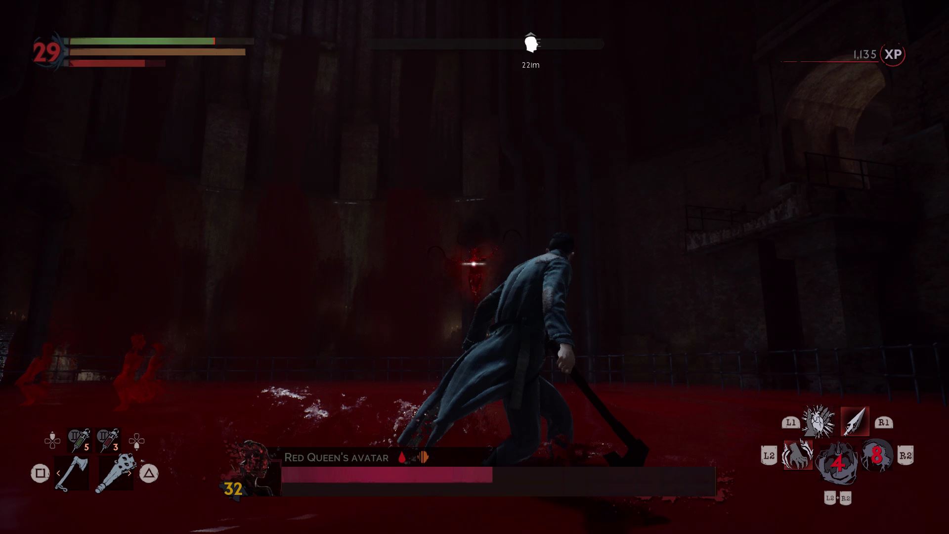 The first phase is simple. Harriet fights just like Doris, but she doesn’t have nearly as much health. Before defeating her, drink her blood and fully recharge your blood meter. When she’s defeated, the Red Queen will appear and the arena will fill with blood.