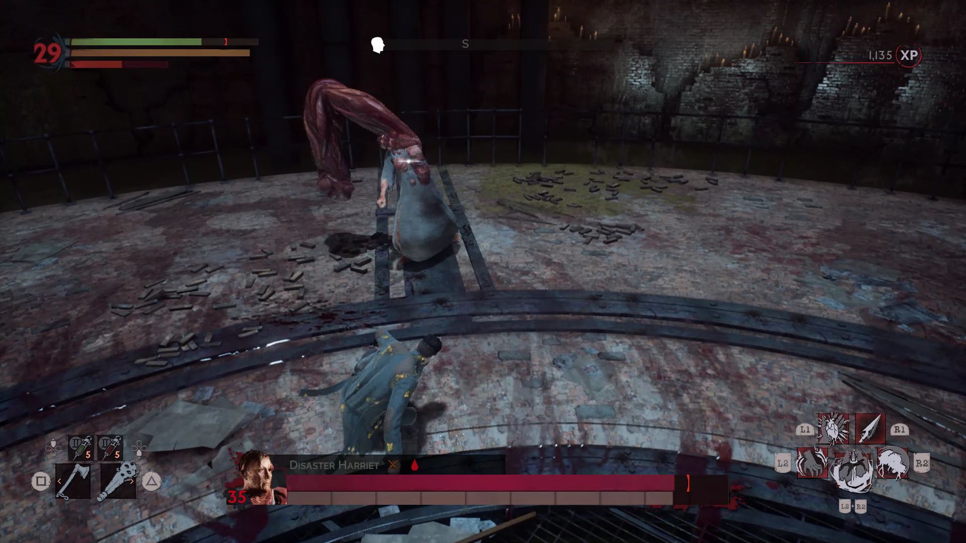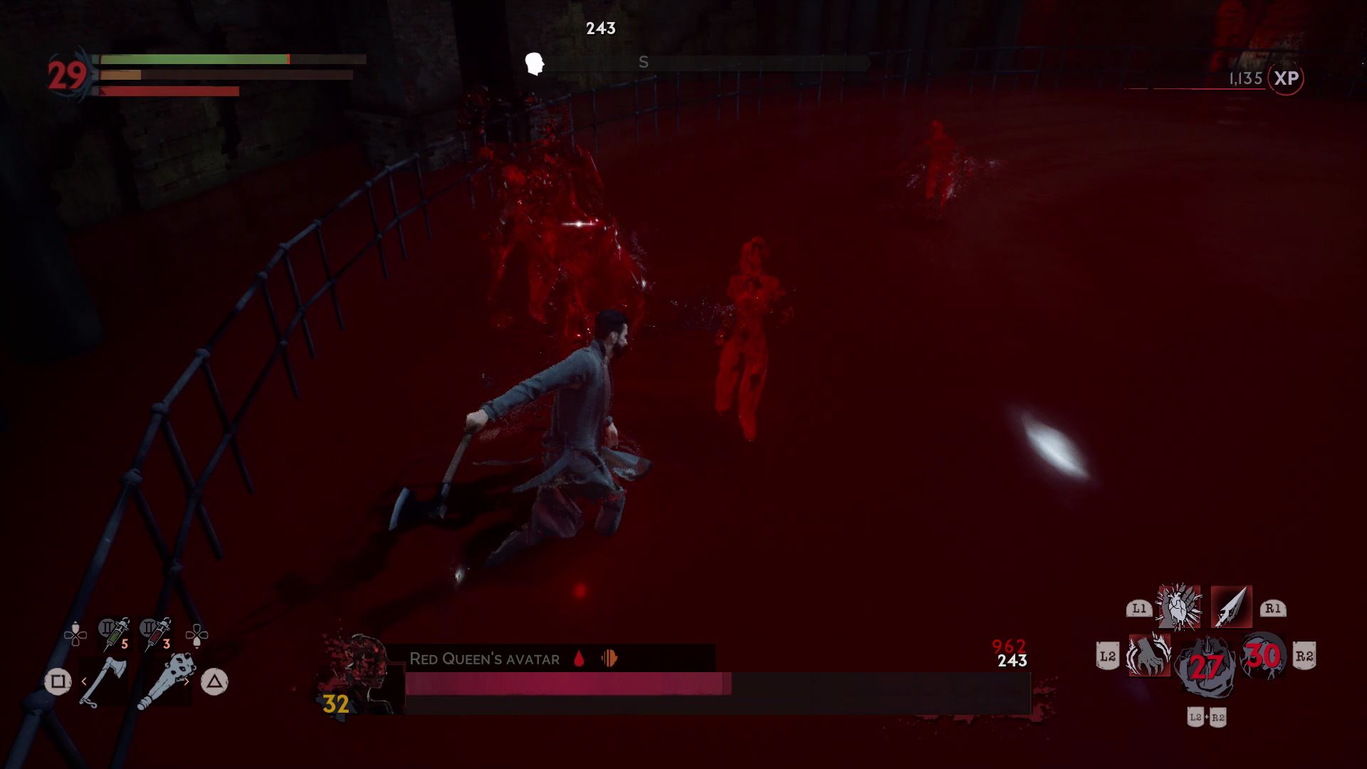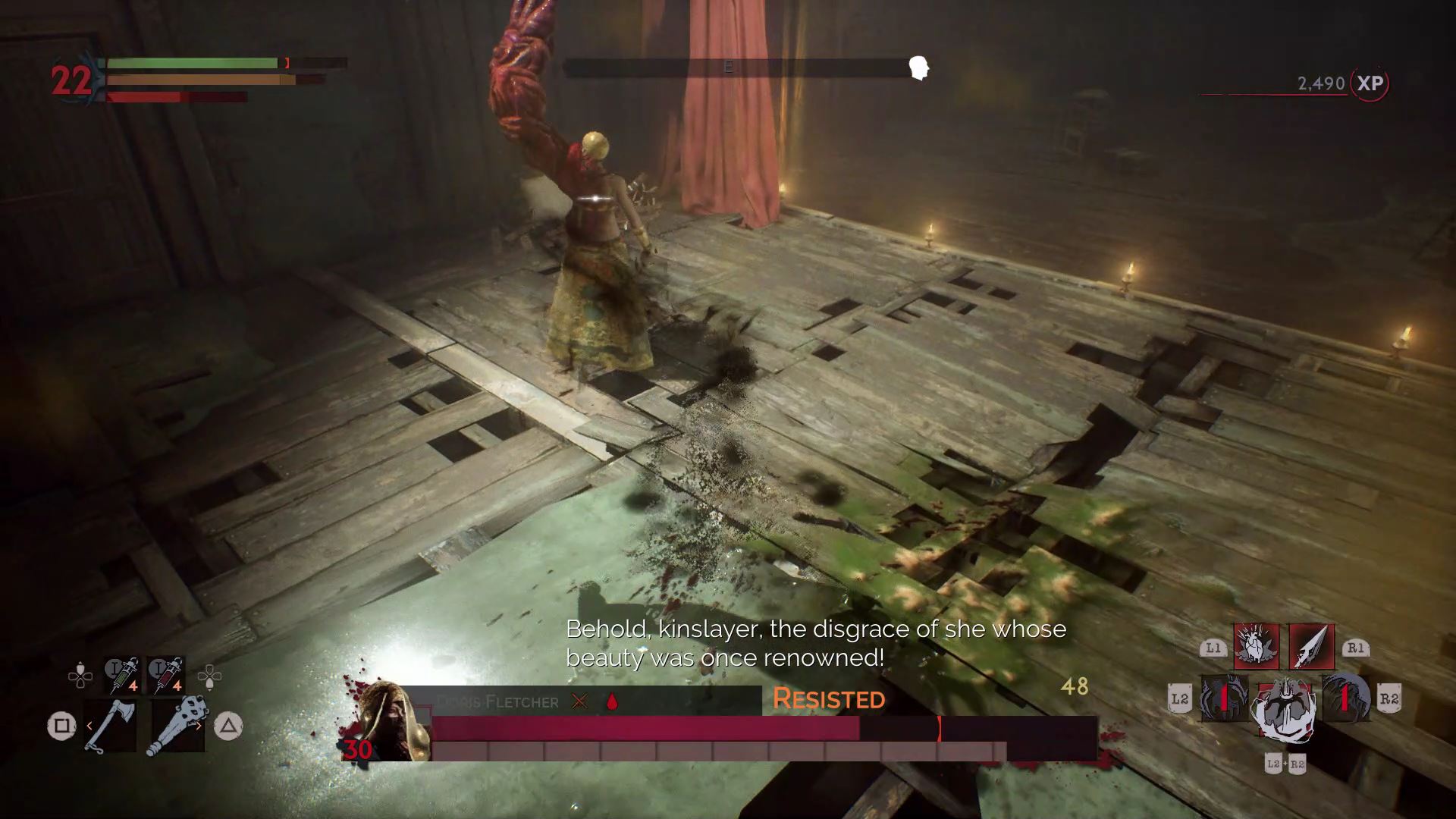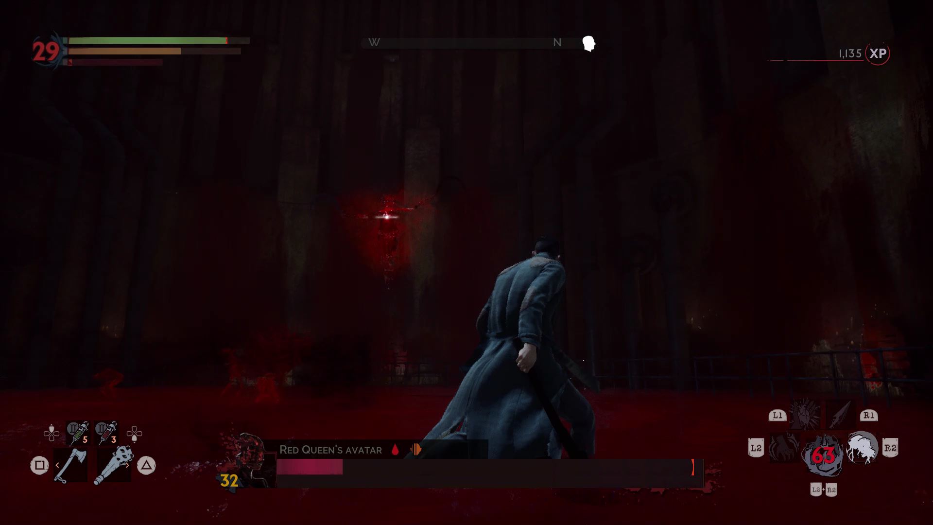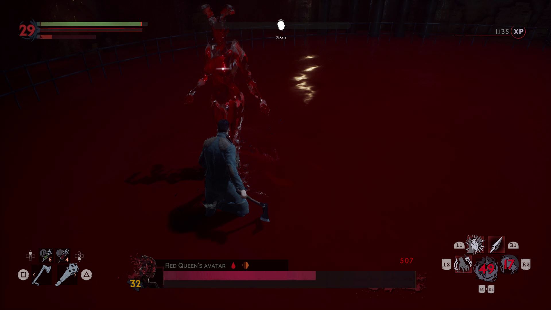 The first phase is simple. Harriet fights just like Doris, but she doesn’t have nearly as much health. Before defeating her, drink her blood and fully recharge your blood meter. When she’s defeated, the Red Queen will appear and the arena will fill with blood.