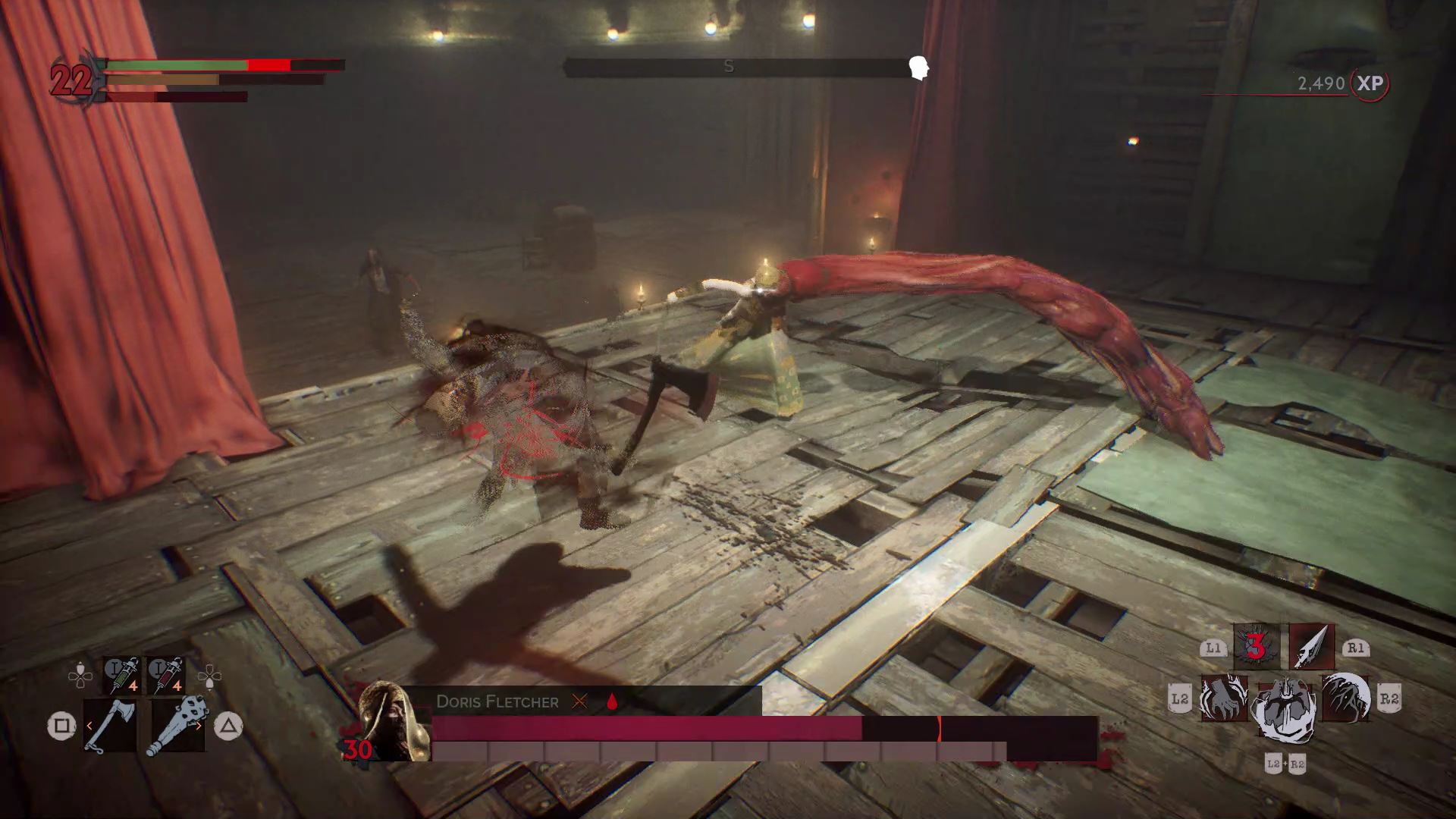 The boss of the theater isn’t too much trouble in her first phase. It isn’t until she reveals her Ichor form that she becomes a deadly opponent. Time your dodge just right to go through her spinning slimy arm attack — and watch out for the poison she spits. Dodge backwards away from her, and wait for your chance to attack.