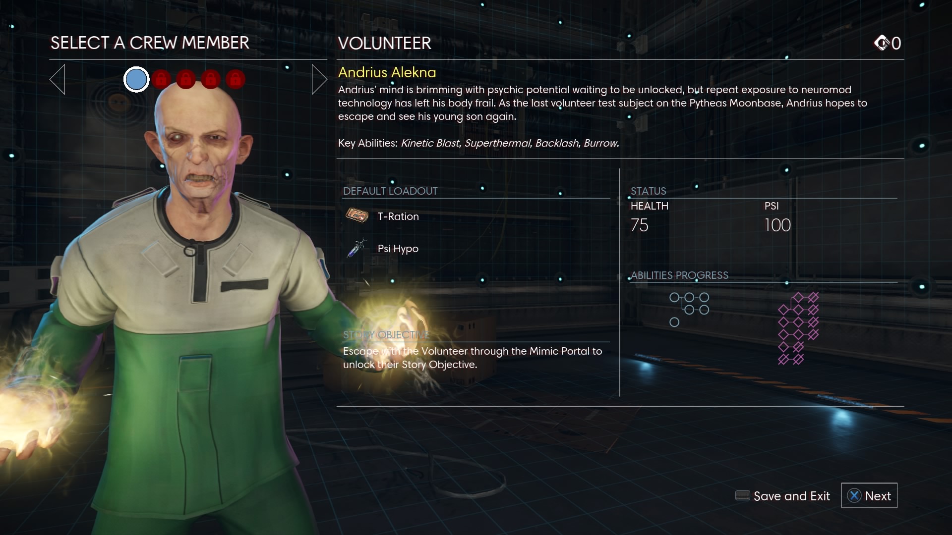 The first playable character you have available in the Mooncrash DLC is the Volunteer — named Andrius Alekna, you’ll need to use psychic powers and your scavenging skills to escape the base with your life. The simulation changes every single time, but some constants remain the same.