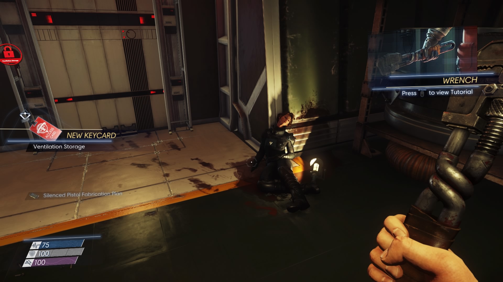 When you arrive in the simulation, collect the keycard and the Silenced Pistol fabrication plans from the dead body. These are always on this body. You’ll want to fabricate a pistol on your second playthrough.