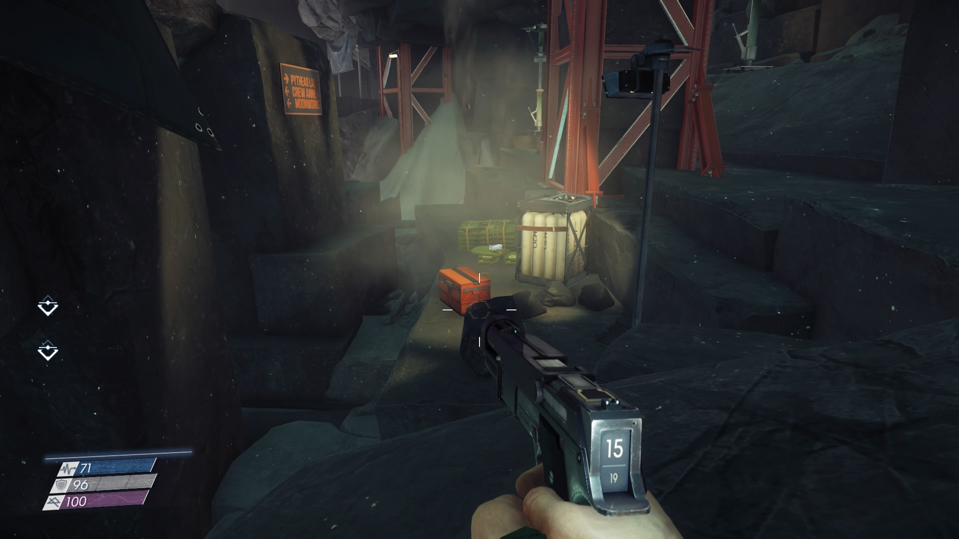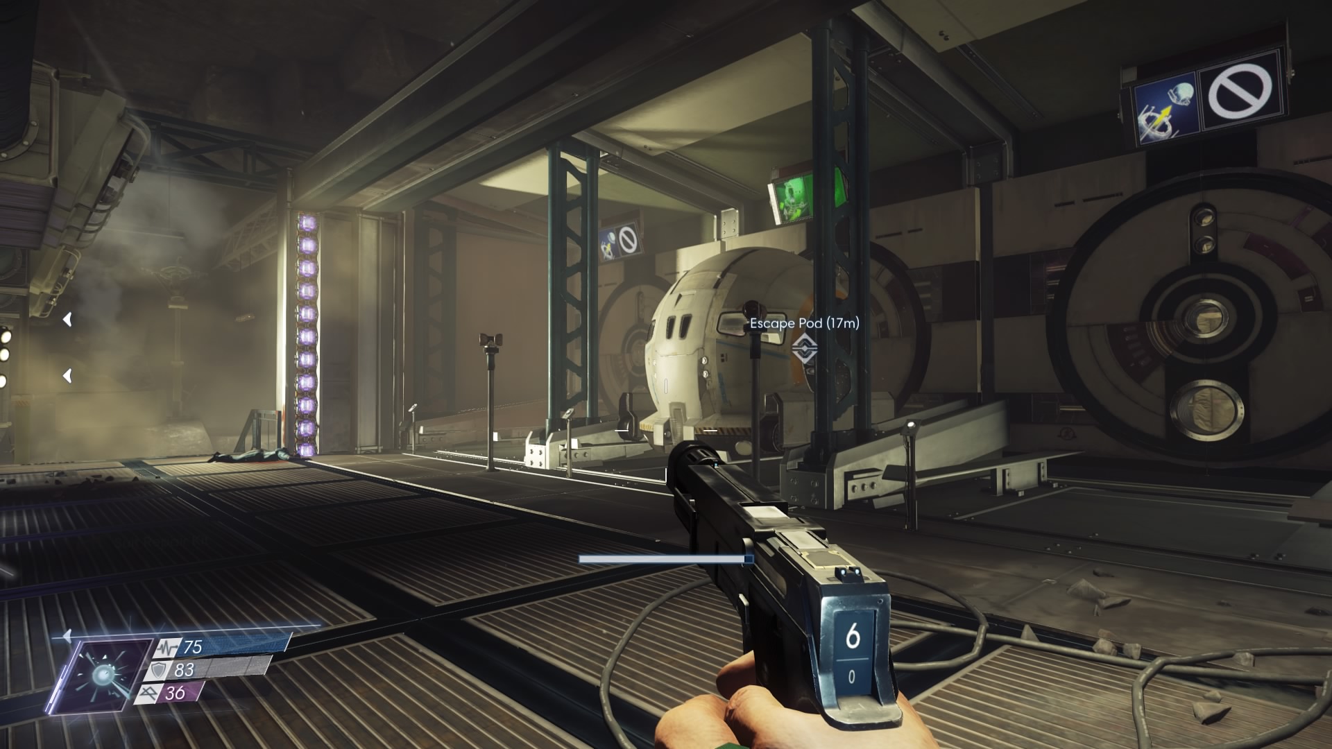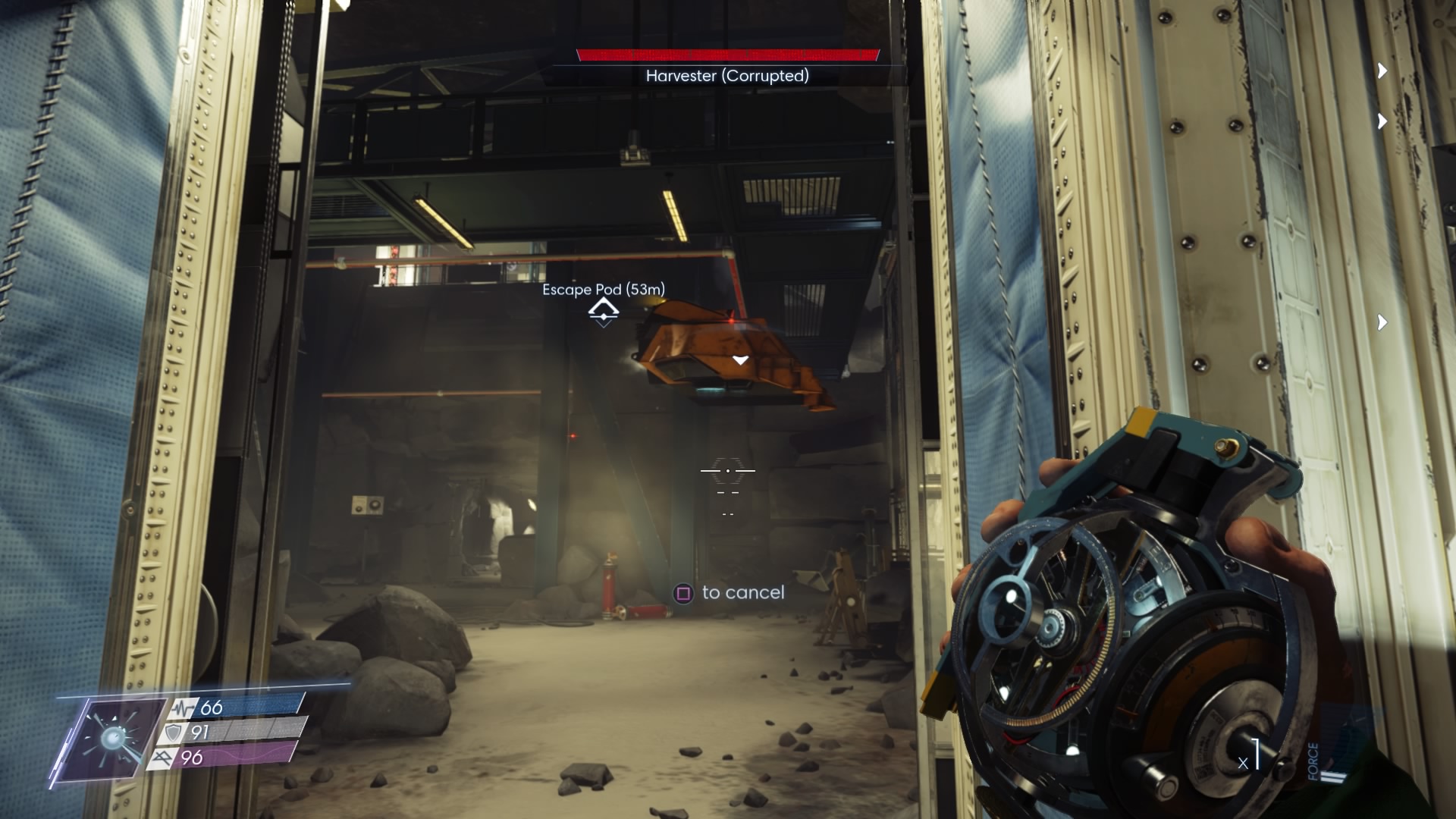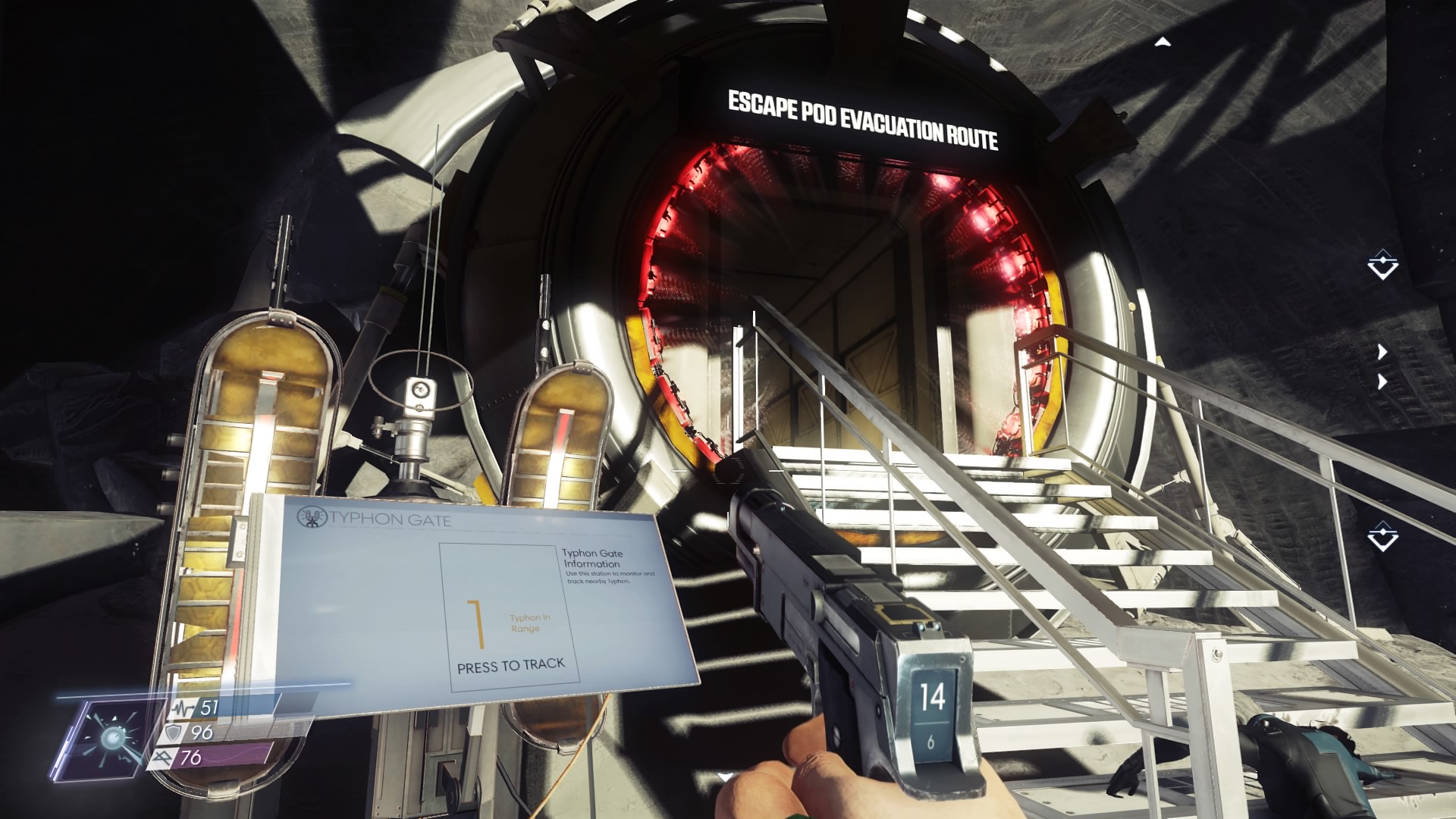 In the second room, you’ll find your first Typhon Gate. These gates block progress as long as Typhon organisms are detected in an area. Use the gates and all typhon in the zone will become marked on your HUD — it’s usually a good idea to rush toward these gates before exploring. You’ll get a better idea where those mimics are hiding after using it.