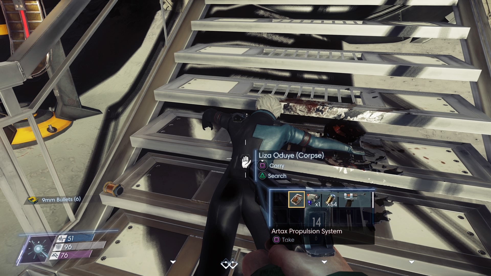 In the first exterior area, rush to the Typhon Gate in the back-left corner and scan the area. You probably don’t have EMP yet, so hunt to Typhon Mimics that are marked nearby to unlock the path to the crater. When the area is clear, you can safely search all the bodies.
