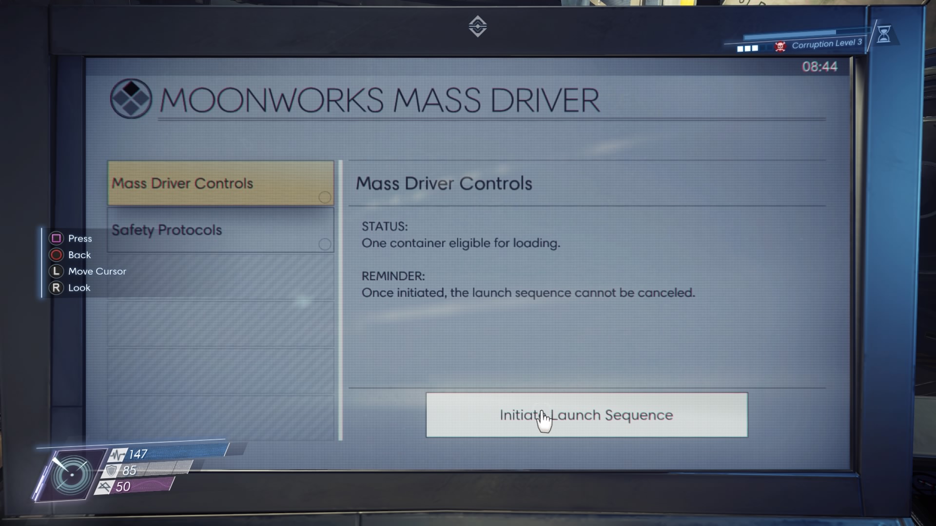 - Deposit all the items you need in the cargo container box mounted on the wall. When all the items are loaded, travel upstairs to the Mass Driver room. Clear the enemies inside and enter the Control Room to begin the launch sequence.