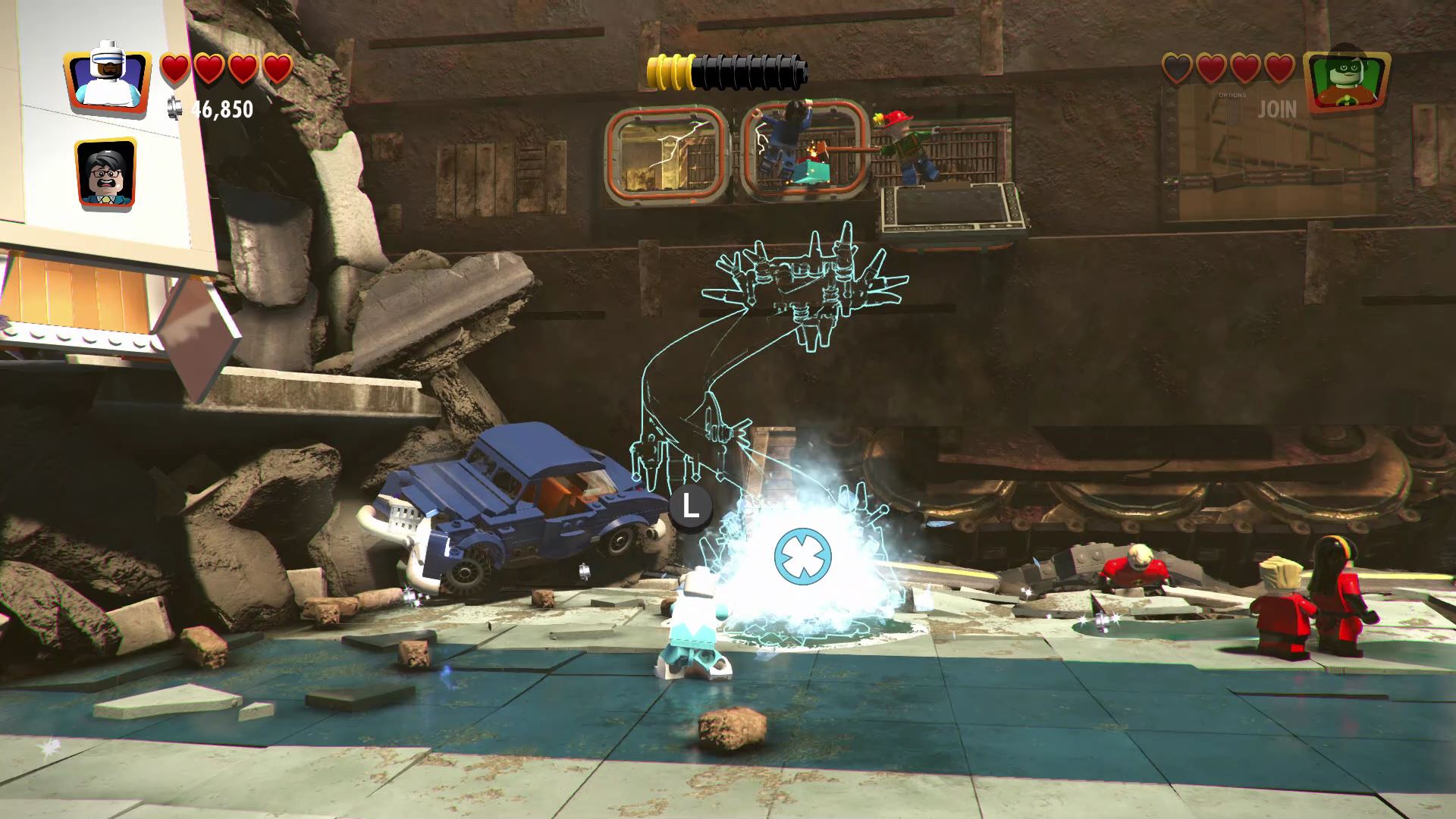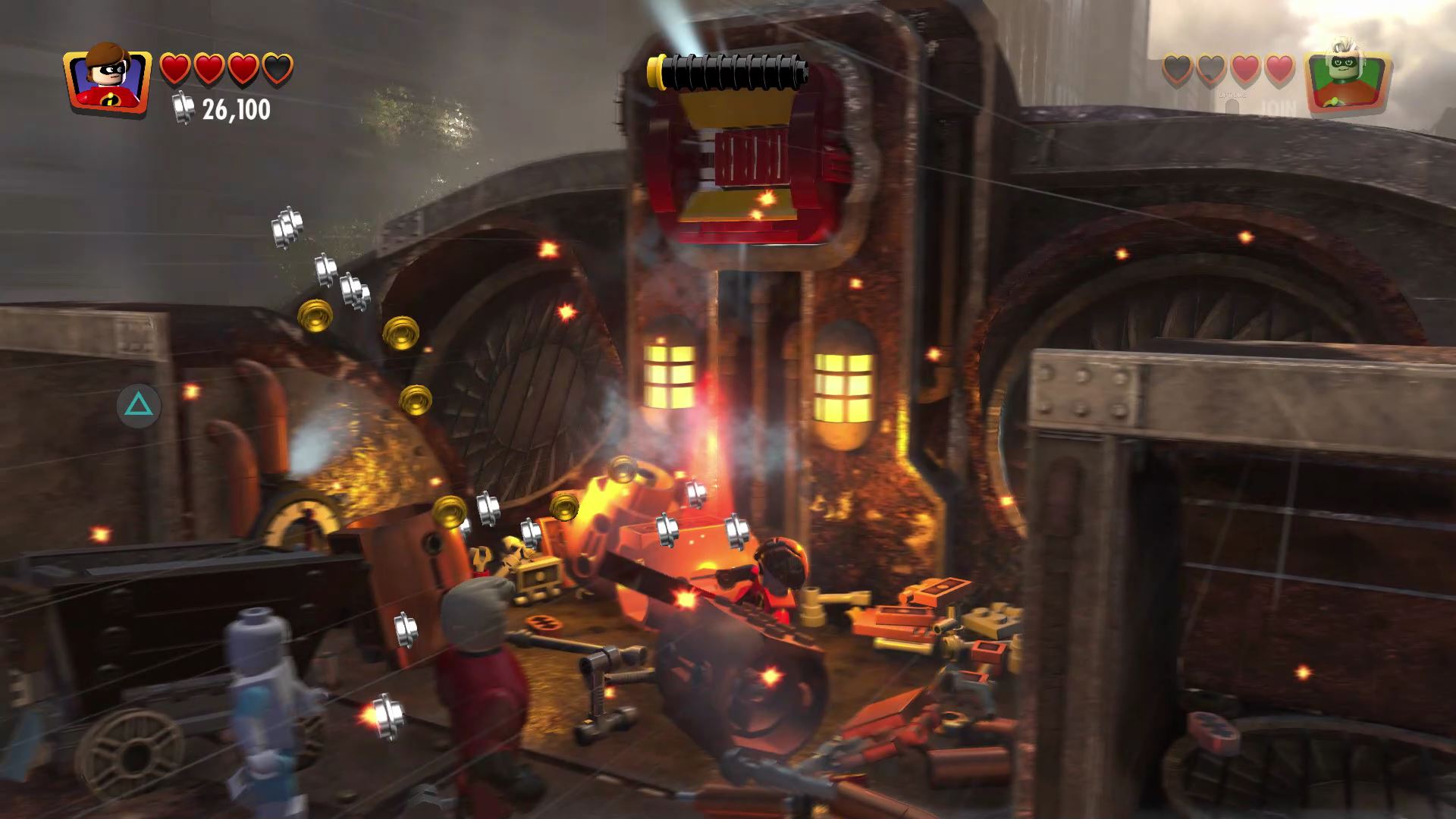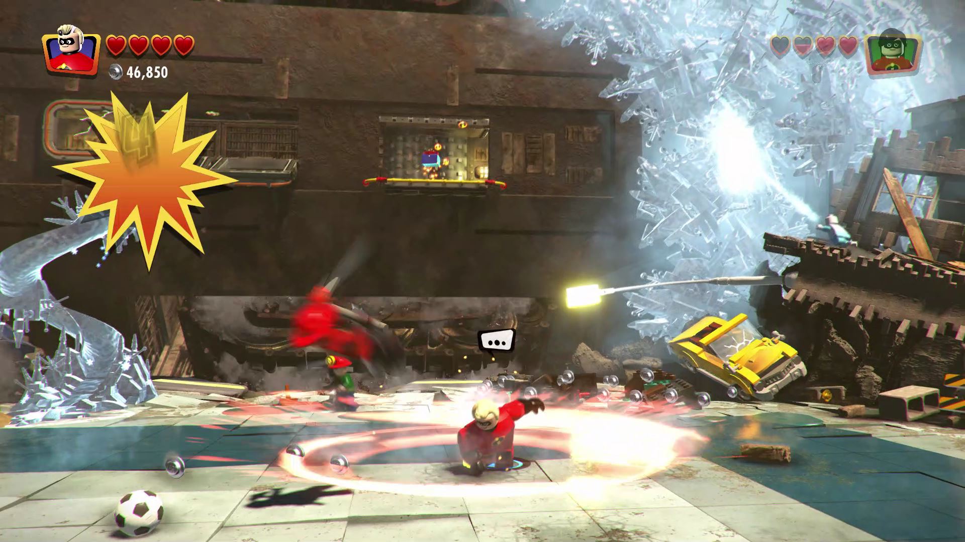 Once you defeat all the incoming bad guys, a business man in a car will get launched into the drill machine. Swap to Frozone and create an ice slide under him to save the day (and get a third Power Brick) – to reach the last Power Brick, swap to Bob and stand near the glowing Incredible Marker. Press [Circle / B] near one of the kids to pick them up, then hold the attack button [Square / X] to target and throw them! Toss them up to the Power Brick in the drill.