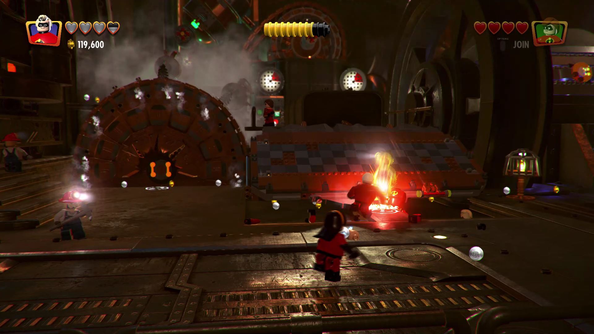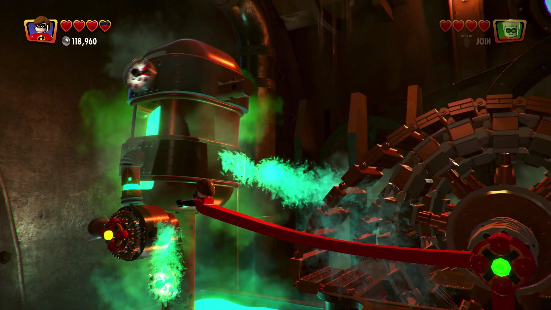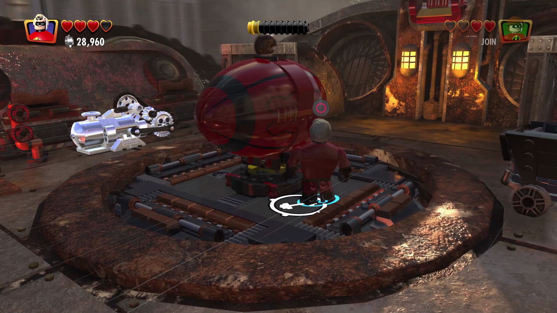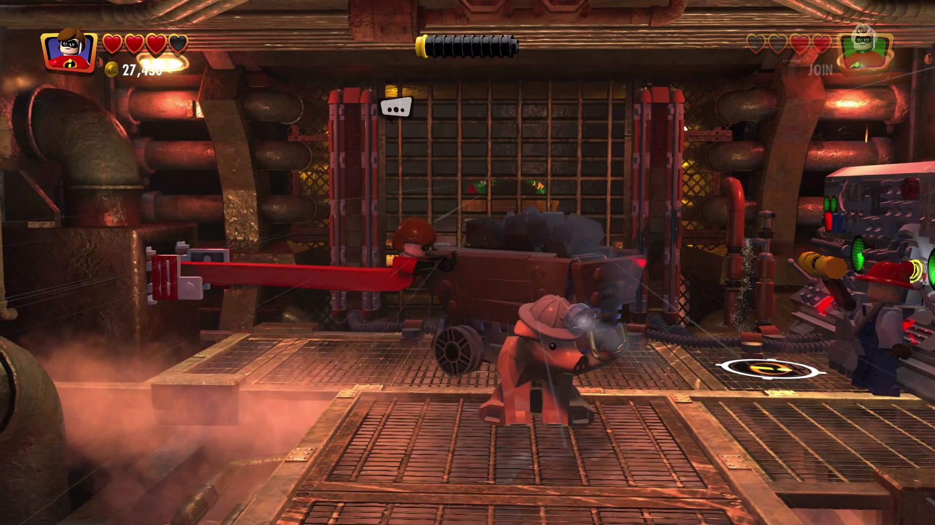 Swap to Elastigirl and destroy the glowing LEGO engine, then press [Circle / B] to interact with the Elastigirl Stretch Spot. This allows you to take control of Elastigirl and stretch up into a vent! Go inside the vent and smash through the cart to reach the button. Press it and then smash the minecart that appears – build it up into an Incredibles Team Marker. Stand on it with Elastigirl and press [Circle / B] then interact with Mr. Incredible to throw!