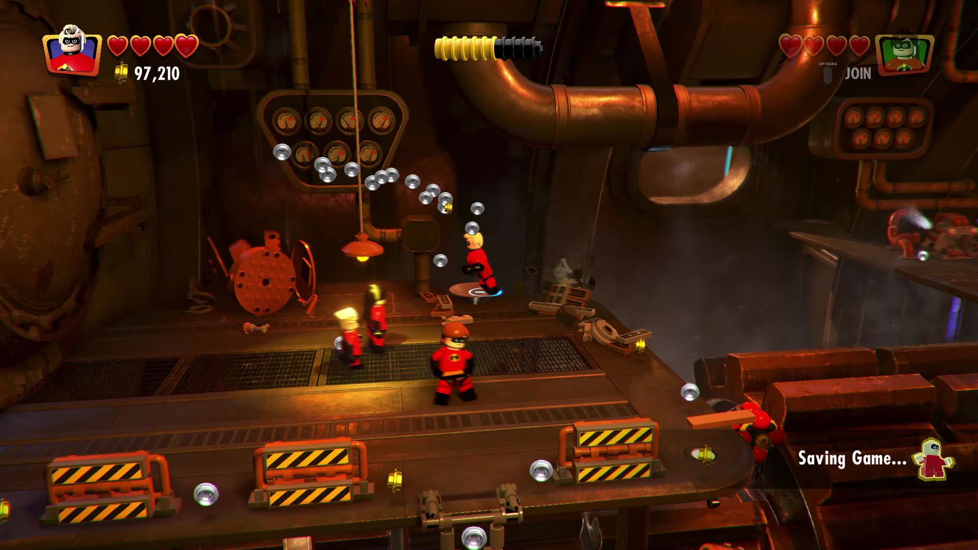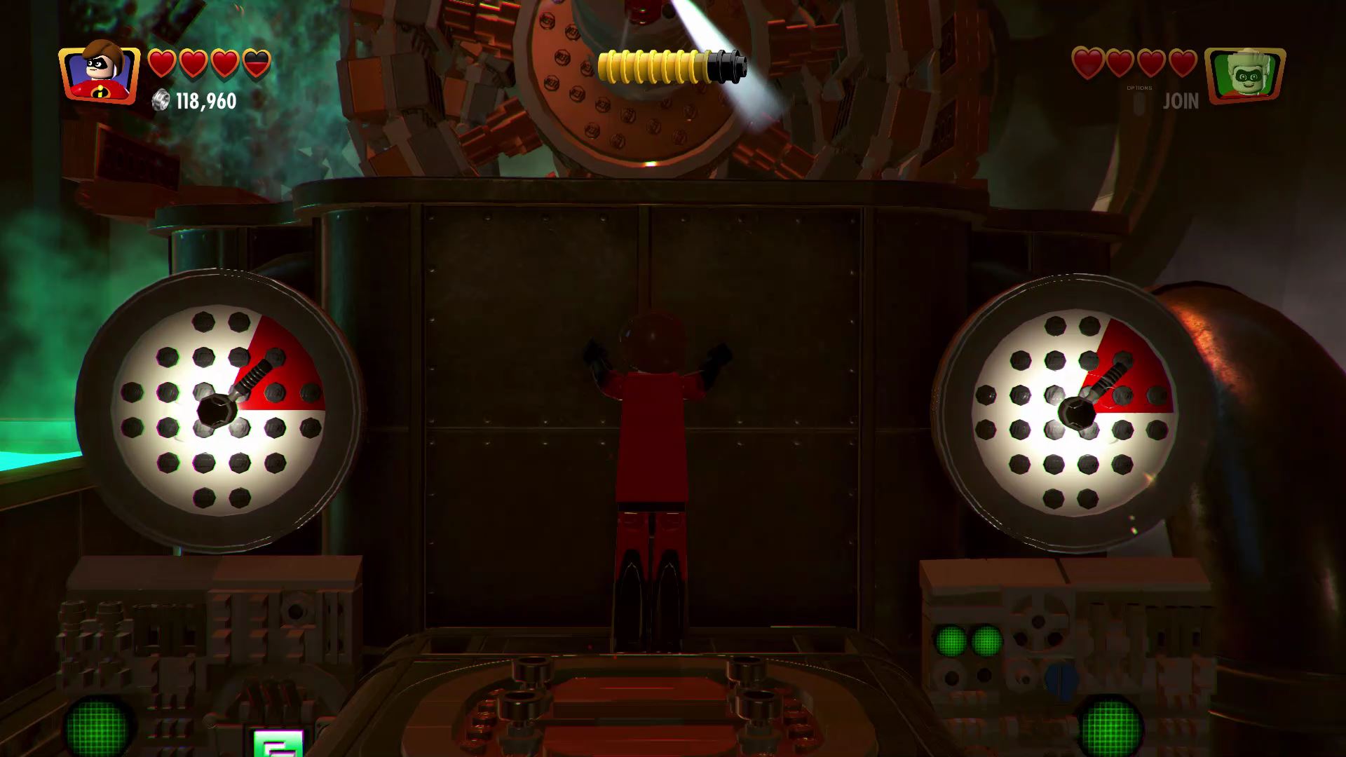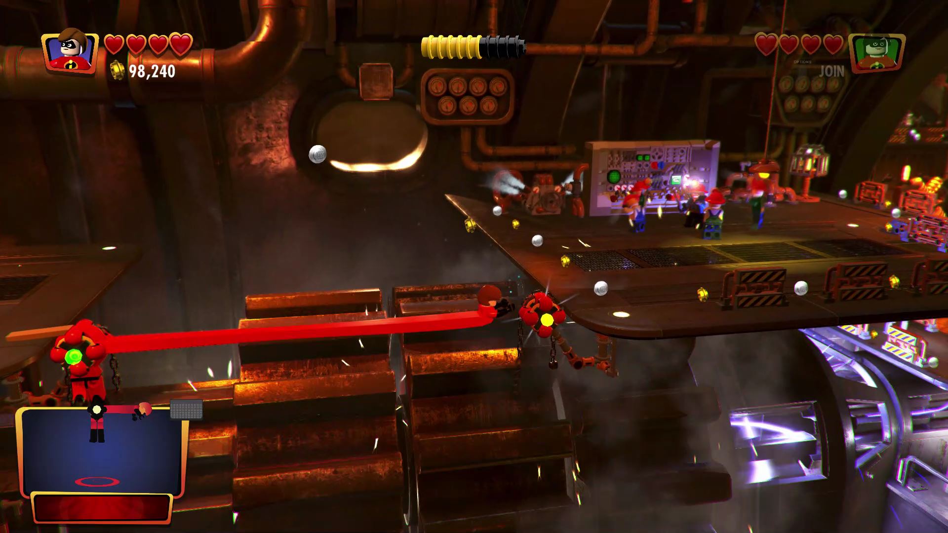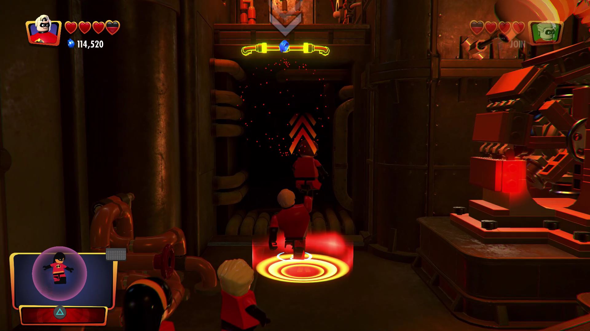 PART 3: Inside The Drill – In the last section, you’ll have the whole family! Stuck inside the massive Under-Miner drill, it’s time to put an end to this out-of-control machine. Drop down with Elastigirl (Helen) and stretch up then across the gap to create a bridge for the family.