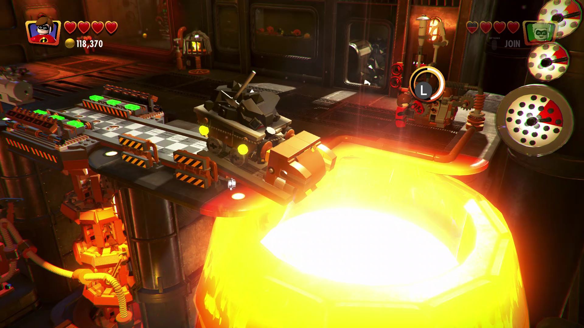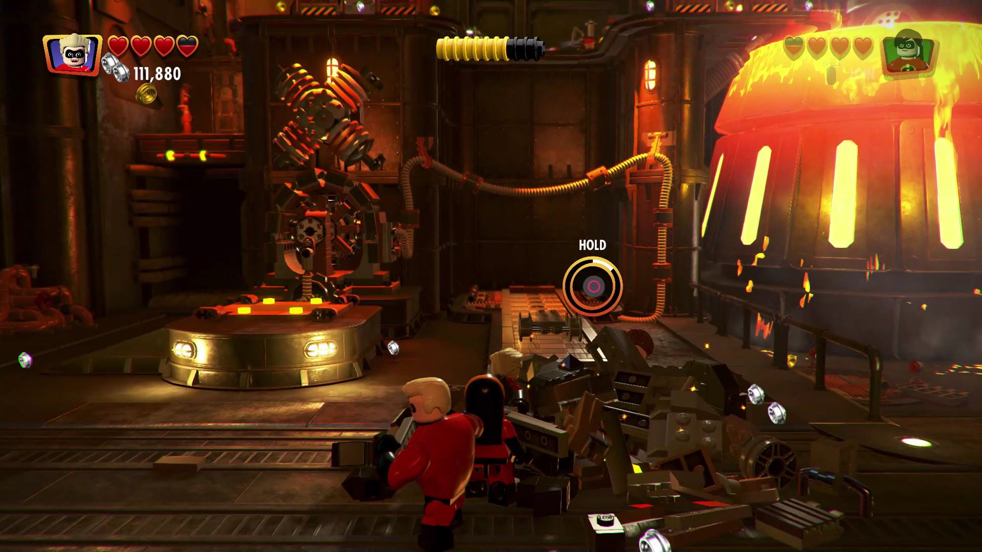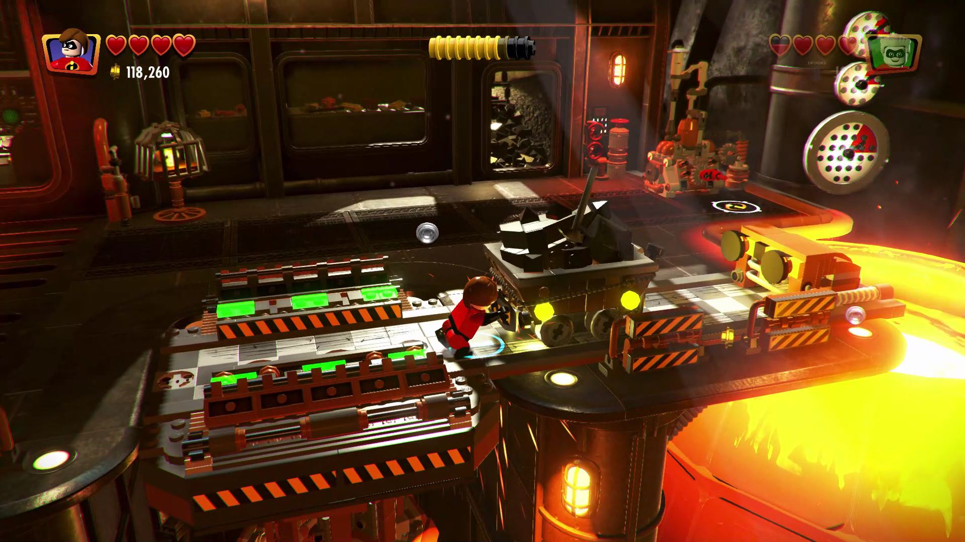 Combine Violet and Dash (activate Violet’s Bubble Power then use Dash) to activate the Bubble Spinner. To get up to the upper level, throw Helen up to the ledge with Bob. At the top level, smash the LEGO objects to construct a terminal, then push the cart to the right on the tracks. When the cart is near the furnace, use the switch you constructed to dump the coal.