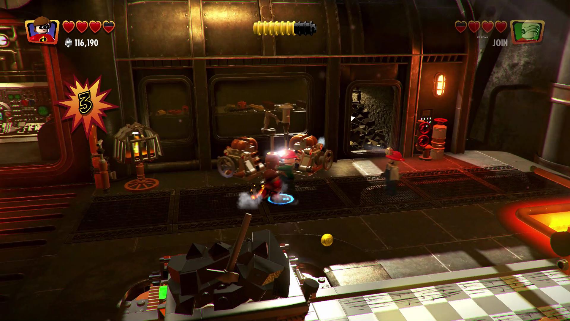 When Frozone appears, switch to him and hold [Circle / B] to shoot a beam of ice at the blue outline on the spinning gear. Once you hit the marker, hold up on the D-Pad to slowly create an ice sculpture of a hand, stopping the gear in its tracks. You’ll reveal Cracked LEGO Walls. Mr. Incredible doesn’t punch these walls, he runs straight through them! Run into all the cracked walls here.