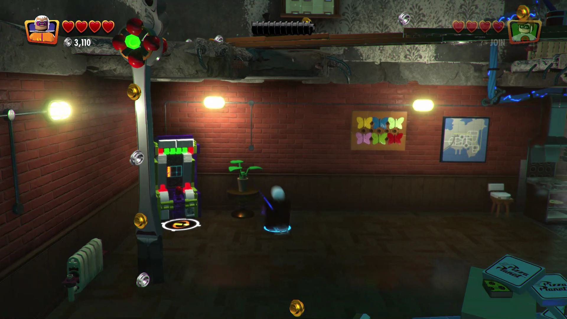 The first Power Brick is to the left. Go into the kitchen and find the Stretch Marker in the corner. Stretch up to create a “rope” for Reflux so he can climb up! Cross the wooden beams, then use Reflux’s acid spit to melt the gold LEGO object in the corner. When that’s destroyed, the first Power Brick can be collected down below.