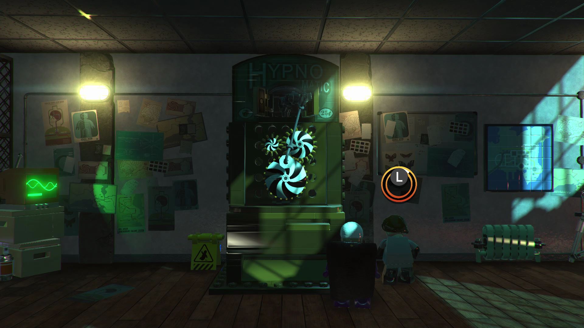 For the second Power Brick, smash all the glowing LEGO objects on the desk in the center. Take the red crank, and use it on the machine on the right-most wall. Turn the crank, and the machine will spit out a Power Brick!