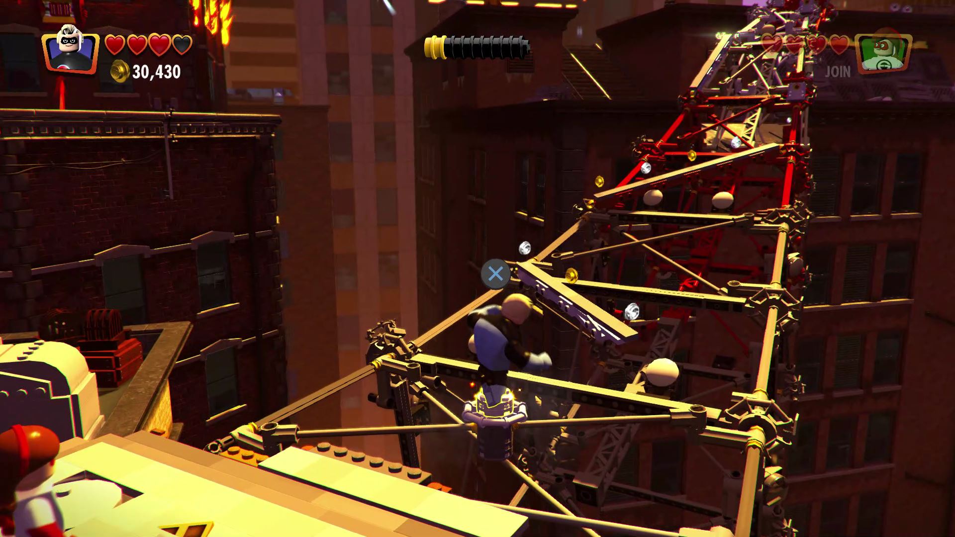 PART 1: Mime Chase – The mime escapes from the rooftop party on a lift. To bring it back down, smash all the glowing LEGO umbrellas in the area. Construct the hopping bricks to the left, then use the hook to pull down the lift. Ride up using the lift switch, and move right. The mime is hiding behind a fence, while more mimes attack!