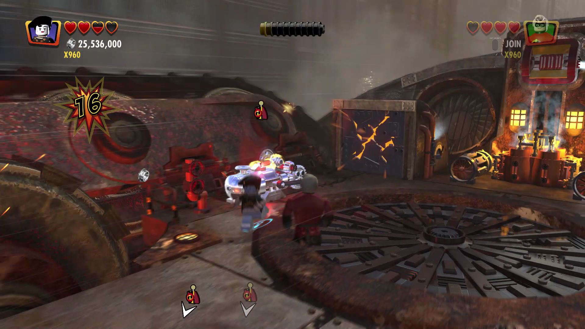 - Minikit #9: Further in the drill machine interior, find the control room behind glass. Use a Mind Controller (like Screenslaver) to take control of the bad guy inside and have them hit the big LEGO switch.
