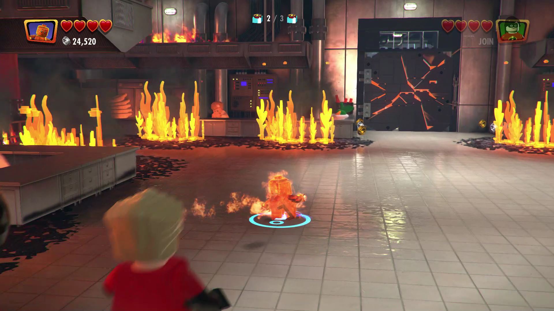 - Minikit #7: In the burning kitchen, blast through the cracked LEGO wall in the back, then smash the LEGO objects to create a pile of wood. Set the wood on fire with any burning character (Fire Jack-Jack) to melt the ice and free the minikit in the freezer.