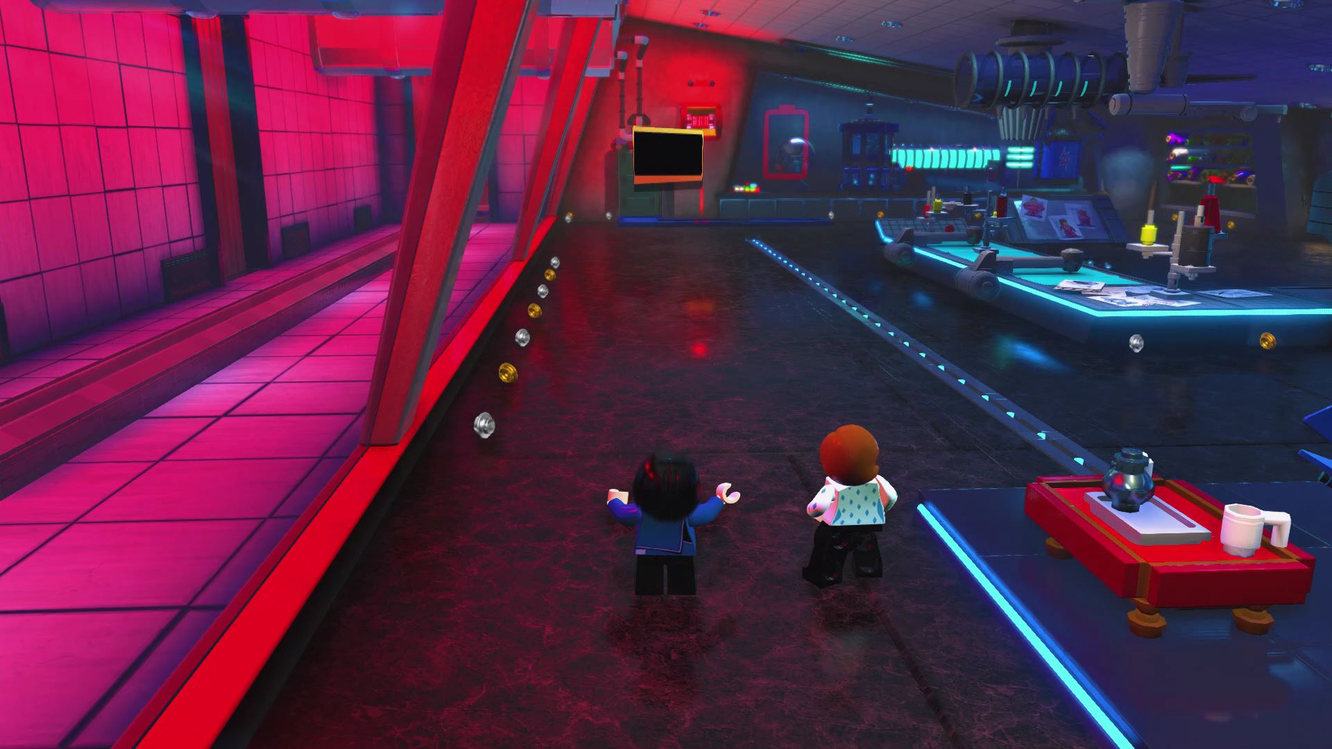 Beat up all the henchmen in the break room and use the switch on the far left wall. Now everyone can enter the secret lair! Go inside and smash the glowing LEGO furniture on the right to create a Charge Wheel. Hop in with Dash to recharge the generator – you can ride up now.