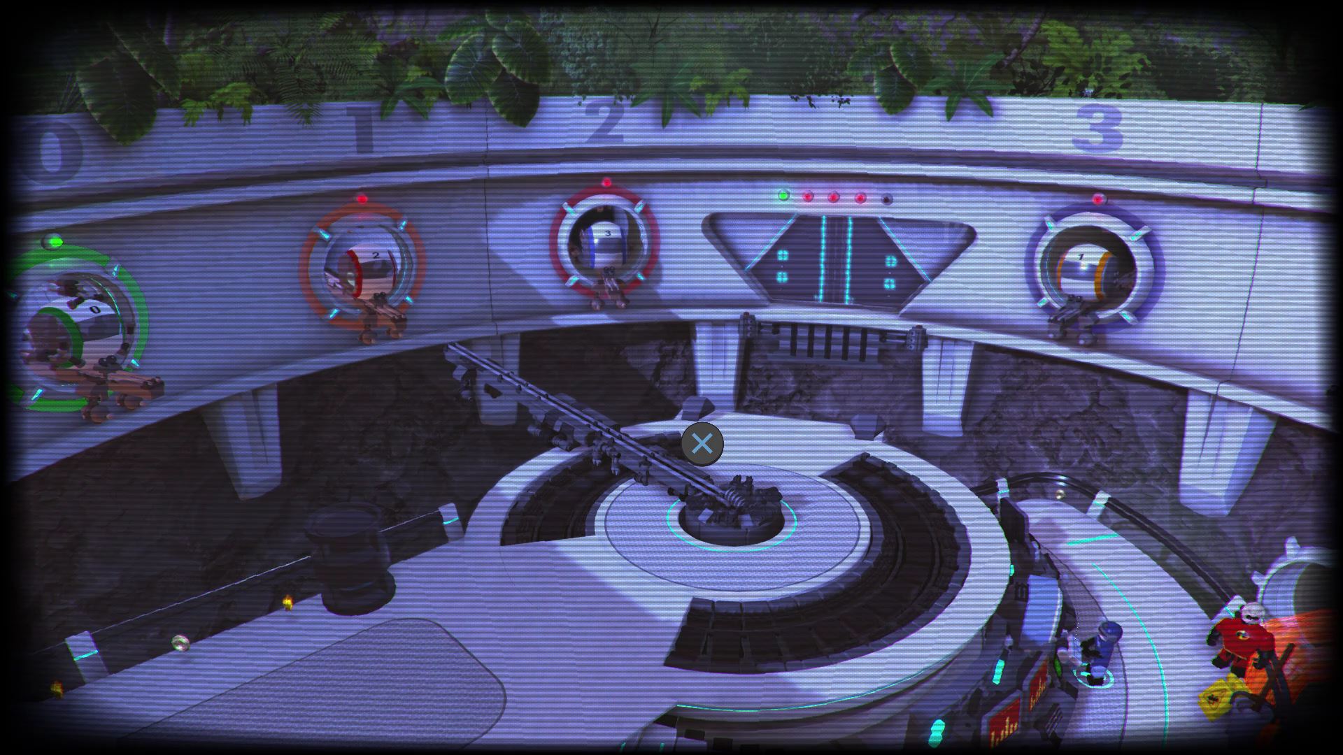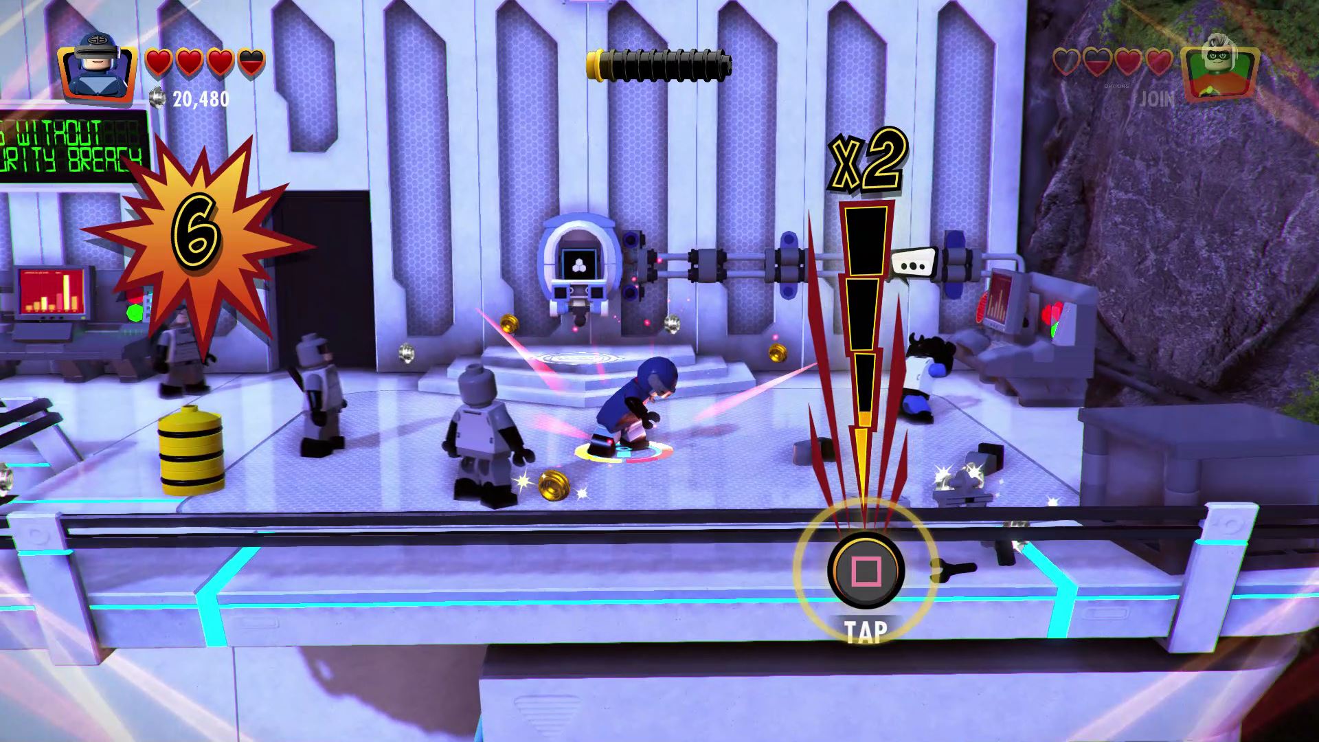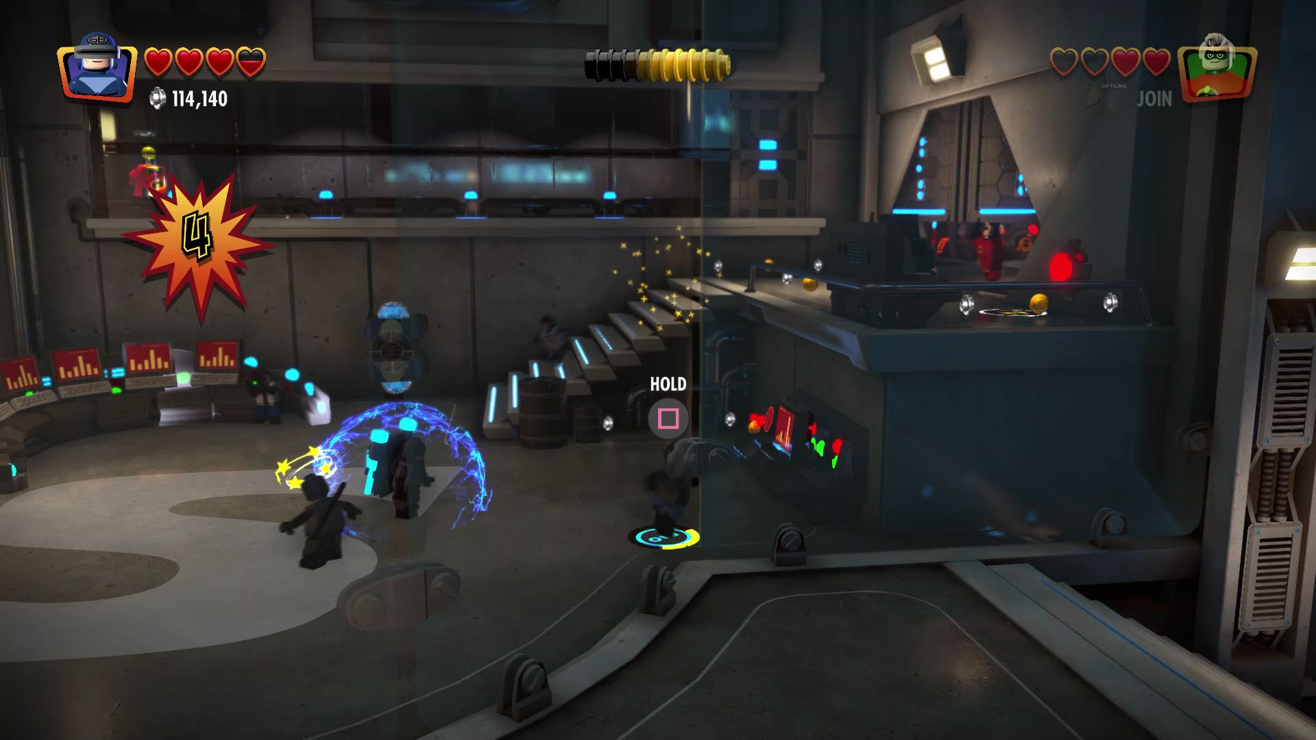 - Minikit #3: Fly up to the second floor balcony and use Mind Control to hit the switch behind the blue laser fence. Use Screen Slaver or any other mind-controlling character.