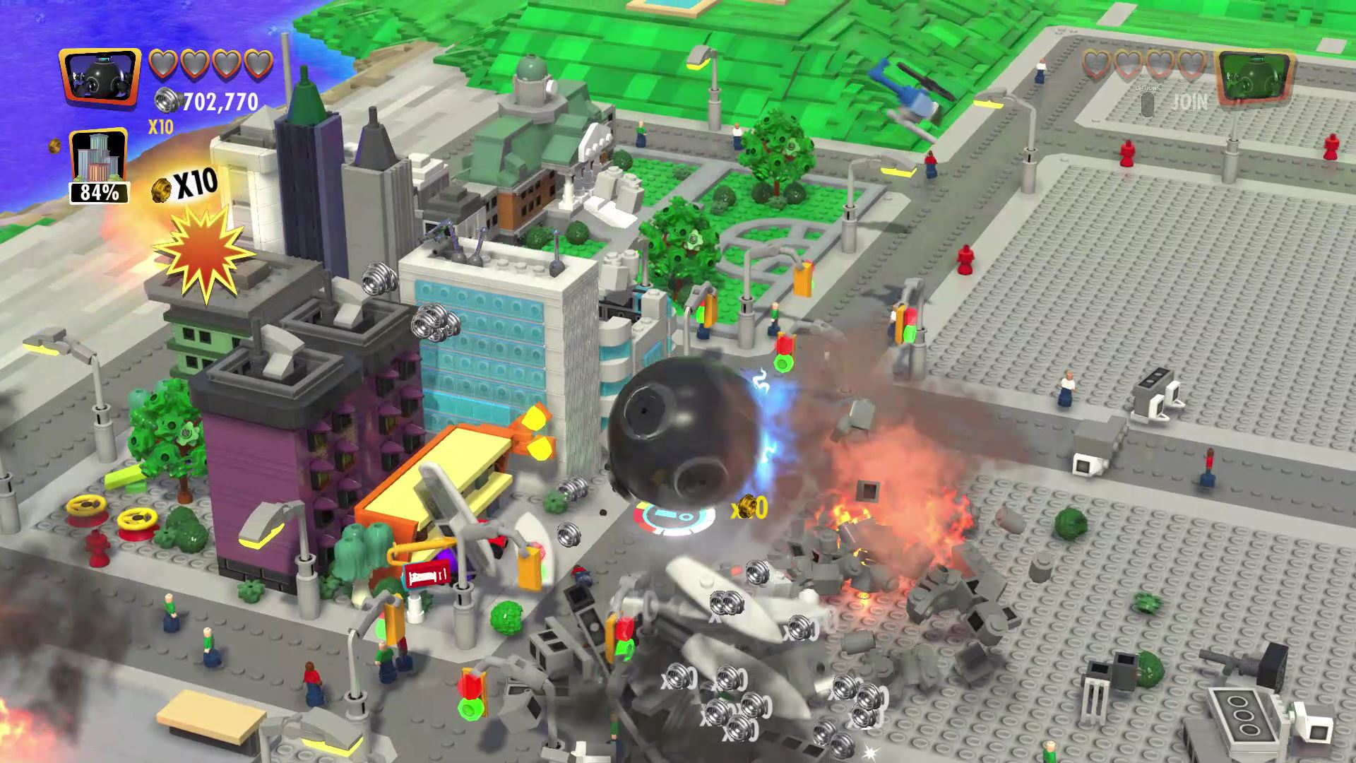 - Minikit #8: In the last section of the level, when you have to complete the Family Build, fly to the upper right to find this minikit. It’s just floating above the courtyard.