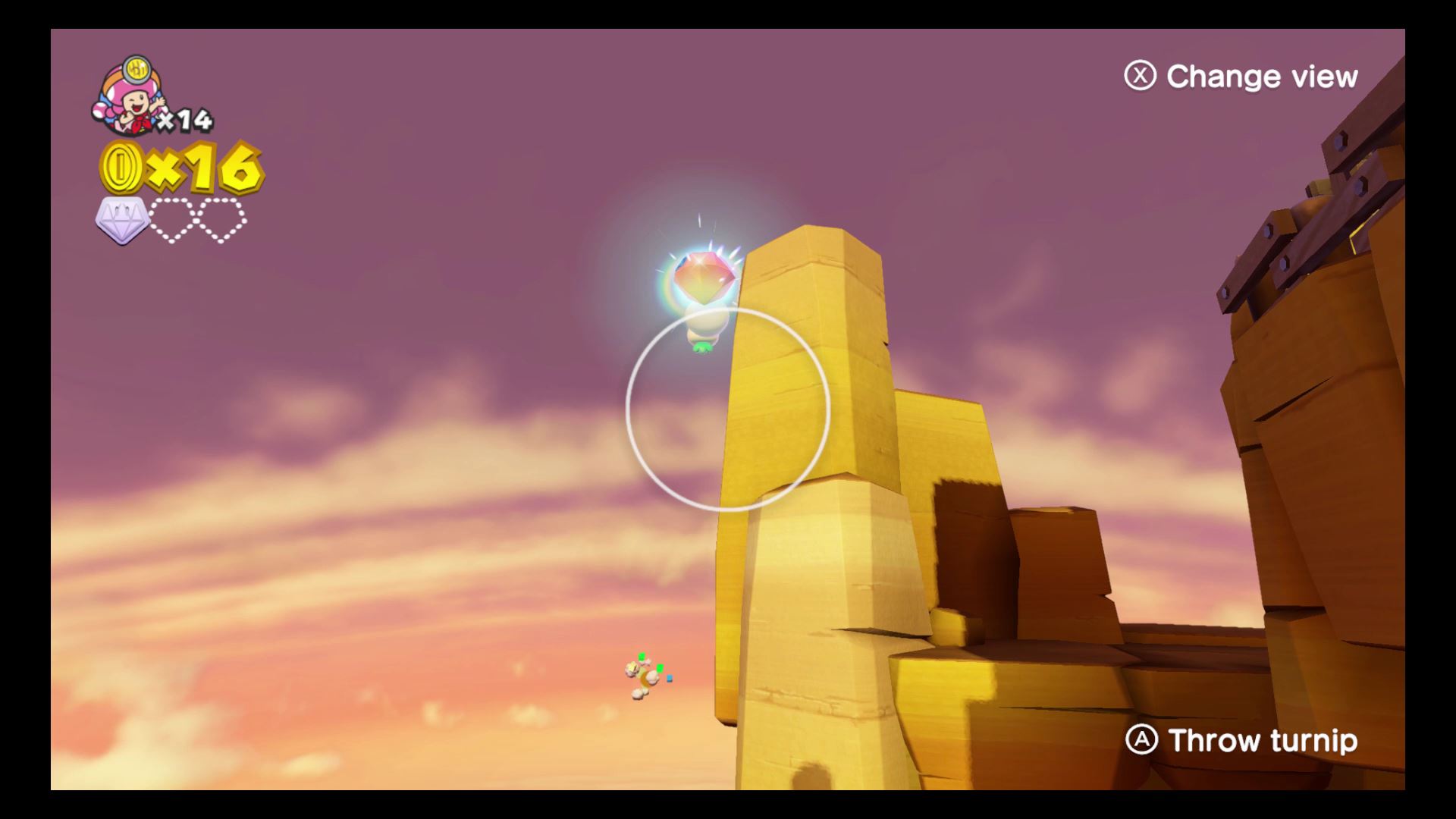- Super Gem #1: The first gem is visible from the start, behind a tall rock. Shoot a turnip at it to grab it after circling the starting area.