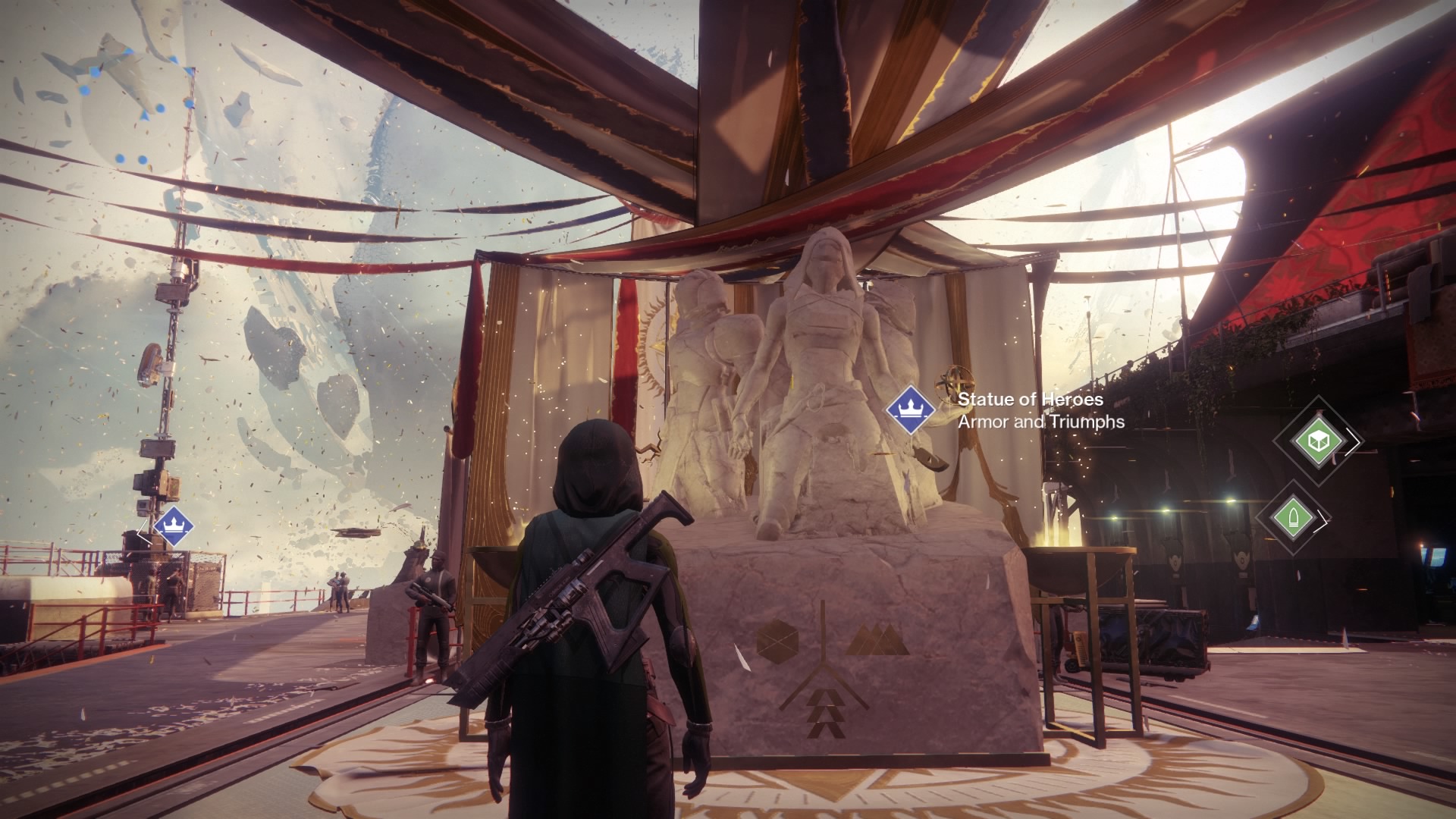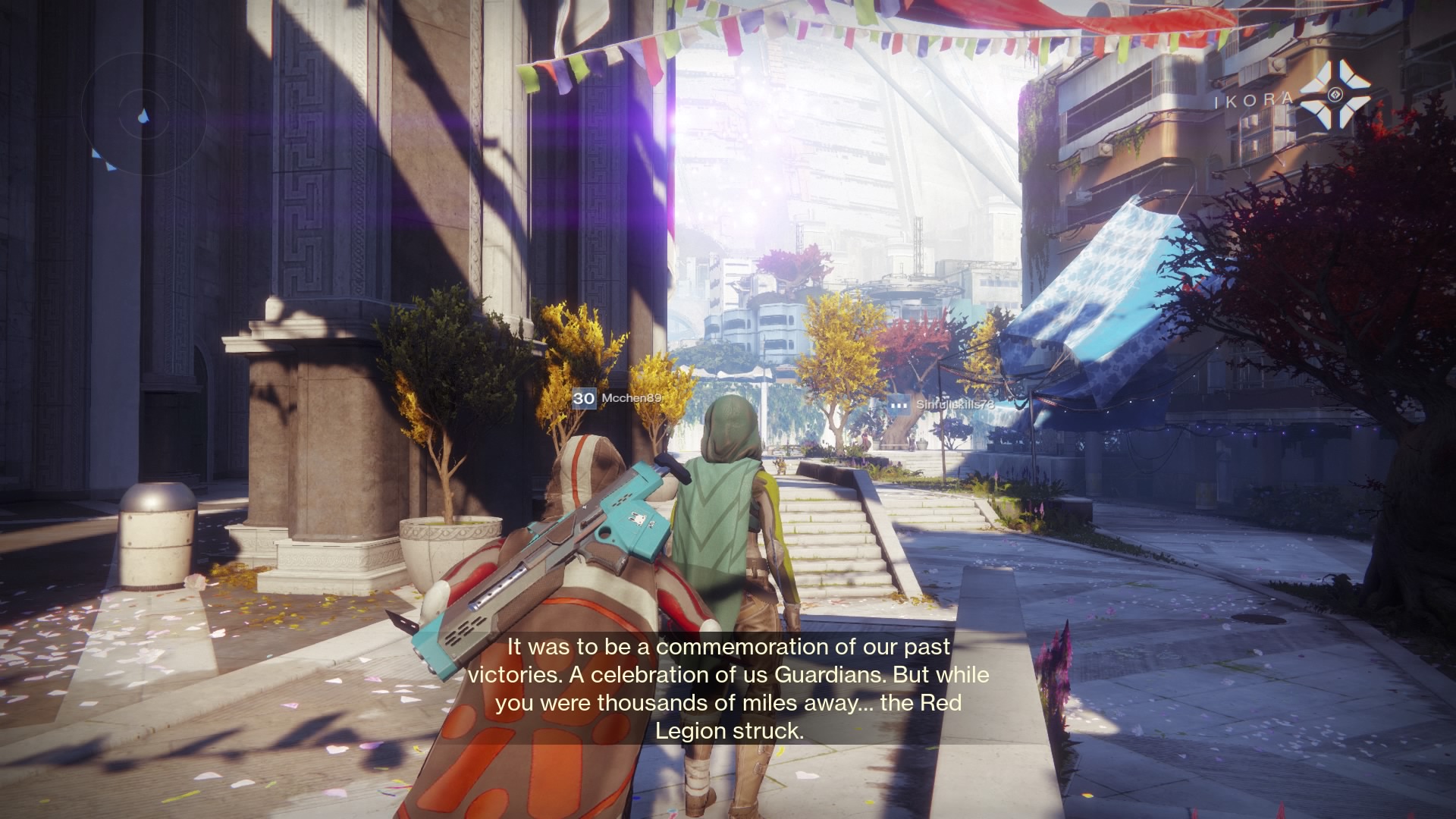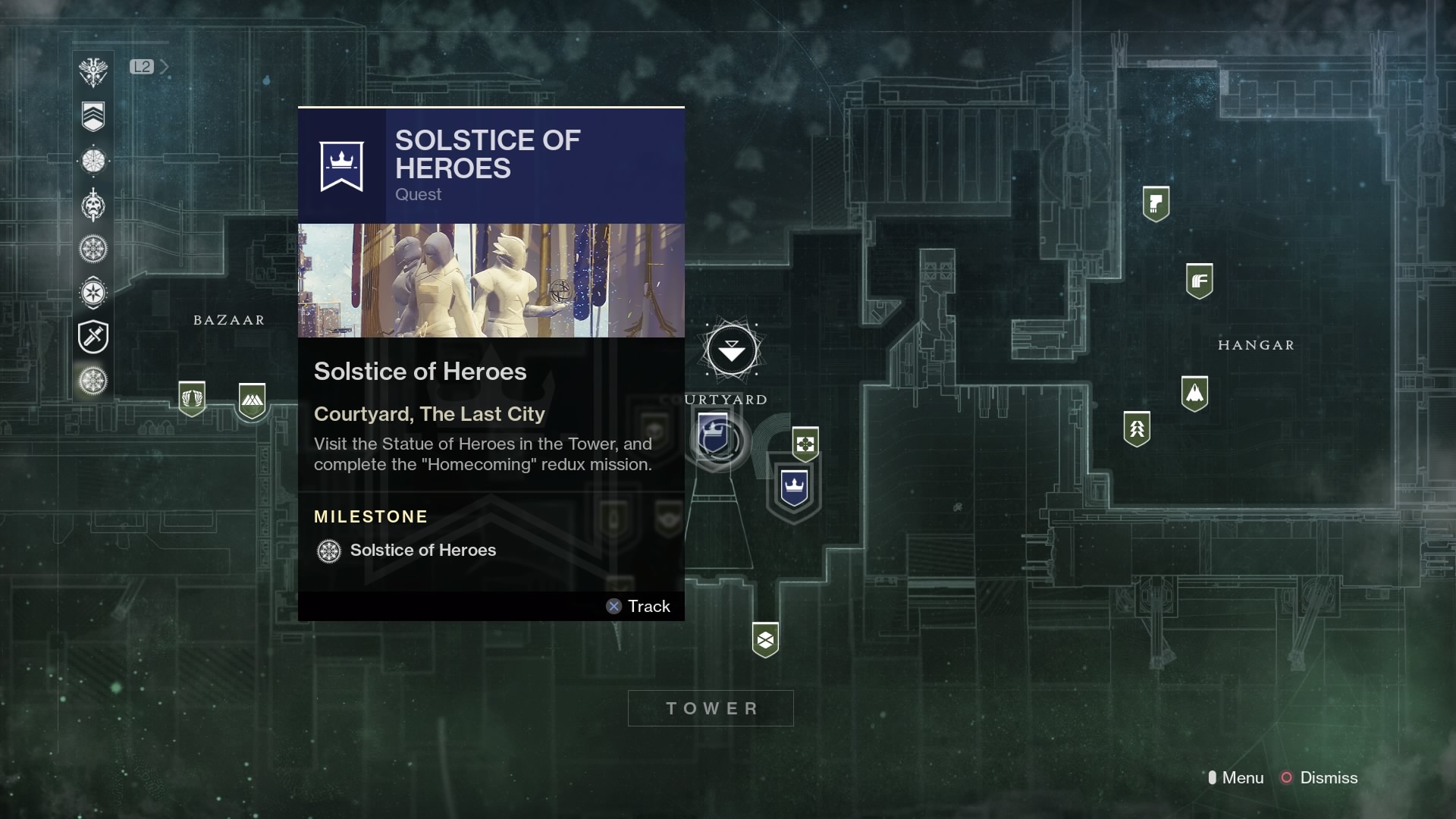 Hold [Square / X] to “Reflect on the Past” at the Solstice of Heroes statue in the Tower. That will begin your quest, and reward you with the lowest tier of the special Solstice armor set. You’ll transport to a city street — run down to find Ikora and use the terminal to begin the “Homecoming” mission. These are special, hard difficulty versions of old story missions.