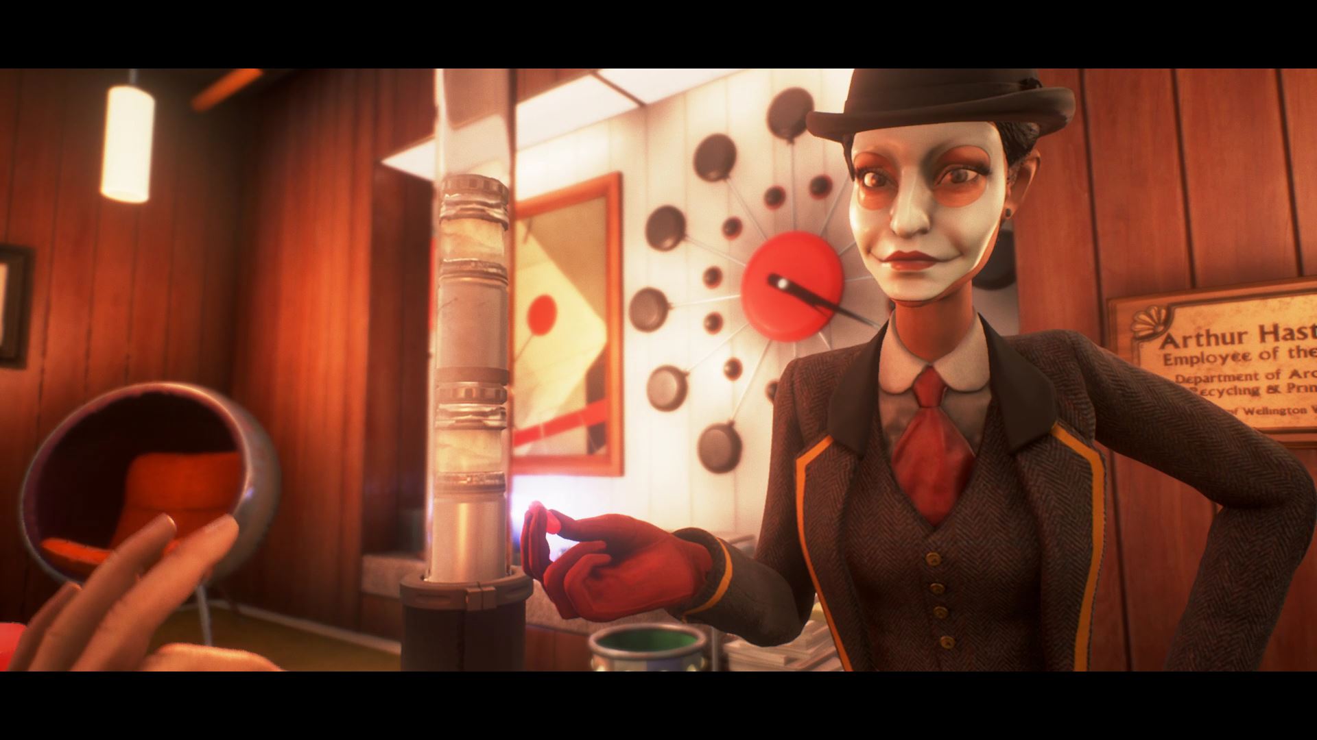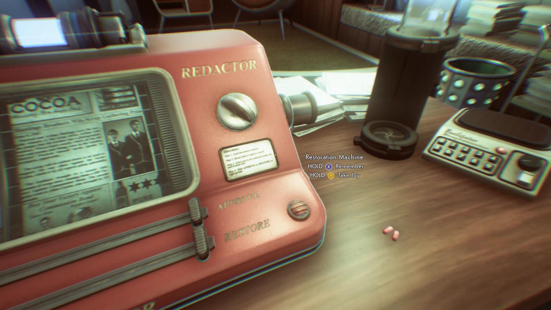 You can either take your Joy pill, or throw it away. Joy isn’t just a narrative device, it’s also a gameplay mechanic. Taking joy makes you harder to detect in Wellington Wells.