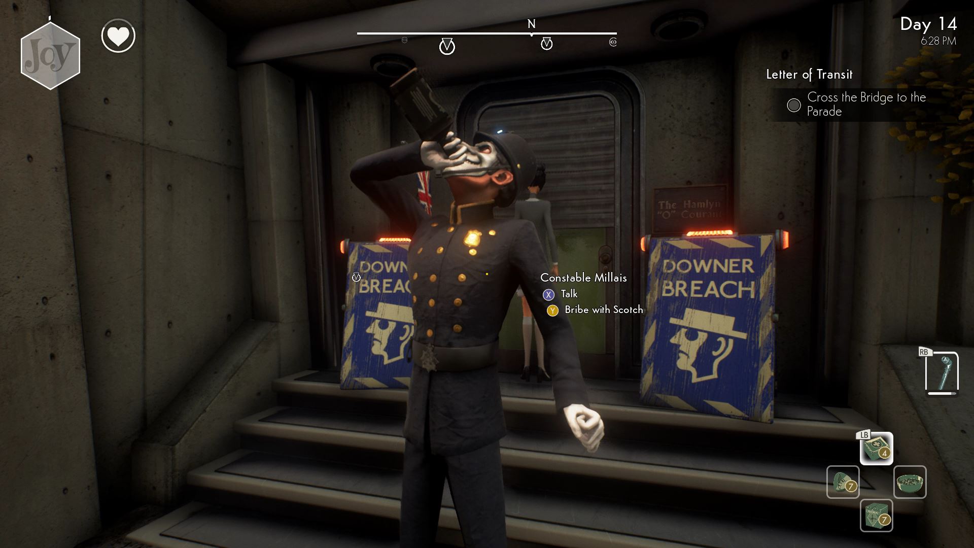 Go to the newspaper office in St. George’s Holm — after escaping Haworth Labs, you’ll find that the entire office has been closed down. The front door is barred, and a Bobbie is posted there. To get inside, bribe the Bobbie with scotch and you’ll be able to easily enter safely.