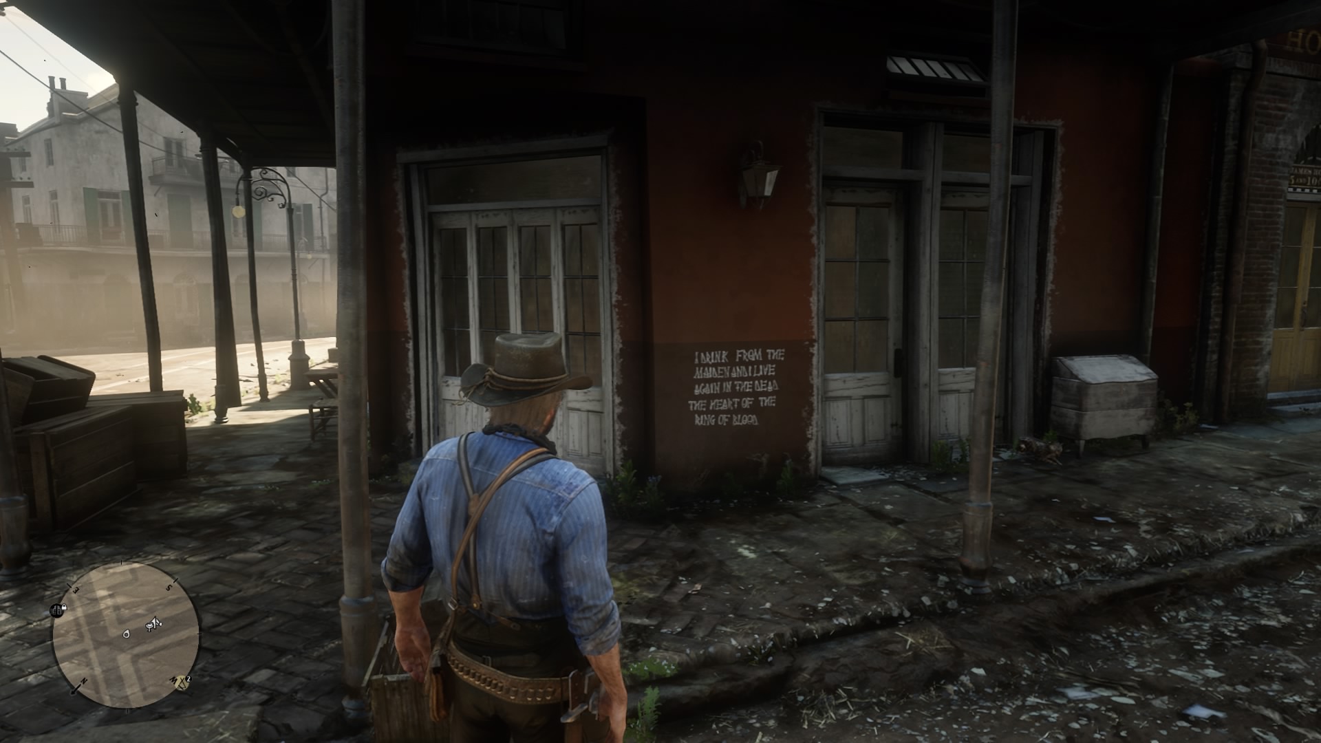 After finding all five scrawlings and adding them to your journal, you’ll draw a map of the area. The vampire will now spawn south of the church, down an alley. Wait three days, then return at night to encounter the vampire. He may or may not appear — sleep at the large saloon and check the alley south of the church, shown on your pentagram map. If the kids are not in the alley, the vampire will spawn.
