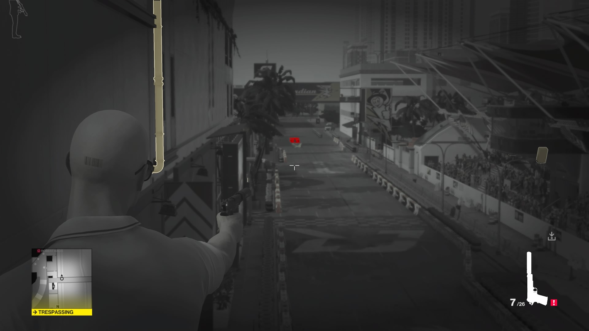 From this walkway, you can kill Sierra Knox and Robert Knox. While Robert Knox is walking to repair the antennae, shoot Sierra Knox’s racecar with your silenced pistol. You don’t need perfect aim. Hit the vehicle enough, and it will crash. No Sniper Rifle required.